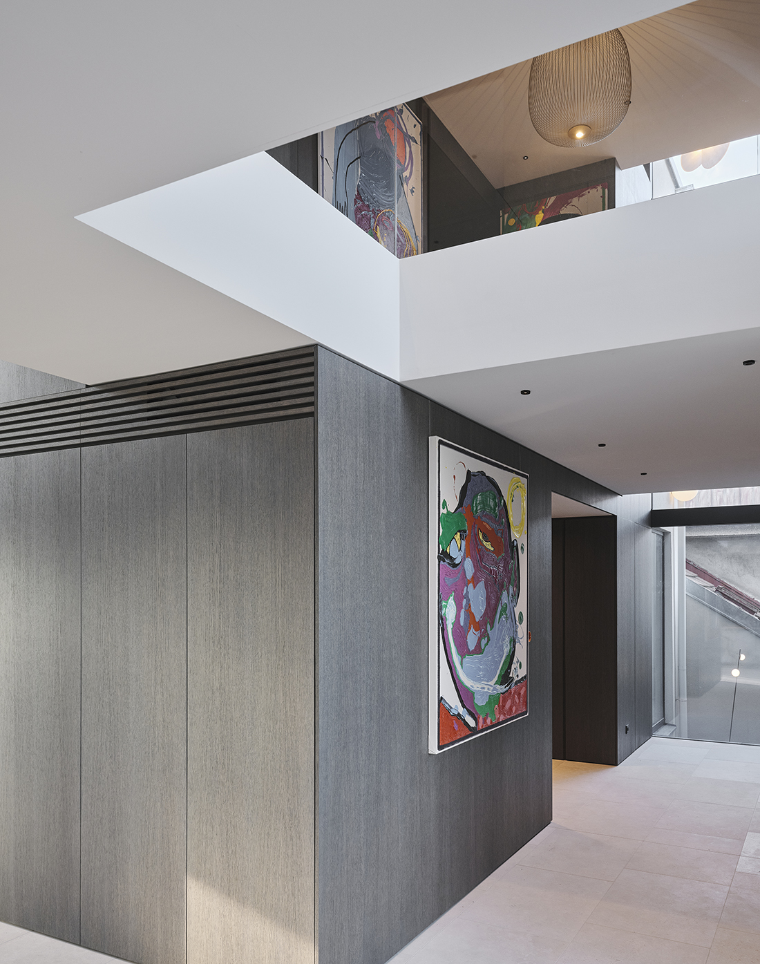 The interior spans three levels, connected by vertical voids that enhance the sense of spaciousness. Public areas, such as the kitchen and lounge, occupy the lowest level, while private children’s rooms with en-suite bathrooms and galleries are situated in another wing. The middle floor includes an office and a wellness area with a sauna and terrace. The top level houses the master suite, featuring panoramic windows, a walk-in closet, and a rooftop terrace with a whirlpool.
