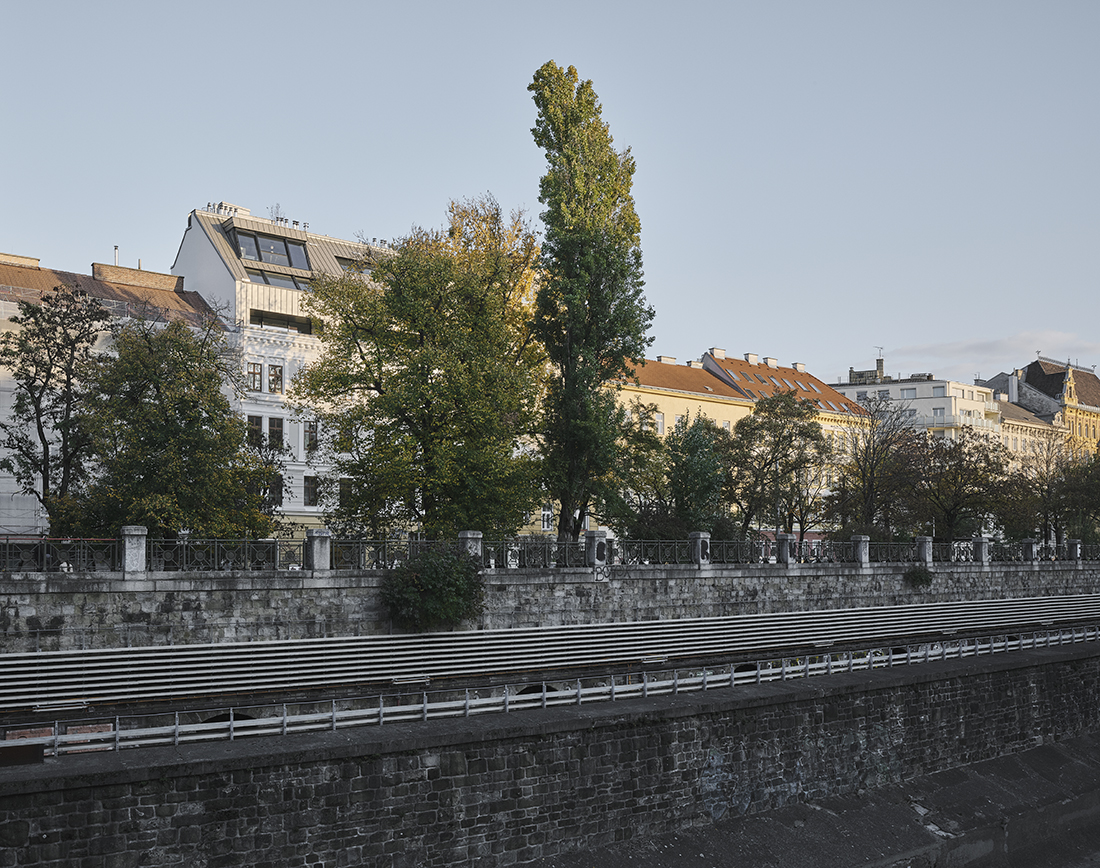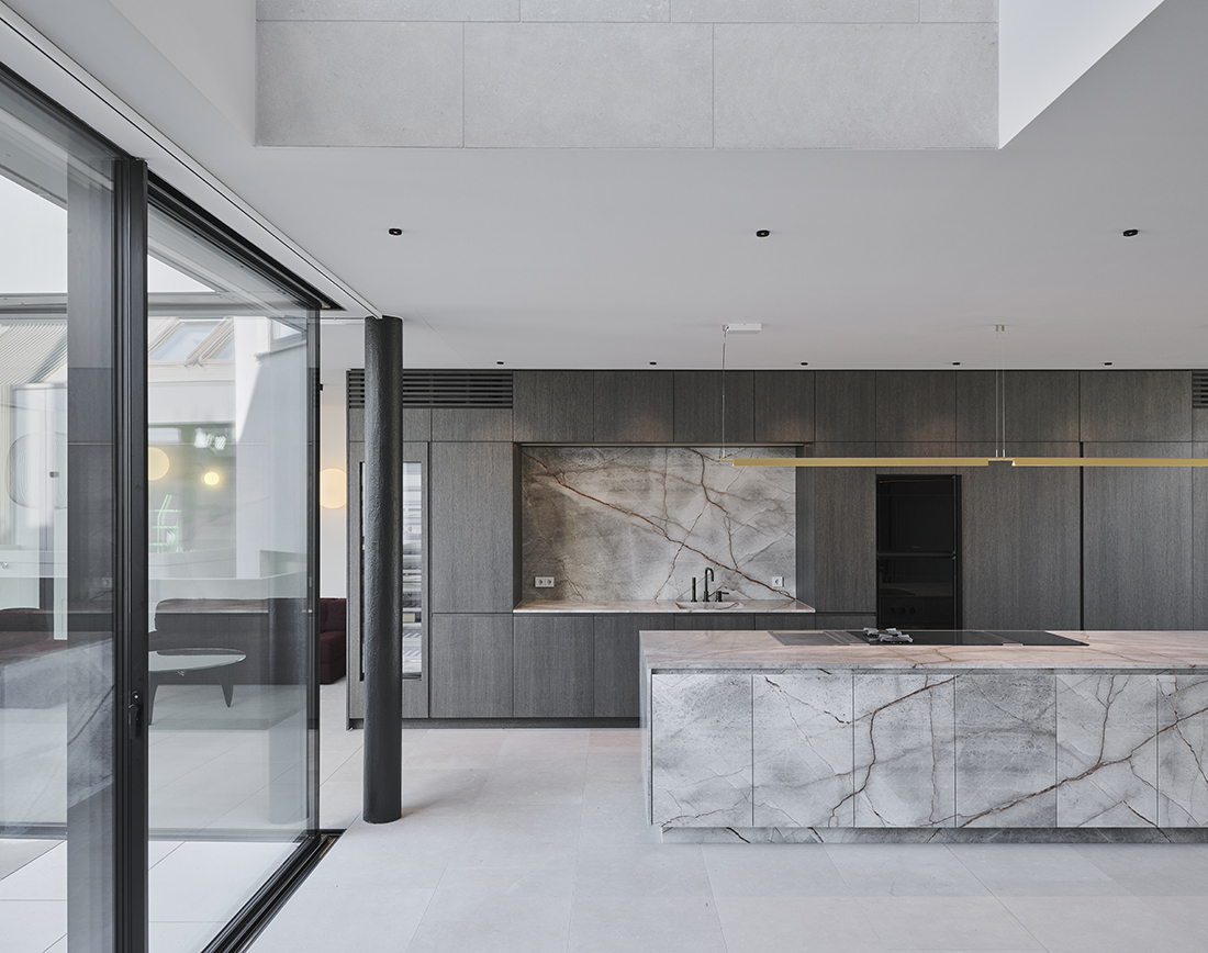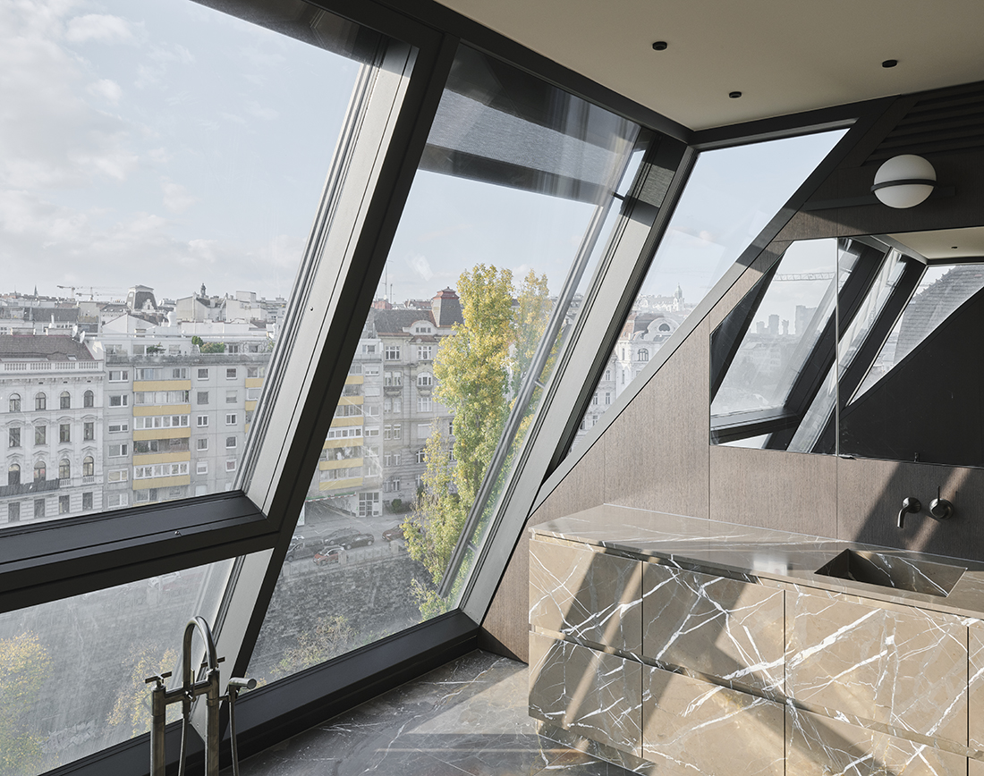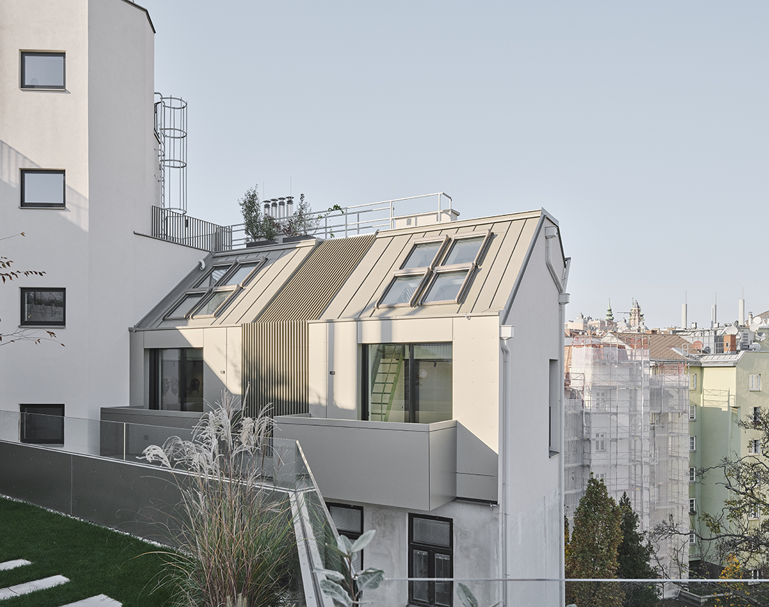 This remarkable three-story villa in Vienna sits atop a historic 19th-century building, seamlessly blending modern design with historical substance. The U-shaped rooftop extension offers expansive views, open perspectives, and generous outdoor spaces, including a rooftop garden with a pool and an orangery for multifunctional use.