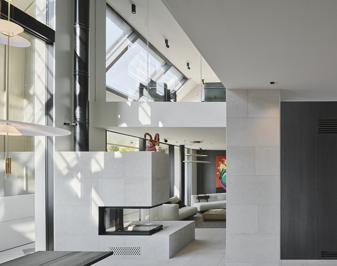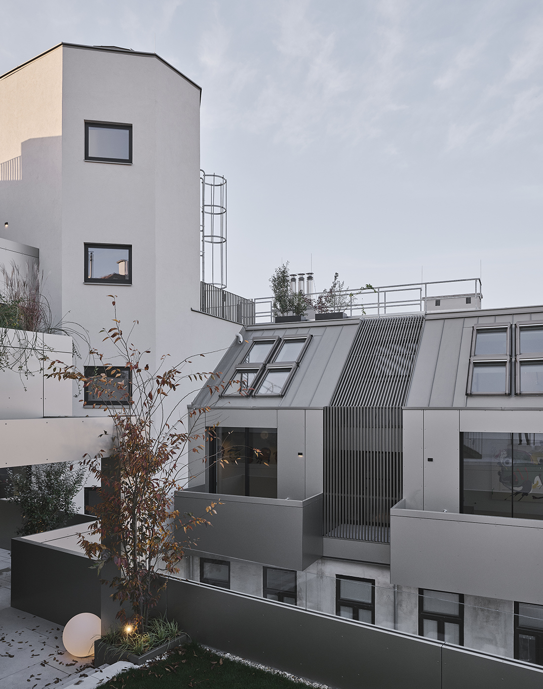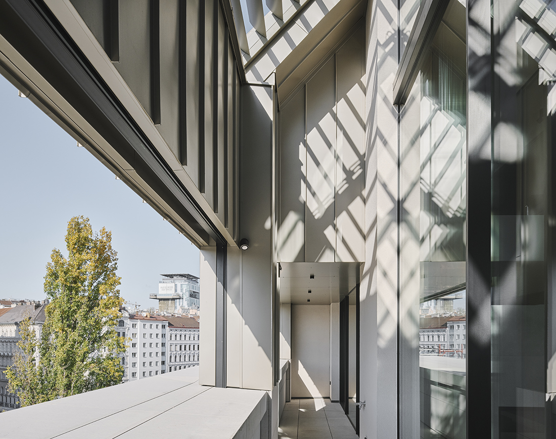 This remarkable three-story villa in Vienna sits atop a historic 19th-century building, seamlessly blending modern design with historical substance. The U-shaped rooftop extension offers expansive views, open perspectives, and generous outdoor spaces, including a rooftop garden with a pool and an orangery for multifunctional use.