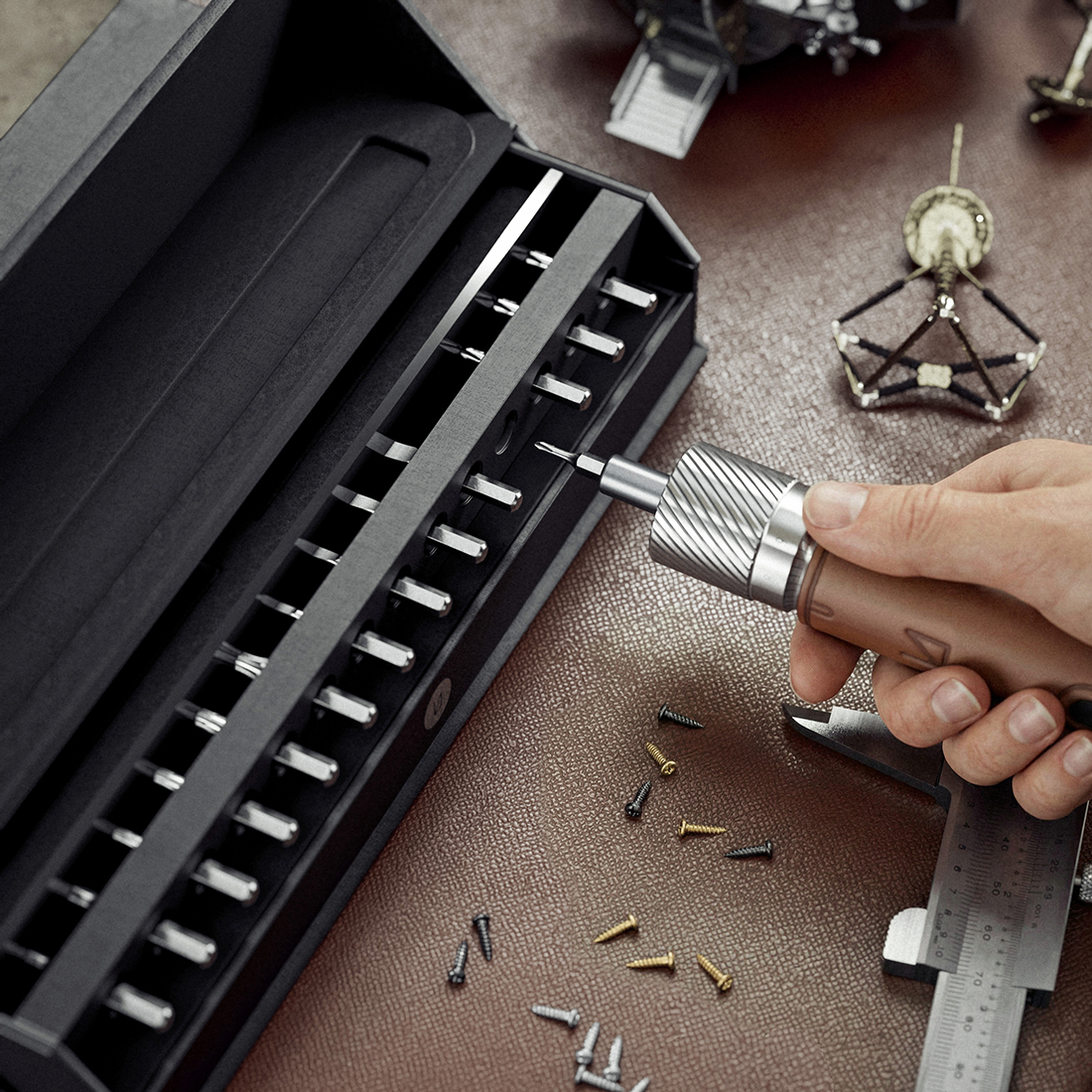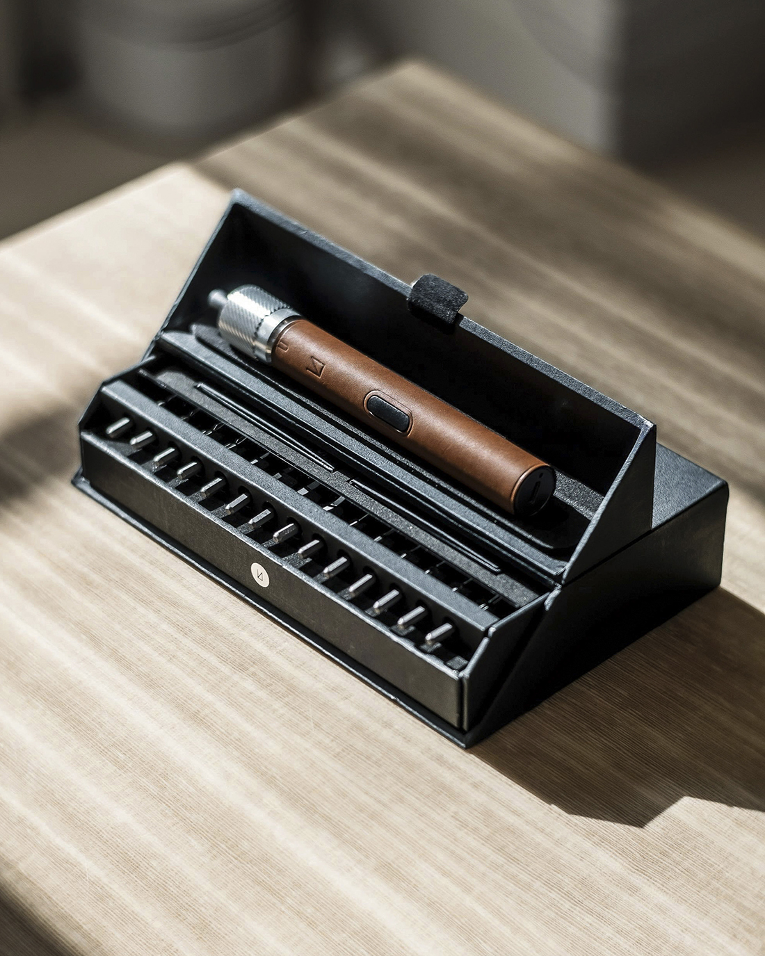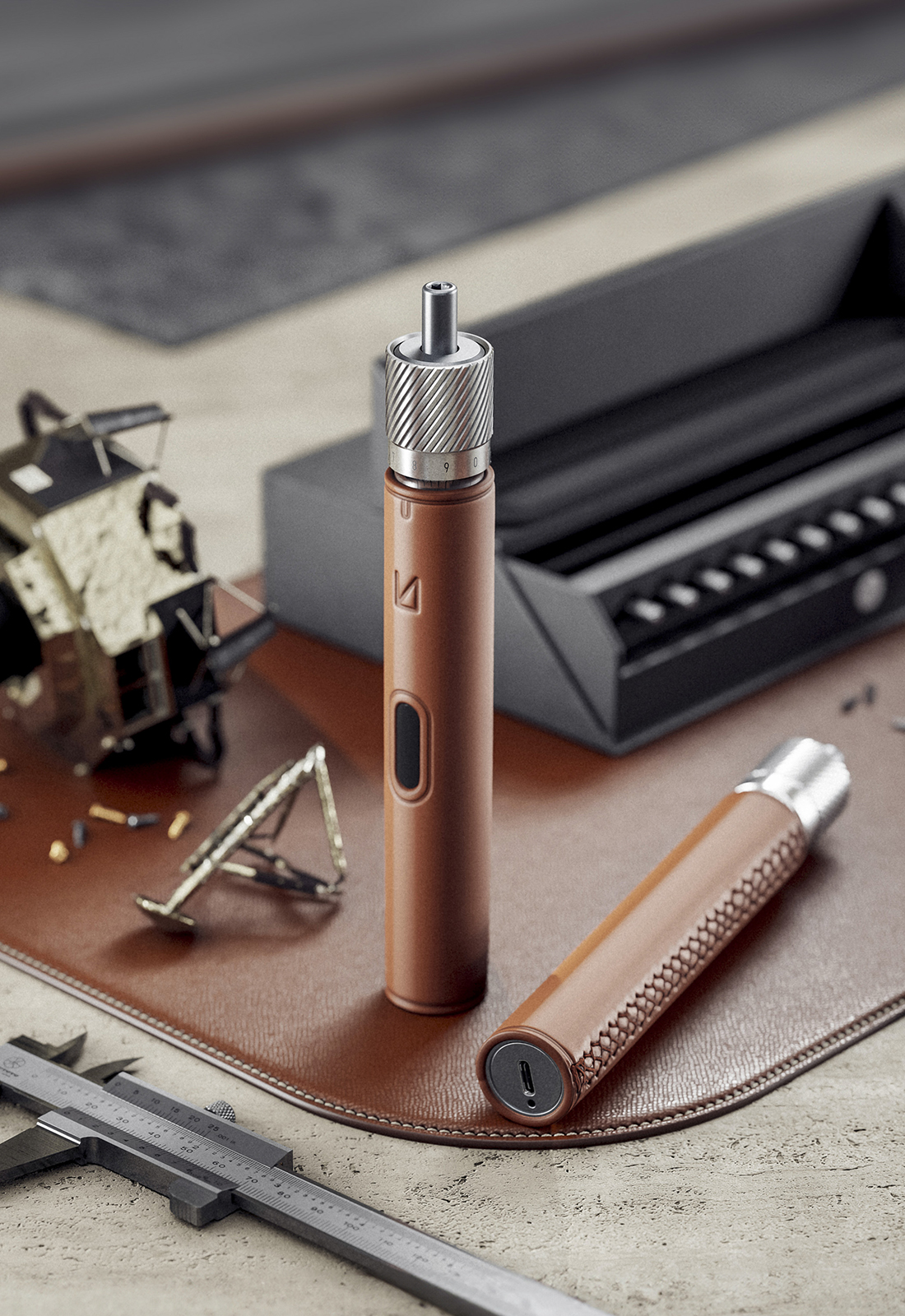 The Rota-Master Precision Electric Screwdriver redefines efficient workflow, seamlessly blending ergonomics, aesthetics, and efficiency. Its design features a hand-stitched, full-grain leather grip, topped with an aerospace-grade aluminum collar, and packaged in a tool-case box with a quick-release bit holder system, embodying both craftsmanship and innovation.