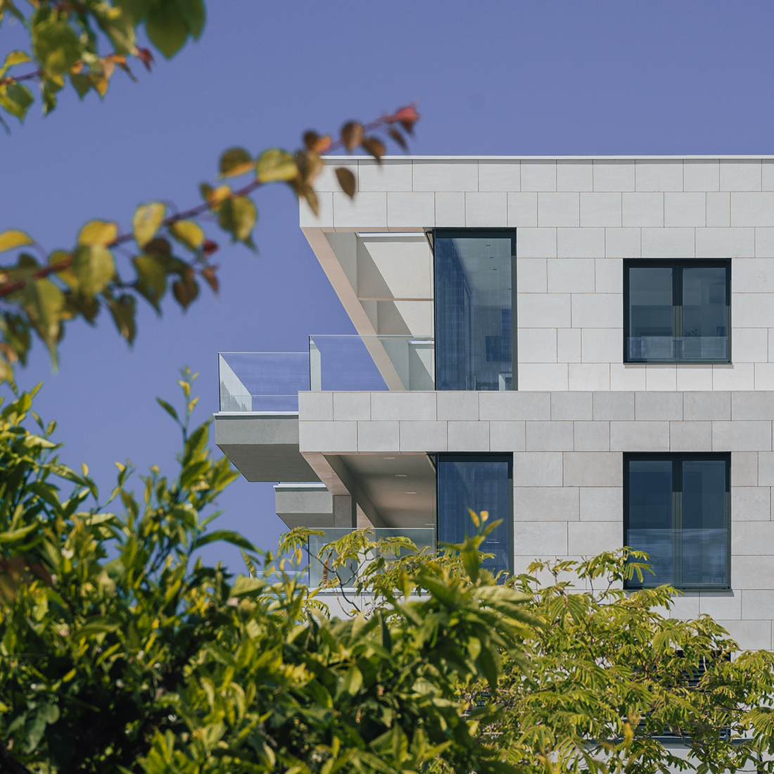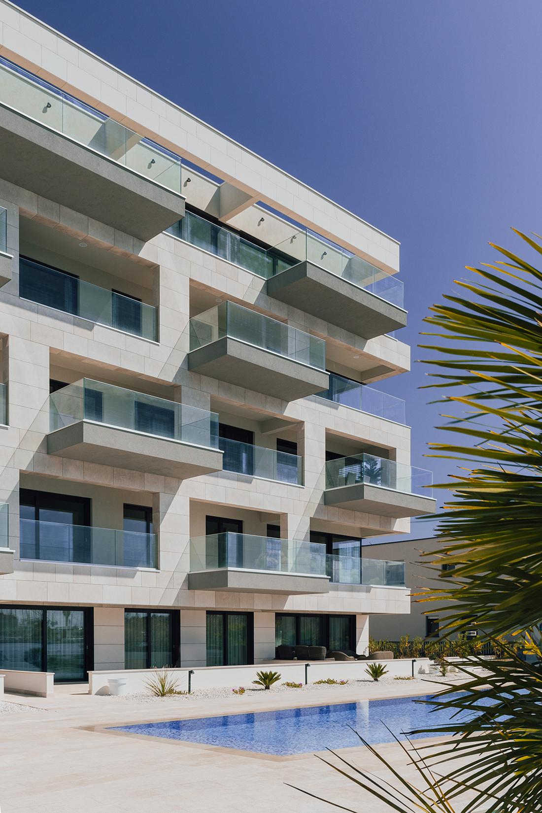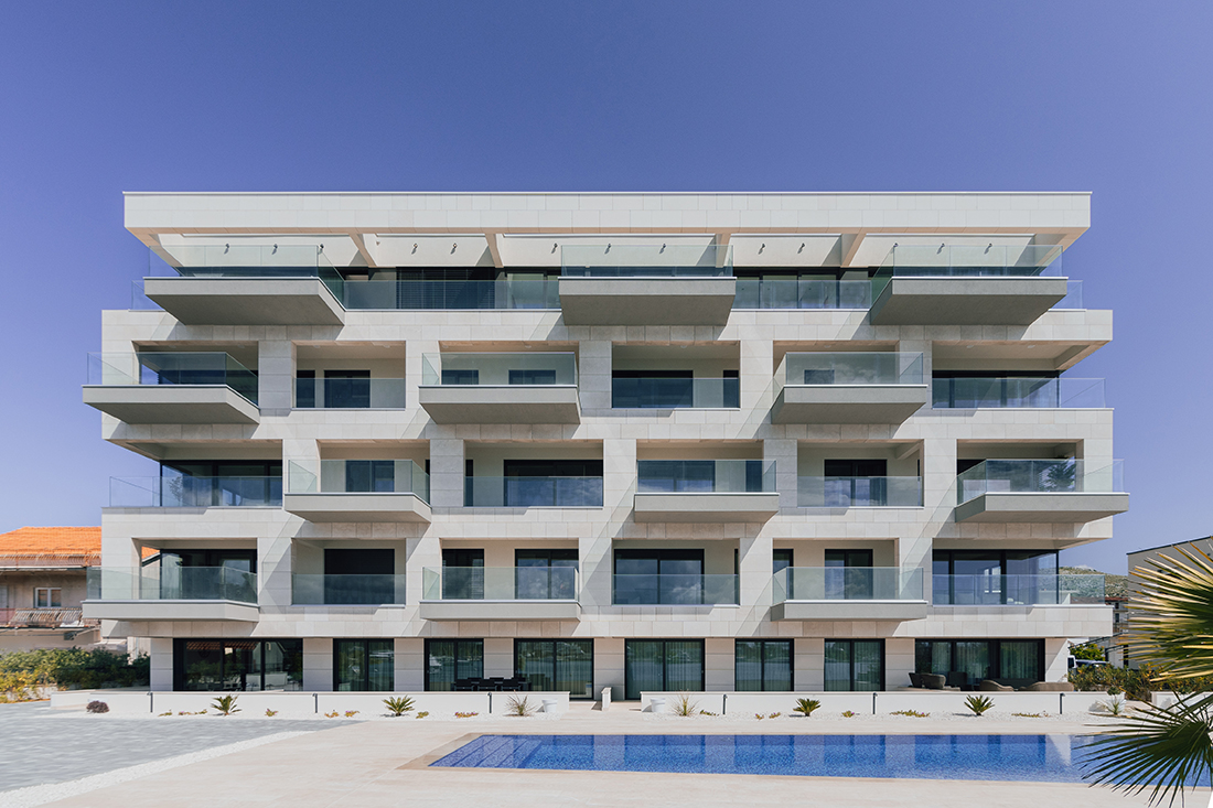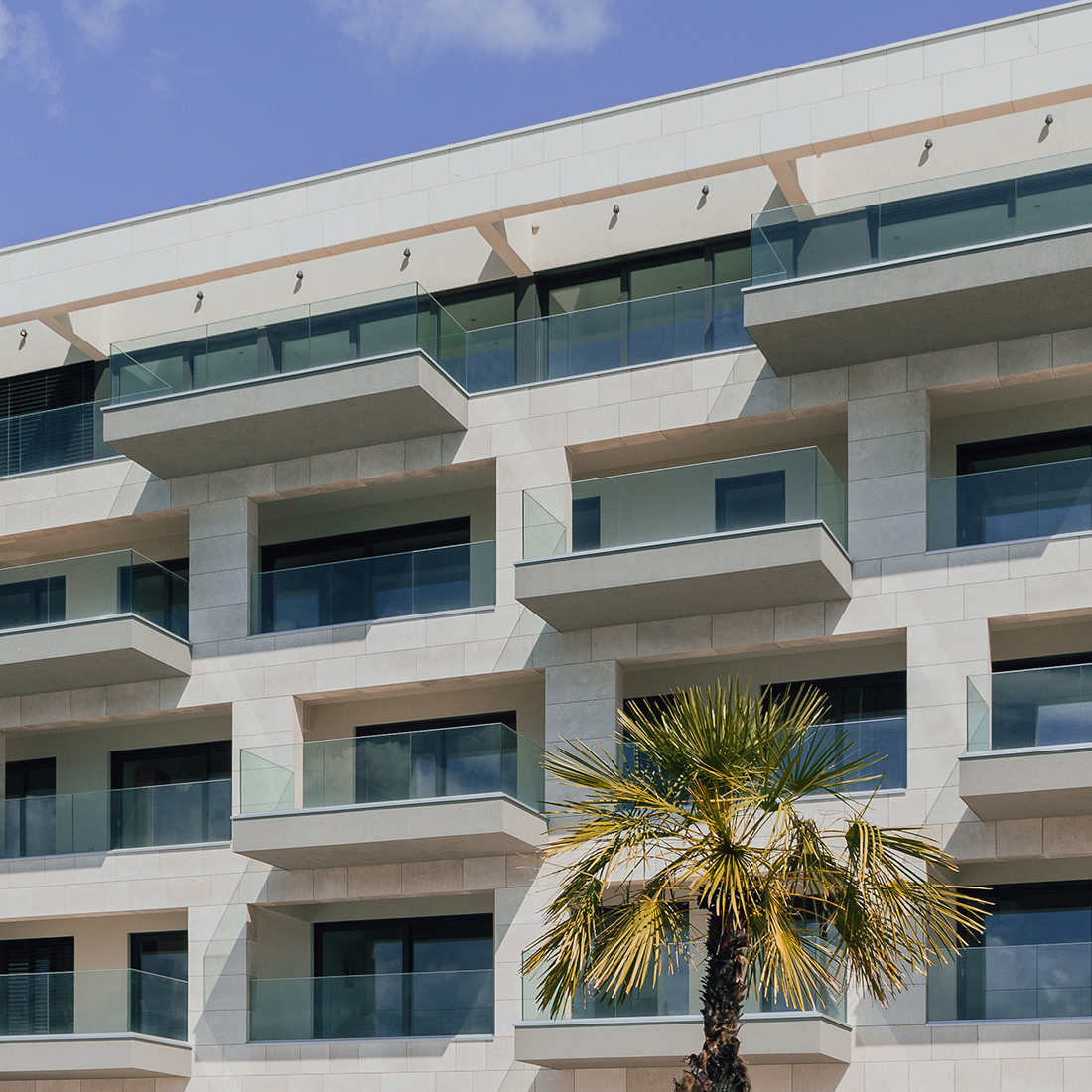 The building’s sleek, geometric façade features rhythmic openings and cantilevered balconies, striking a balance between aesthetic elegance and functional shading. High-quality materials, including light-colored stone cladding, were selected for their durability and ability to reflect Mediterranean light, enhancing the building’s modern yet timeless appearance.