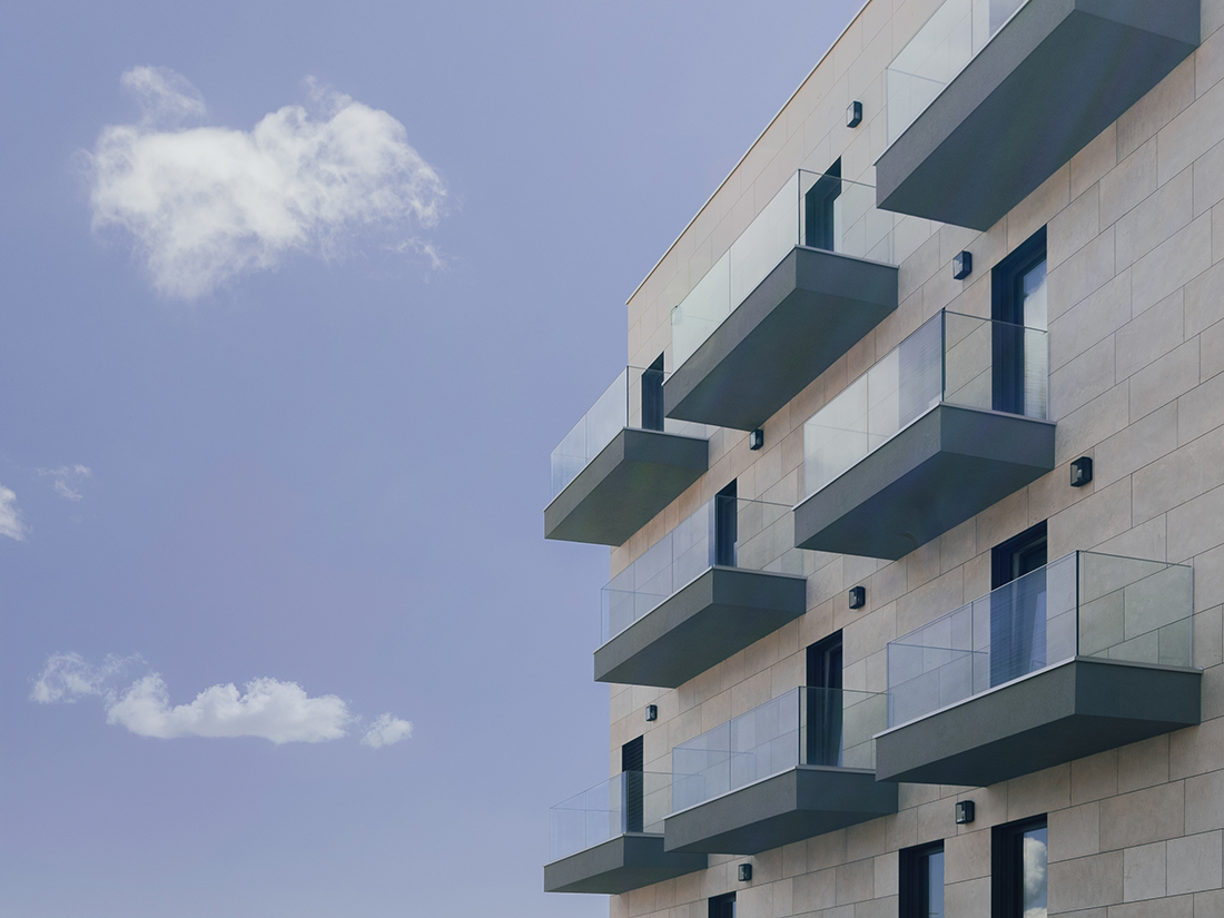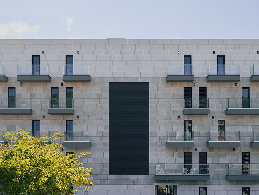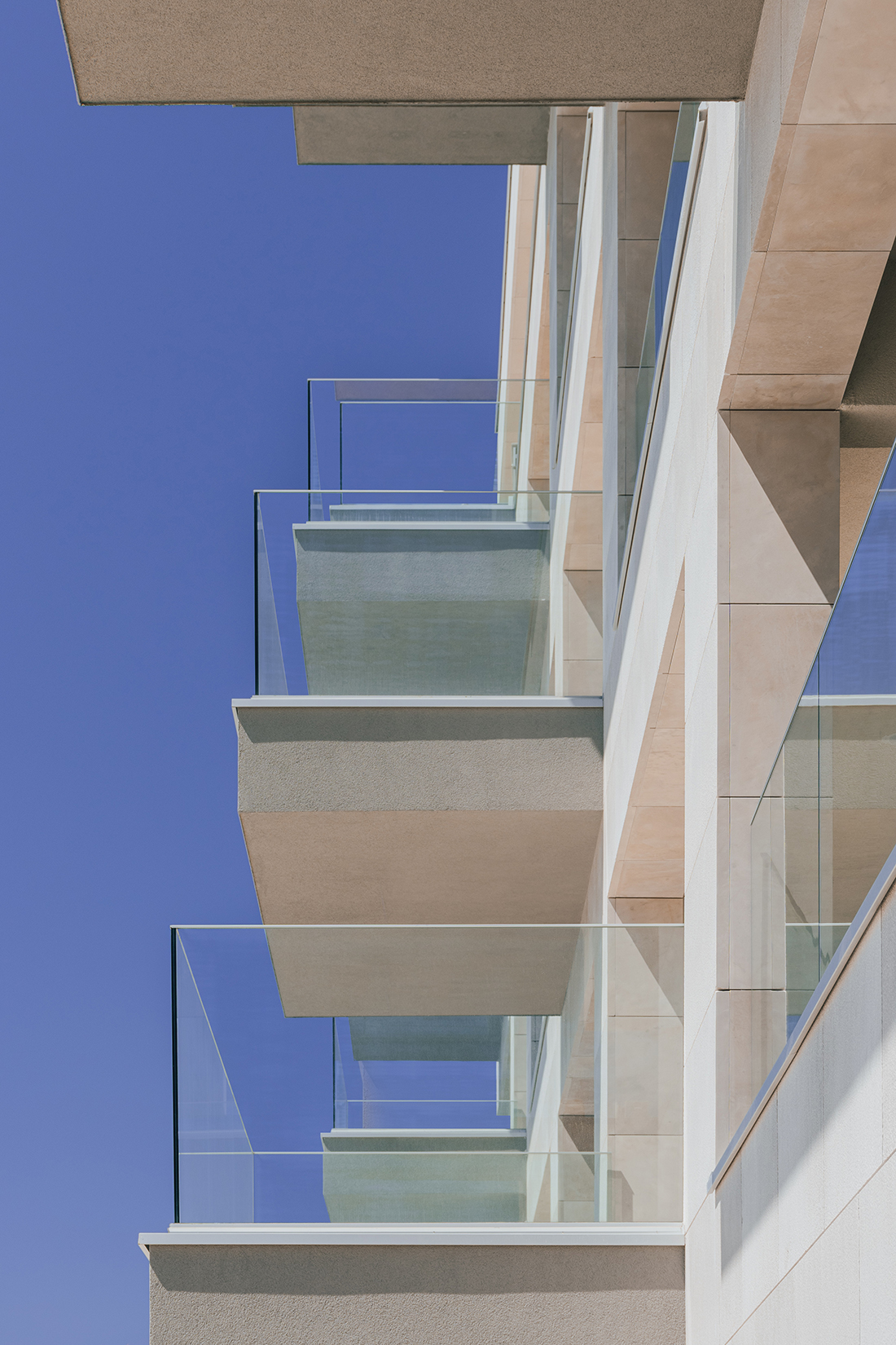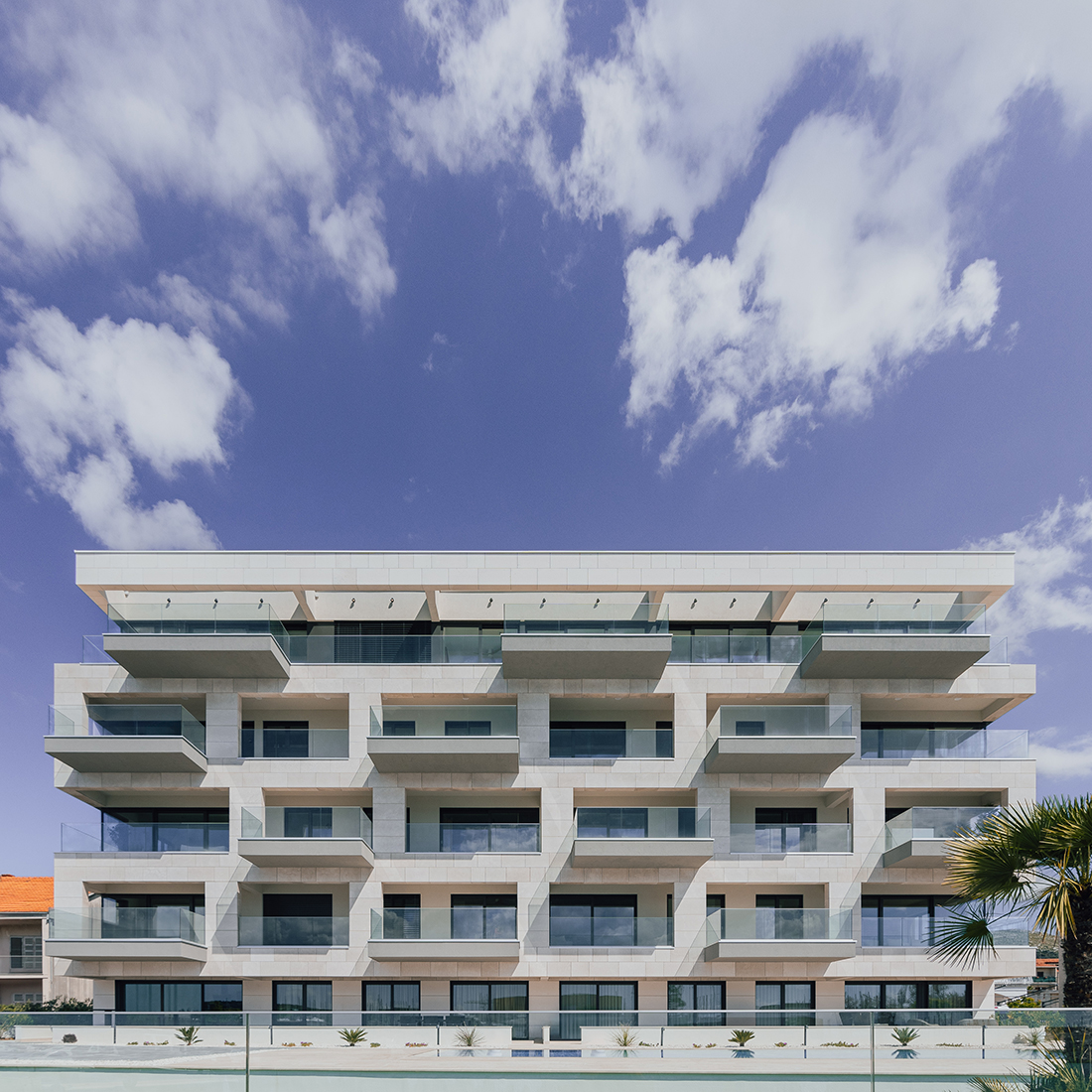 The building’s sleek, geometric façade features rhythmic openings and cantilevered balconies, striking a balance between aesthetic elegance and functional shading. High-quality materials, including light-colored stone cladding, were selected for their durability and ability to reflect Mediterranean light, enhancing the building’s modern yet timeless appearance.