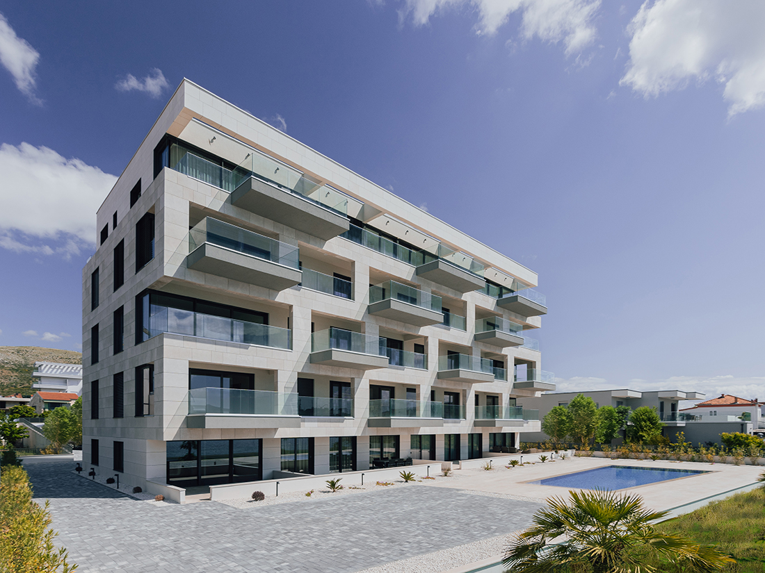 The residential building in Seget is designed to capitalize on its coastal location, with all 18 apartments oriented south to provide unobstructed views of the Adriatic. Each unit includes loggias and balconies, offering private outdoor spaces that visually extend the interior and foster a connection with the surrounding environment.