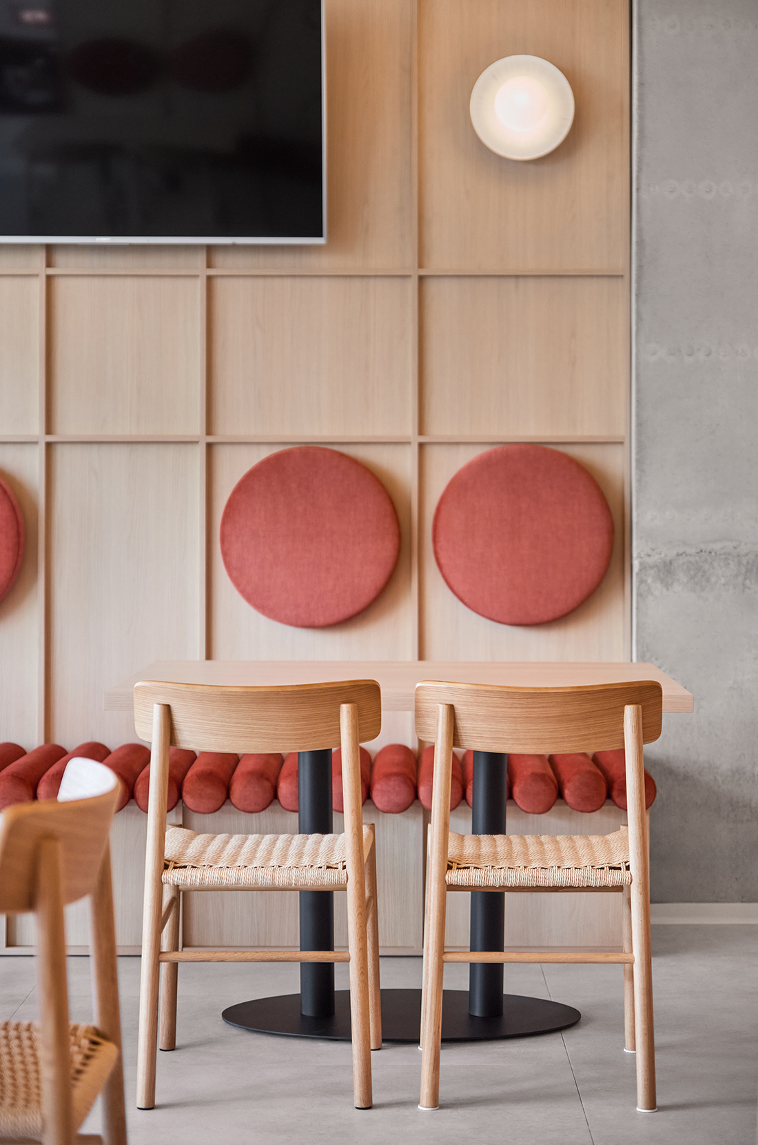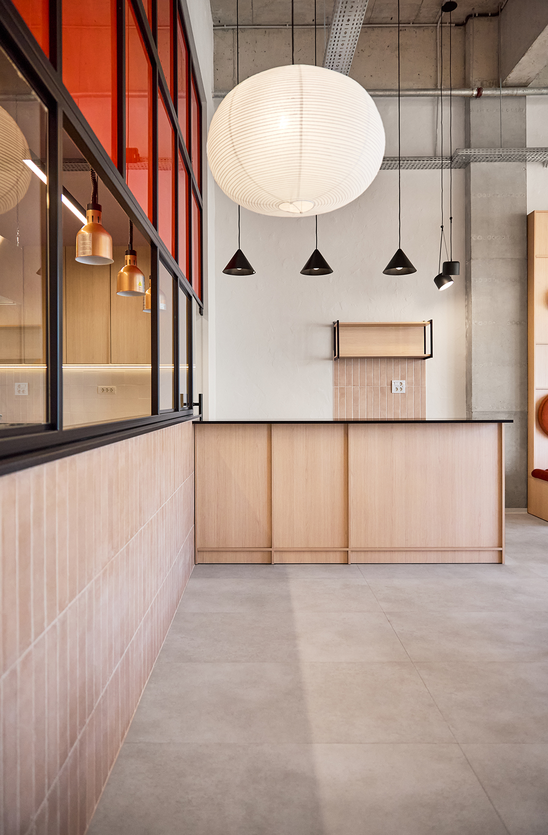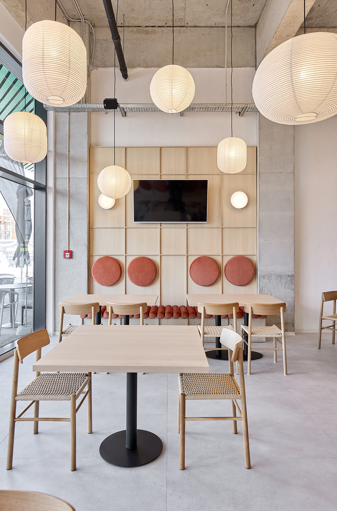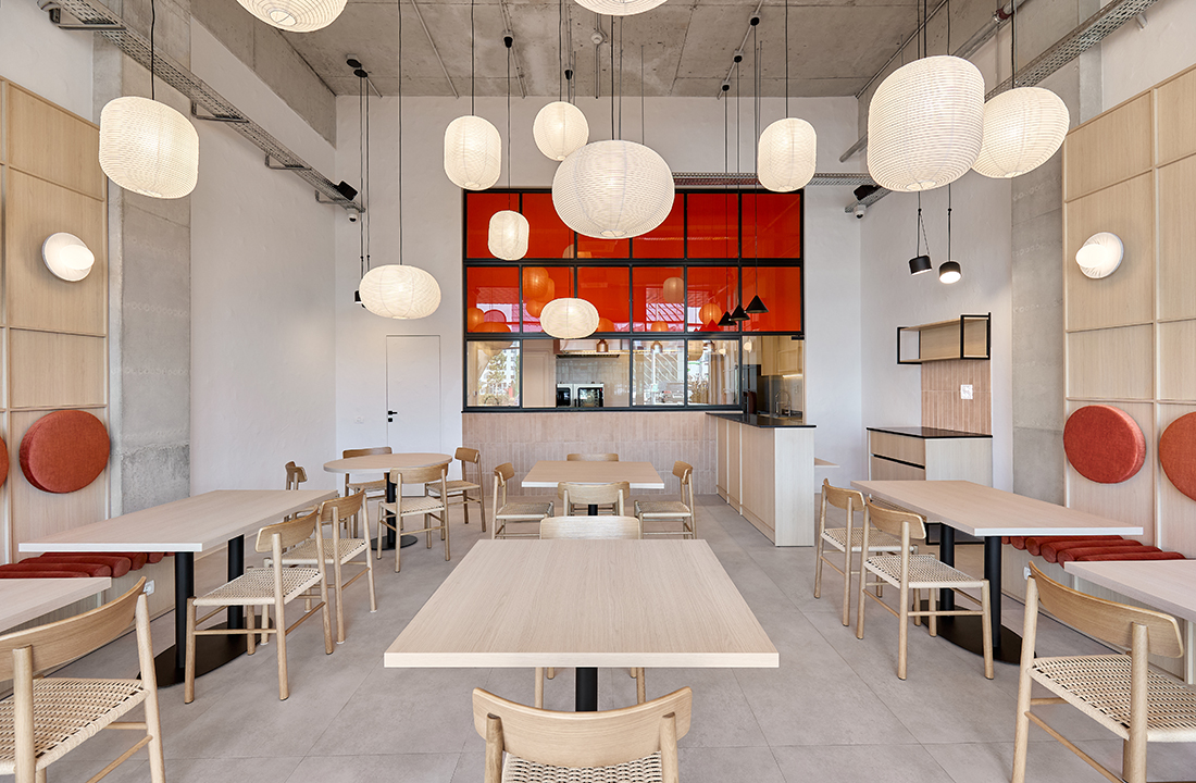 The exposed concrete surfaces and discreet brick inserts resume the robustness of vernacular constructions, without becoming a purely decorative imitation. The Romanian motif filtered. The graphic details appear controlled: a wallpaper with a stylized folk pattern animates the sanitary groups, and in the main hall, the rhythm of the light wood panels and the circular seats upholstered in brick suggest traditional geometric motifs, retold in a modern language. Functional + honest: The light wood furniture privileges the functionality and tactility of the material. The bar and kitchen are cut out by black metal and glass joinery, allowing a direct visual relationship with the preparation of the menu, and adding a touch of discreet scenography. Lighting scenarios: The globe and cone pendants, made of white paper or black metal, are arranged seemingly randomly and define the dining areas through a warm, continuous rhythm. The light settles softly on the raw textures, amplifying the friendly atmosphere.