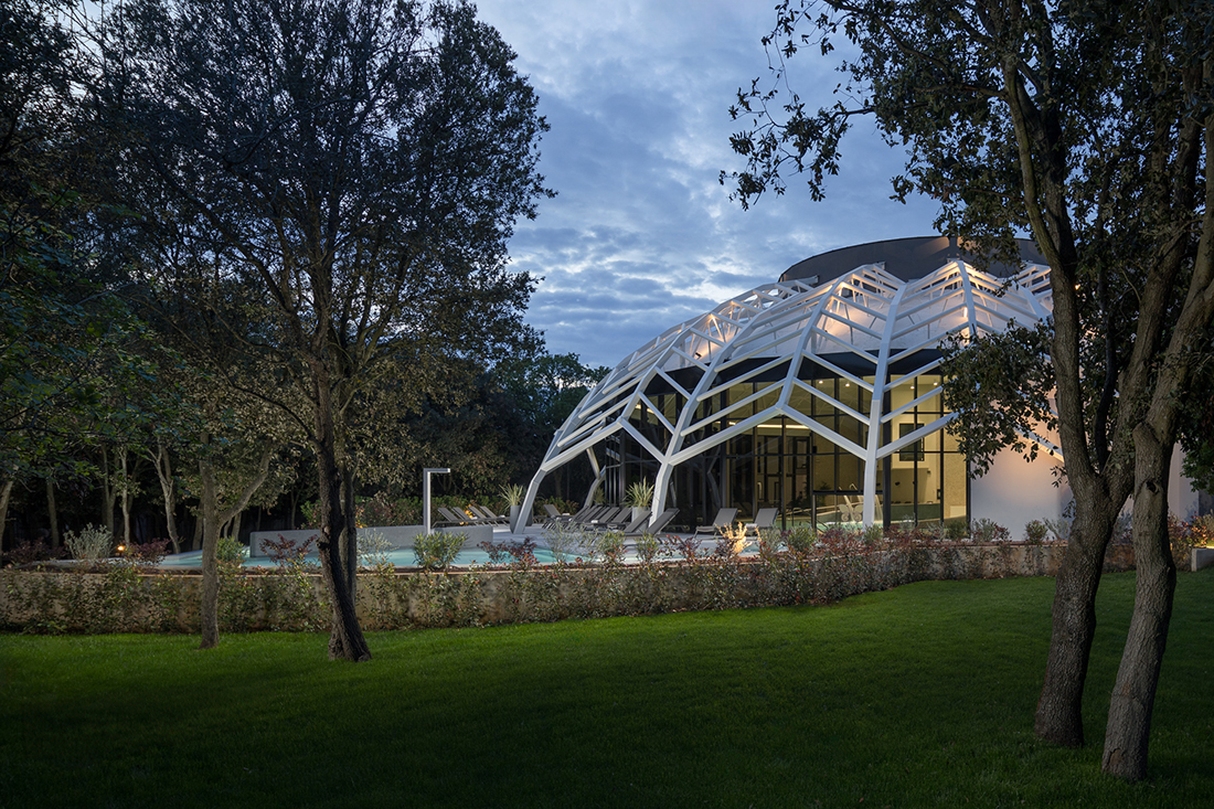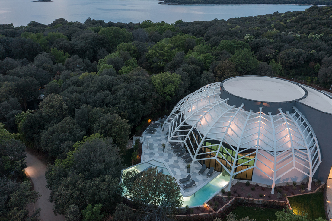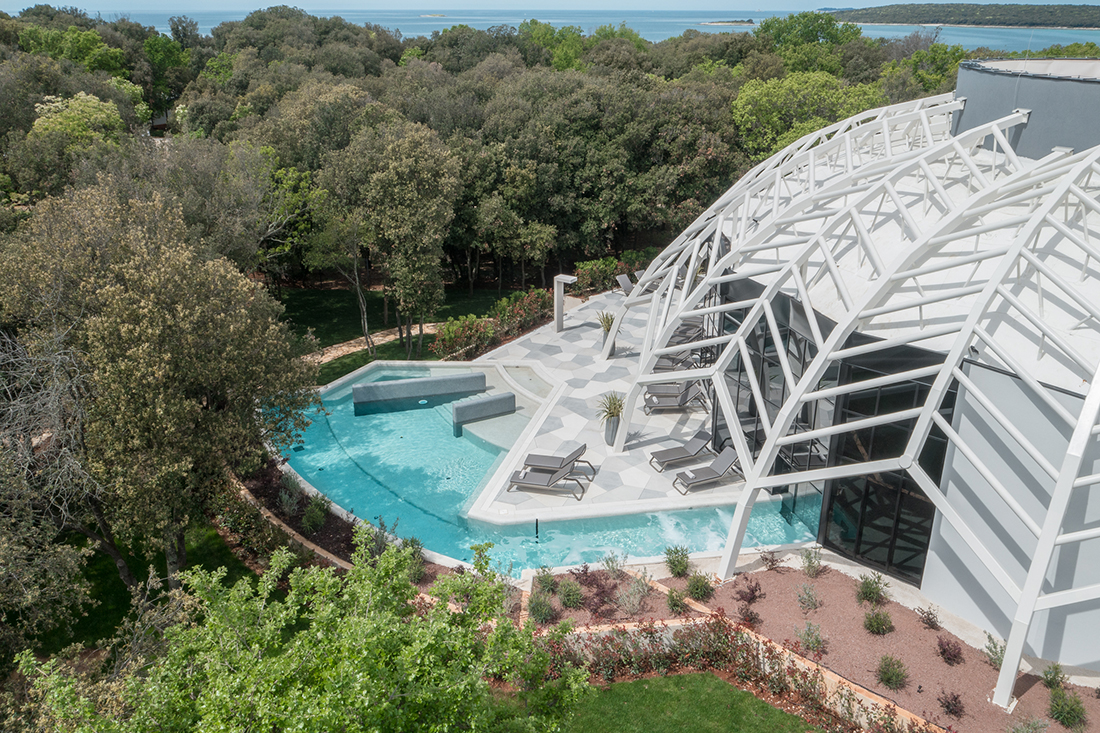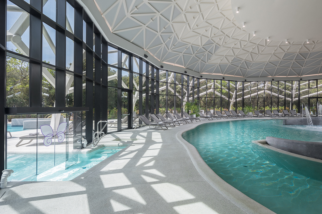 The wellness complex features saltwater pools, a full spa program, fitness facilities, and other wellness amenities. The steel dome, a highlight of the design, comprises over 3.000 uniquely crafted panels, varying in size and form, exemplifying structural innovation and architectural precision.