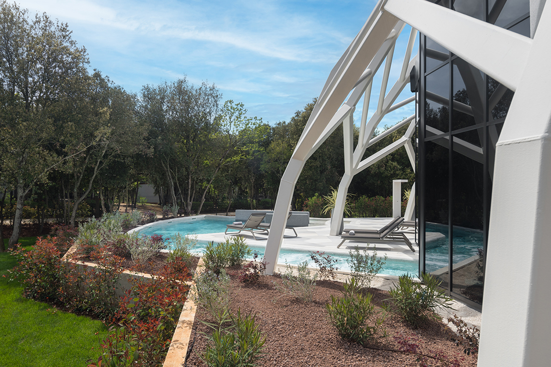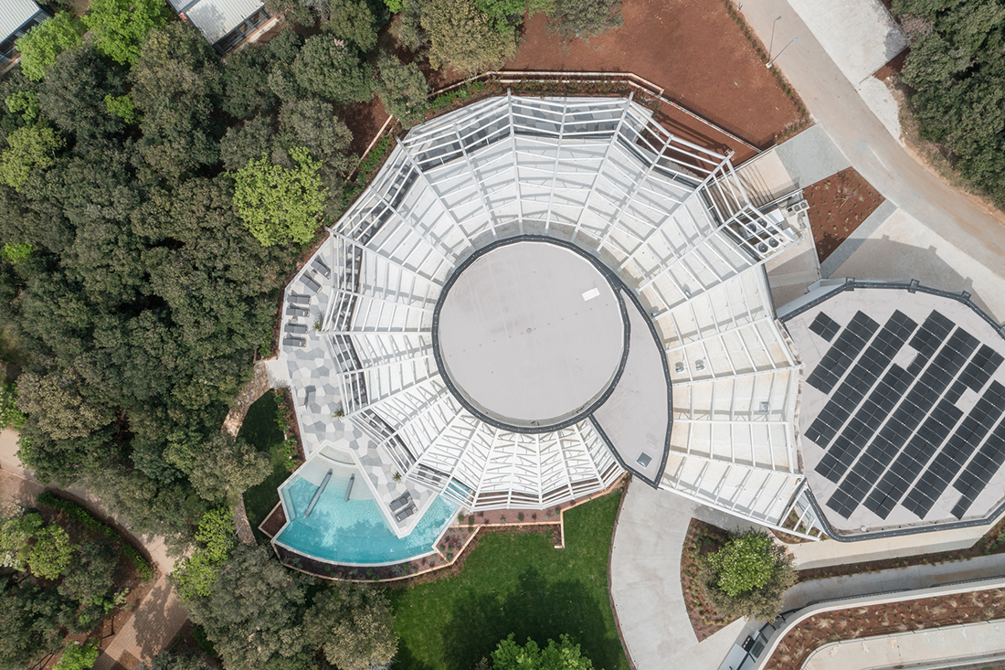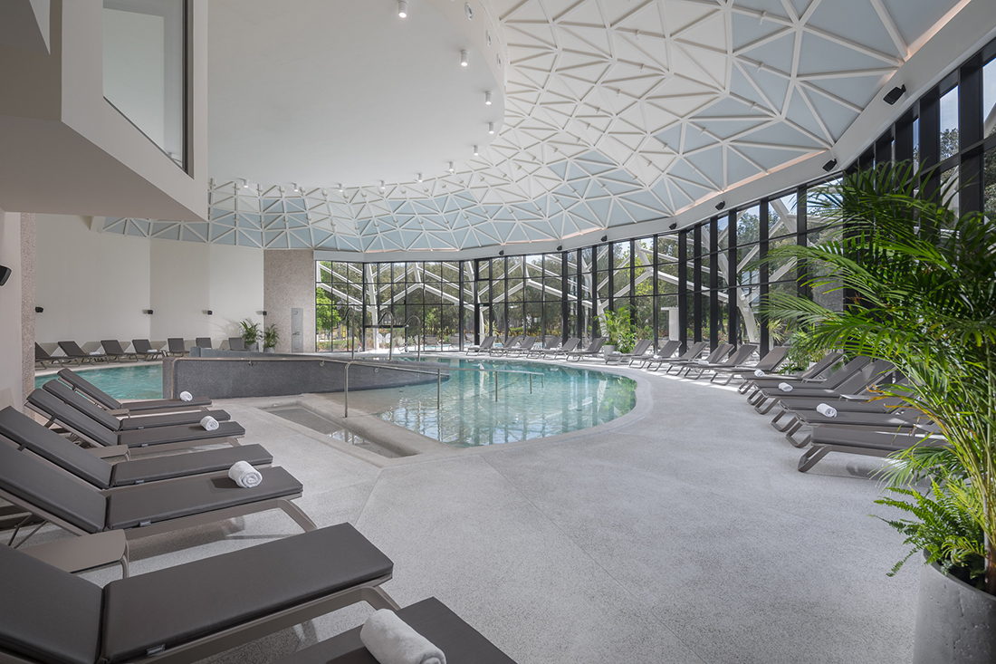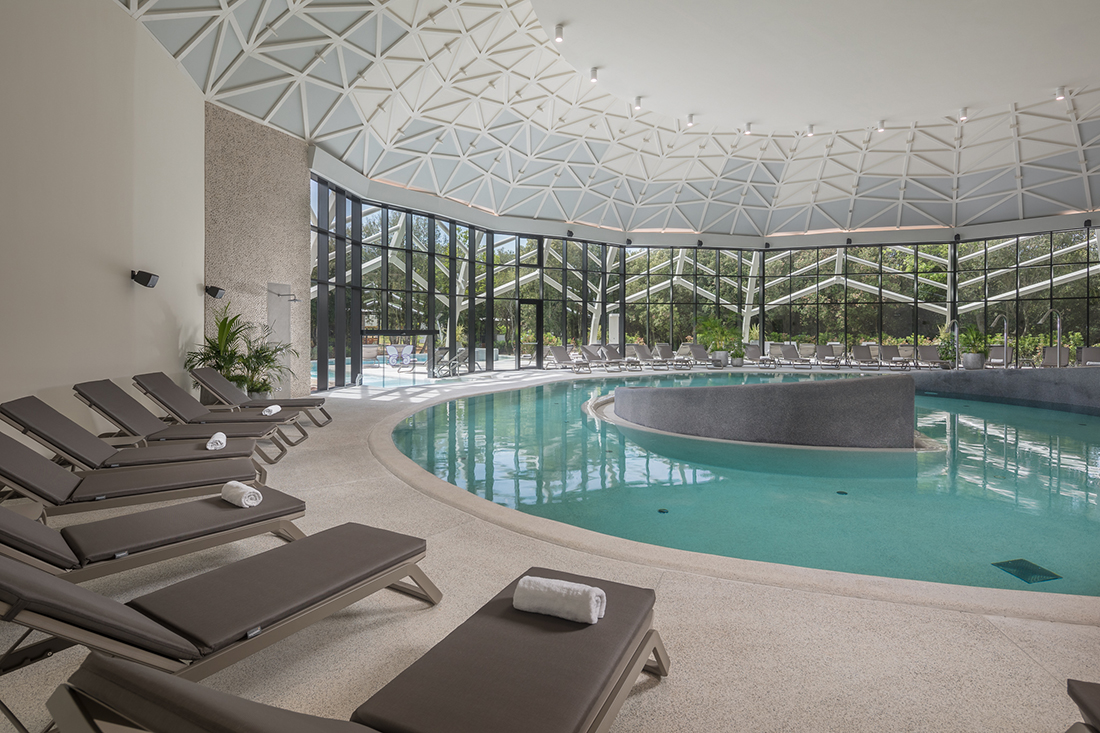 The wellness complex features saltwater pools, a full spa program, fitness facilities, and other wellness amenities. The steel dome, a highlight of the design, comprises over 3.000 uniquely crafted panels, varying in size and form, exemplifying structural innovation and architectural precision.