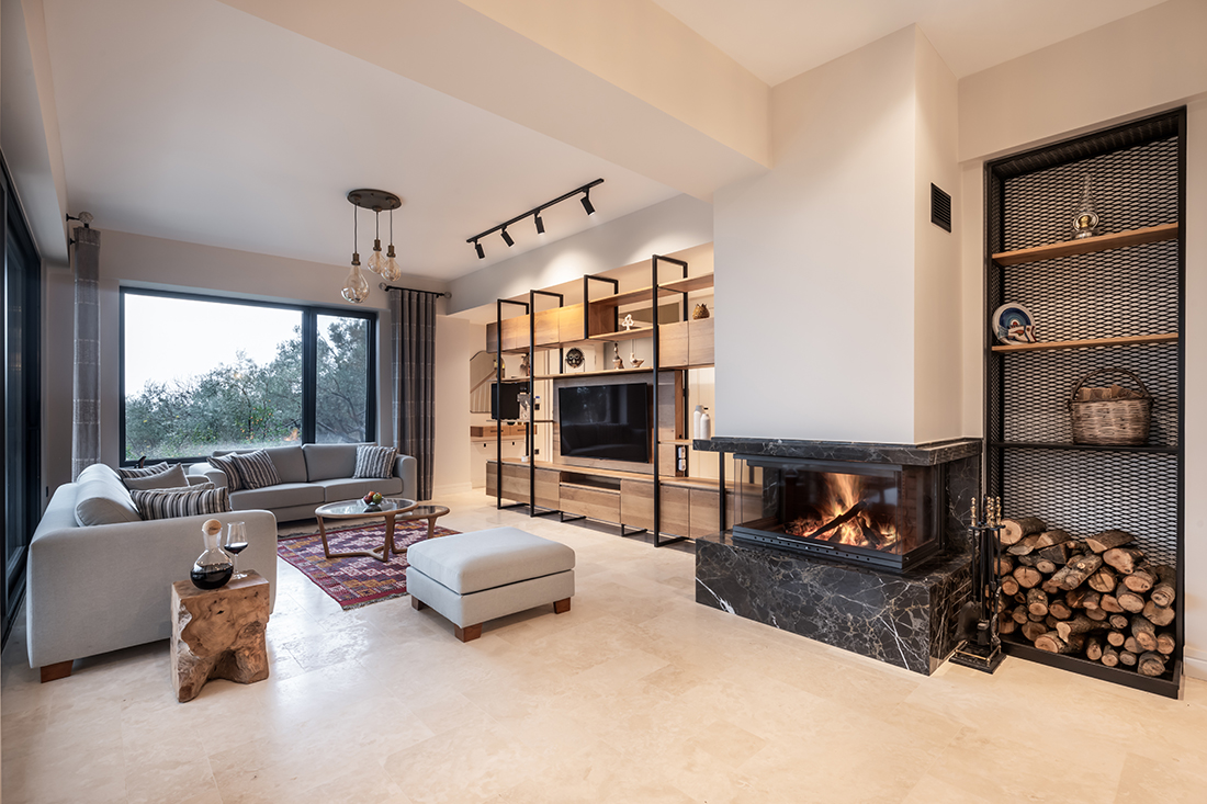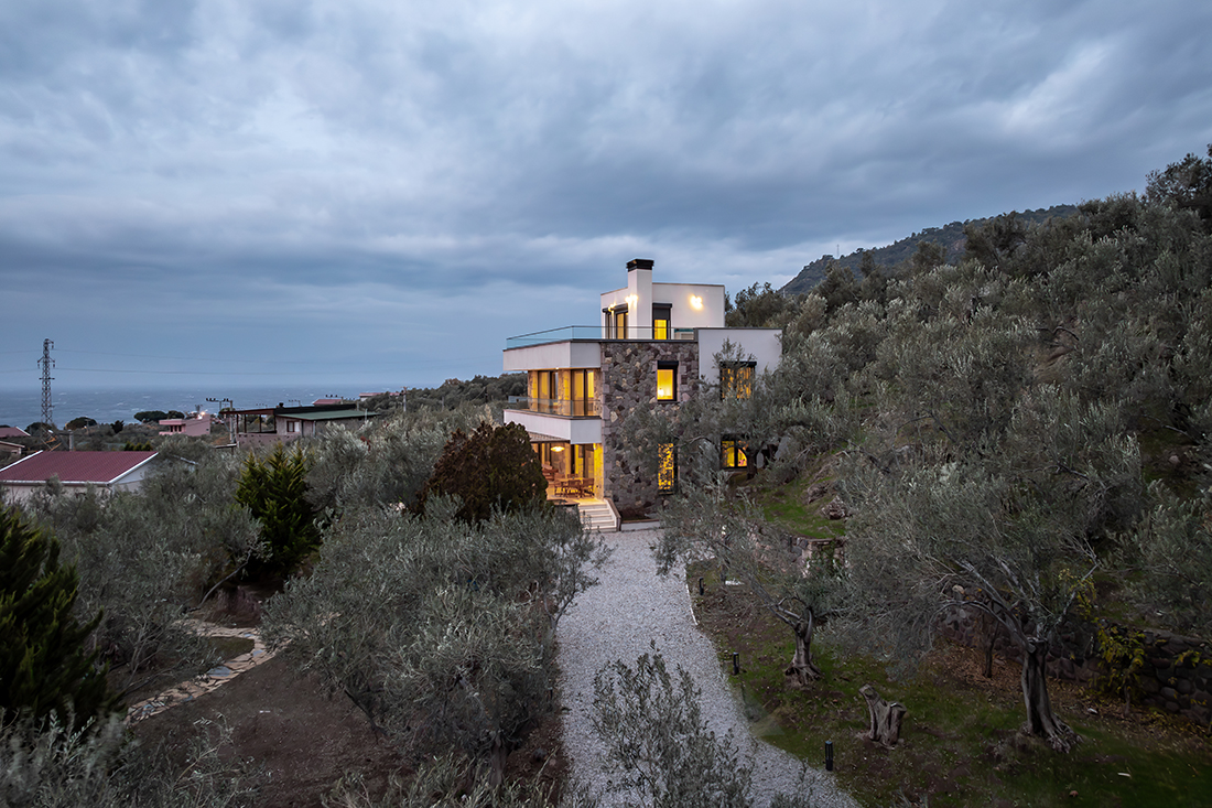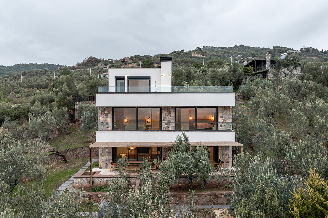 Stones salvaged from abandoned village houses shape the front façade, while the remaining façades are finished with stucco for balance. The ground floor includes living areas defined by natural oak, green tones, and travertine flooring. The upper floor contains one master and two guest bedrooms, with the master opening to sea views. The terrace features a sauna and outdoor amenities. The landscape minimizes intervention, integrating an open-air dining area and fire pit.