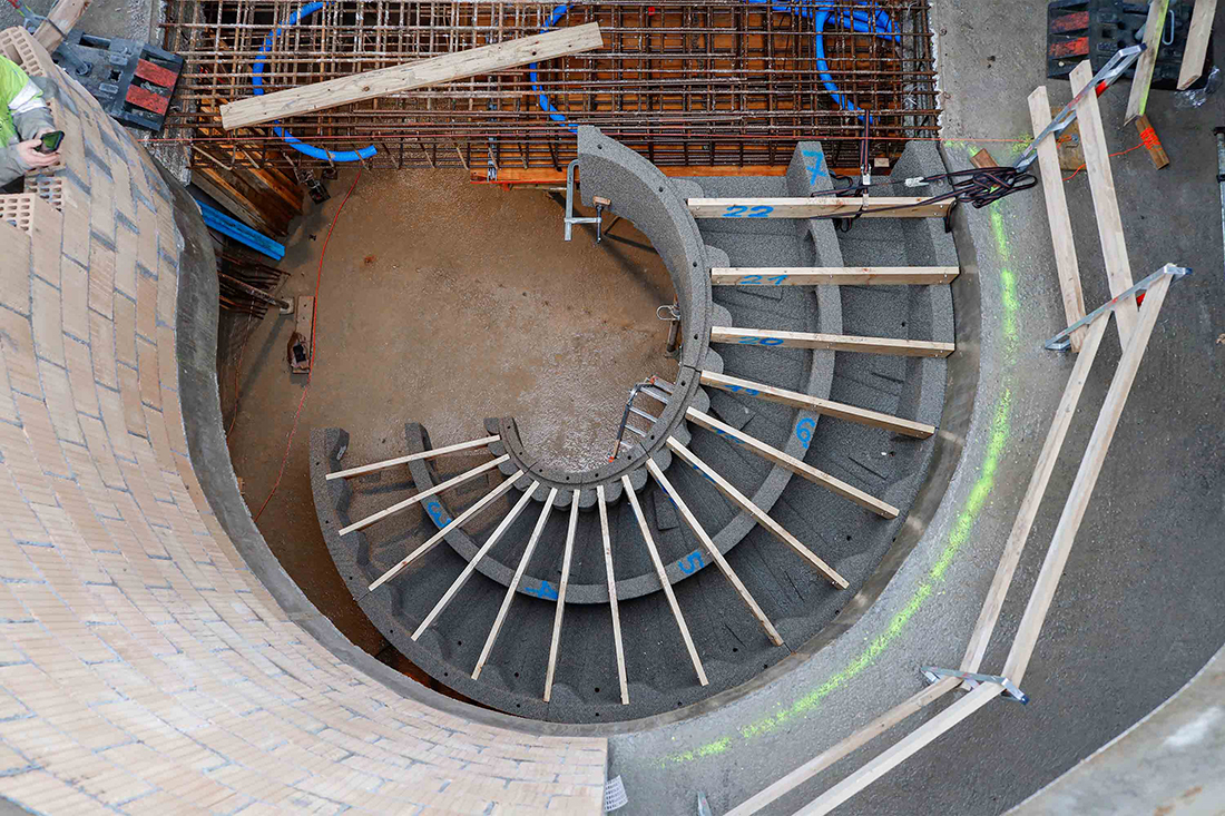 The ScawoStair is a patented system for custom reinforced concrete staircases from prefabricated formworks developed using cutting-edge additive manufacturing and computational design technologies. When a stair design becomes too difficult and costly for traditional prefabricated stairs or conventional formwork, the ScawoStair offers an economical alternative that allows designers to realize any shape at no added cost.