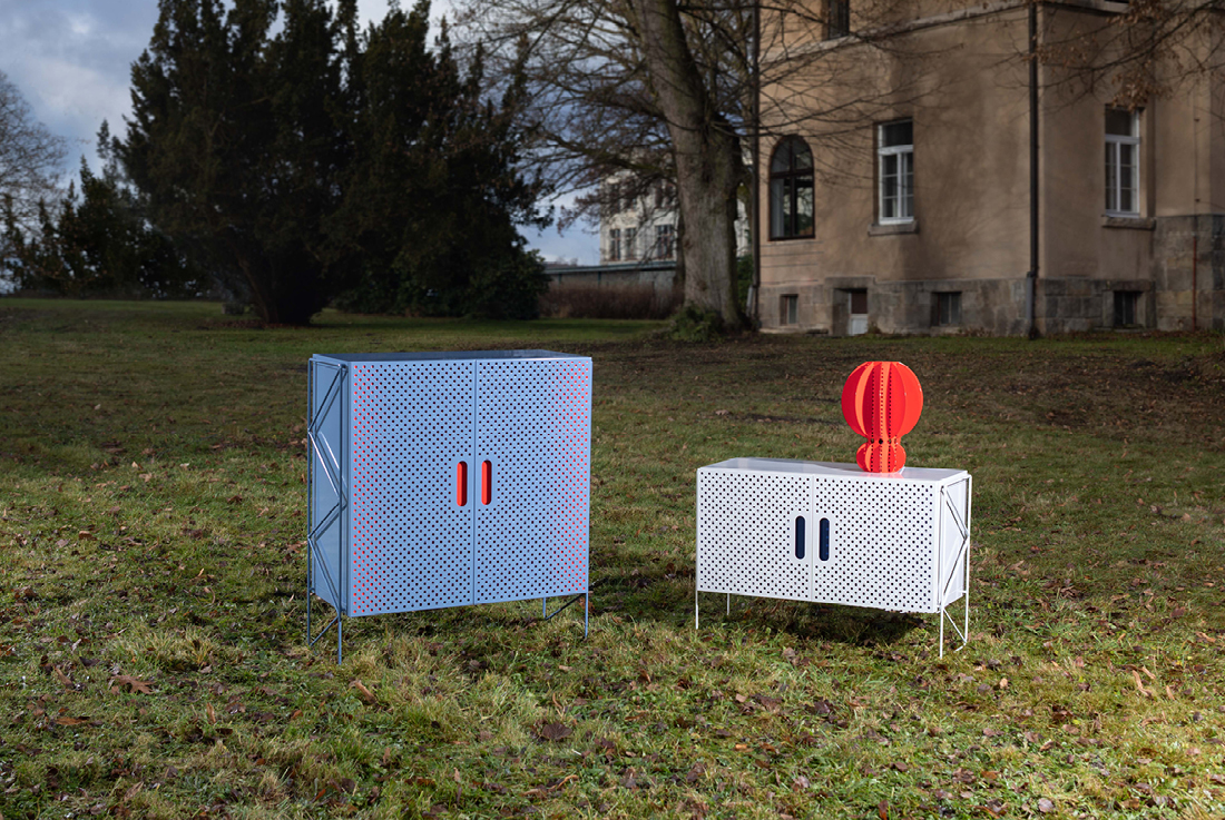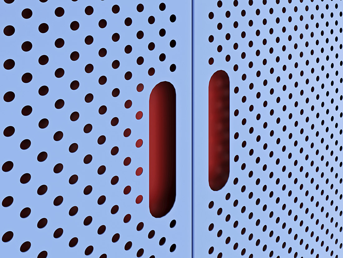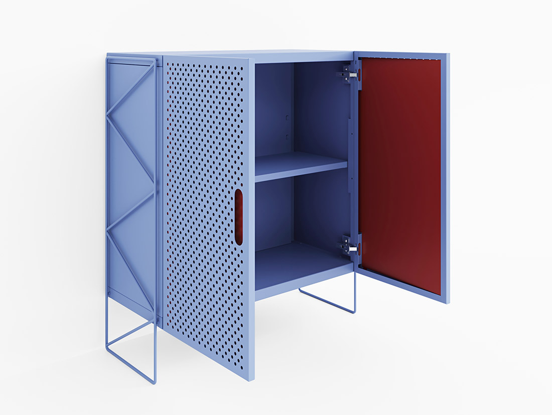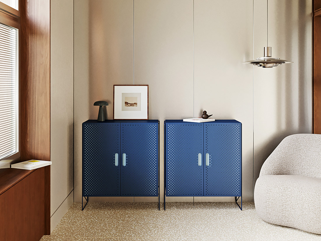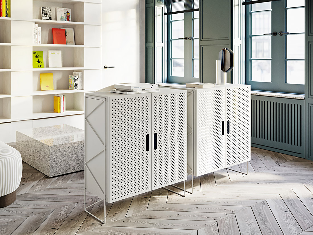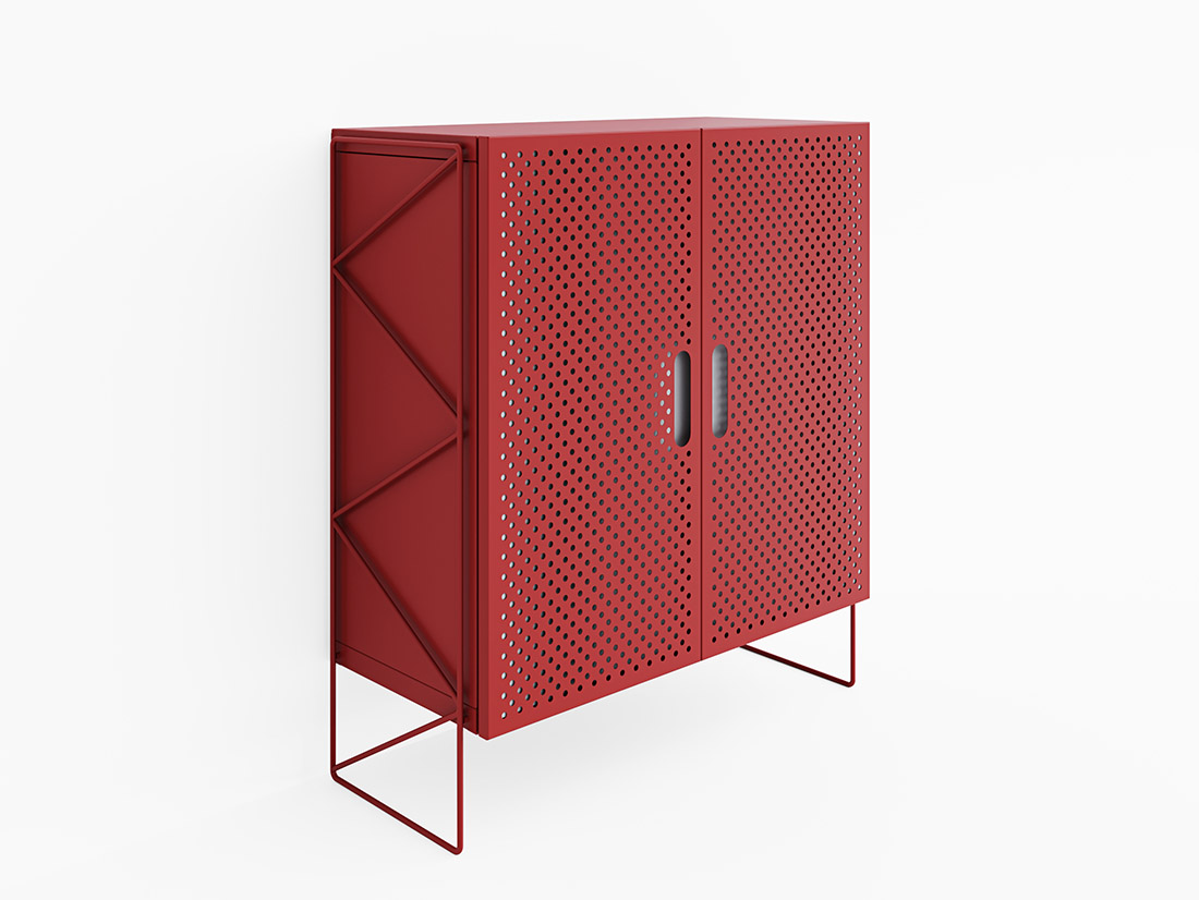 Cabinet #1311 stands out with its round perforations on the double-layered steel doors, creating a unique interplay of light and shadow. This subtle yet striking detail gives the cabinet a refined look, making it a great choice for various interiors—from living rooms and offices to workshops and garages. The thin wire frame, which also runs along the sides, adds a touch of industrial chic while maintaining a minimalist aesthetic.