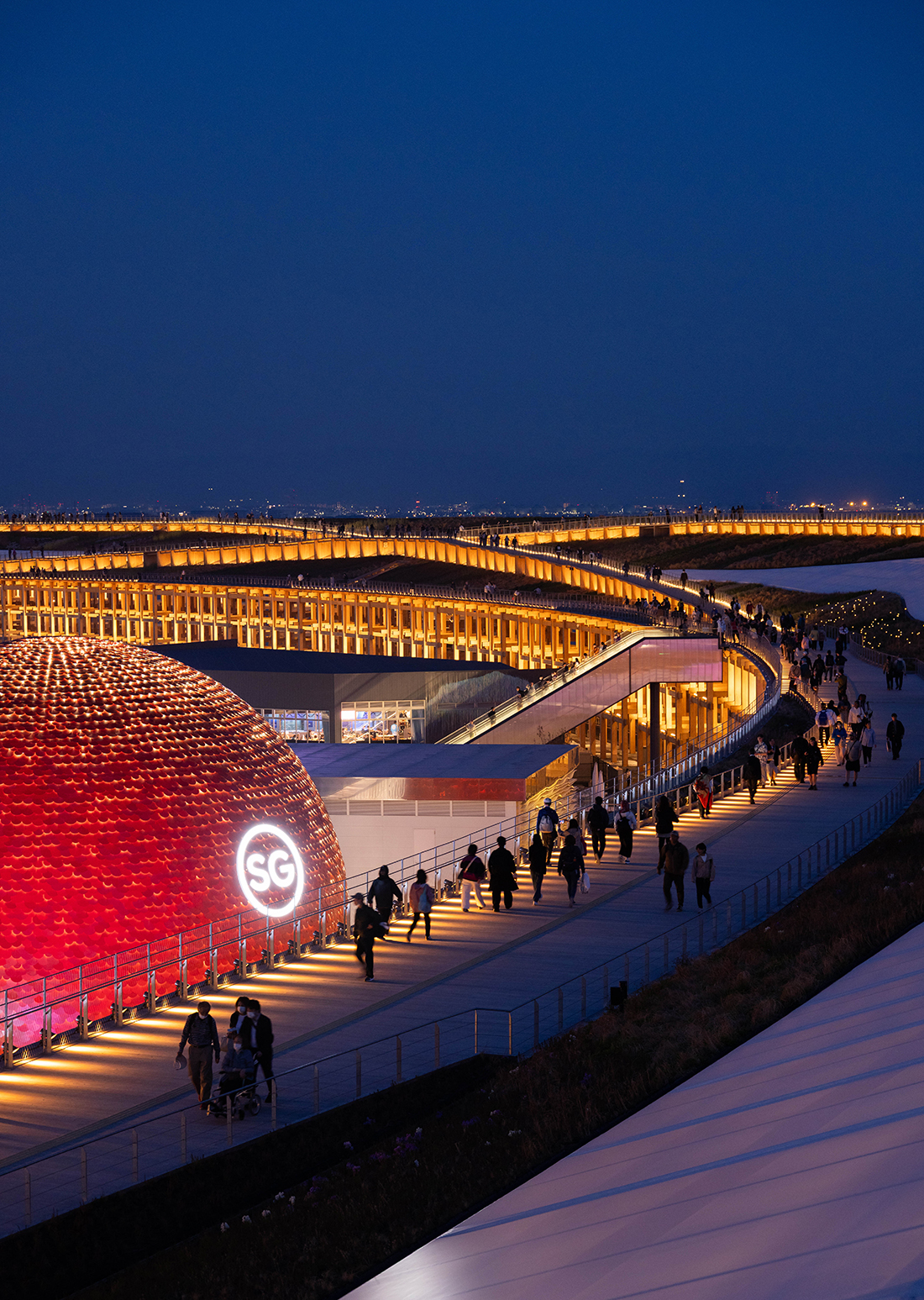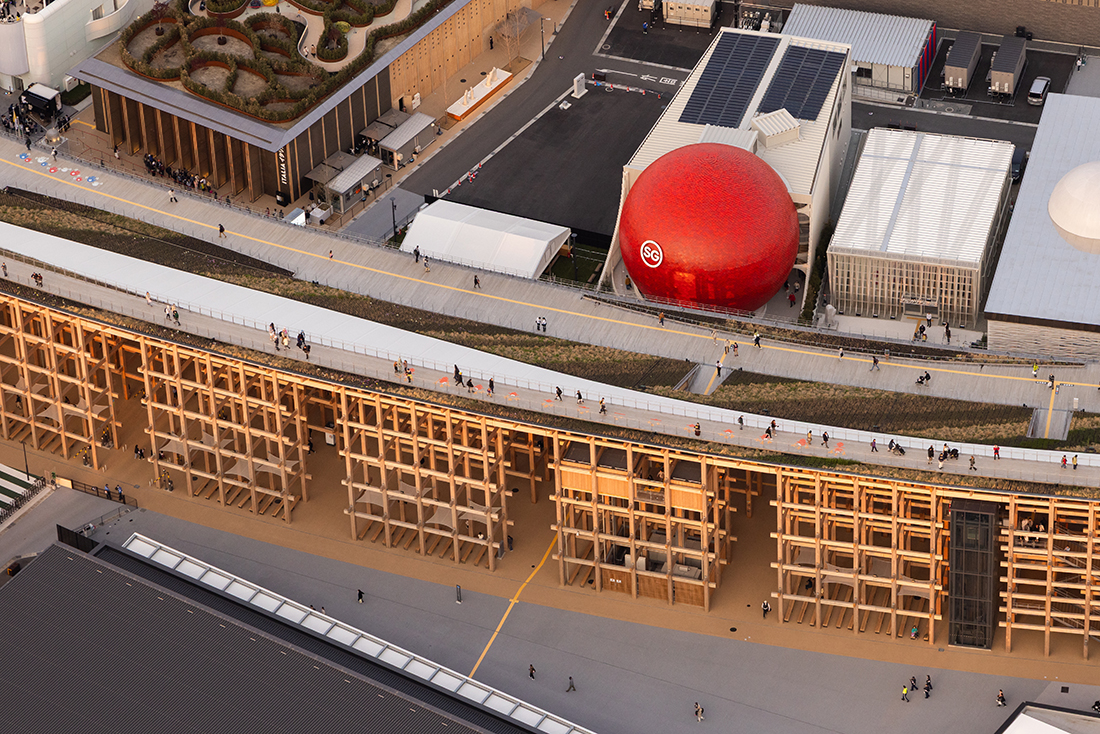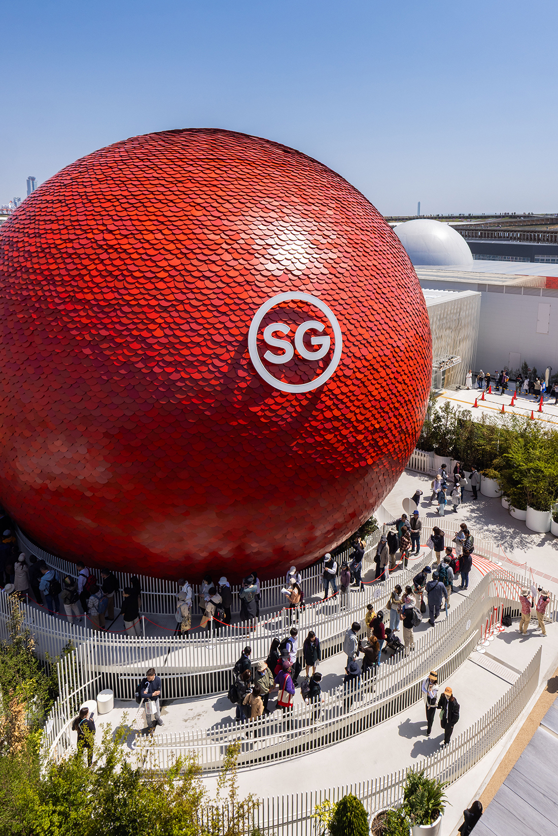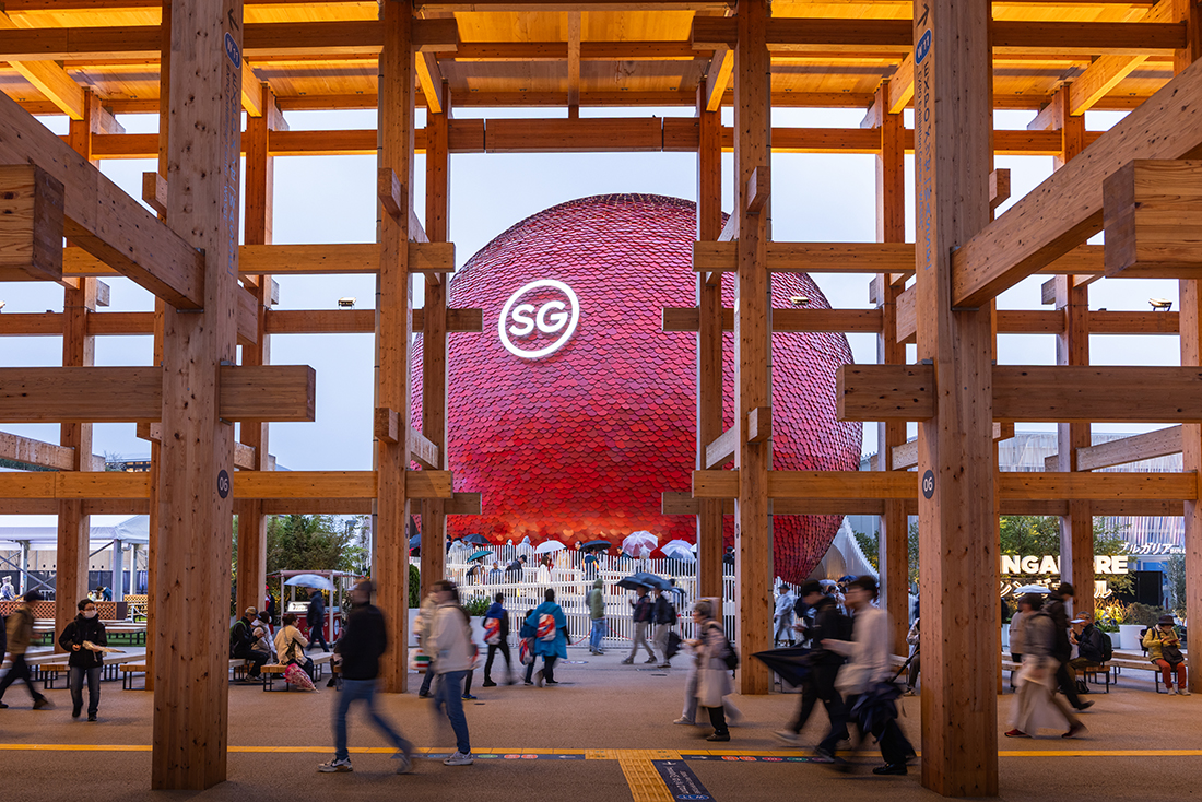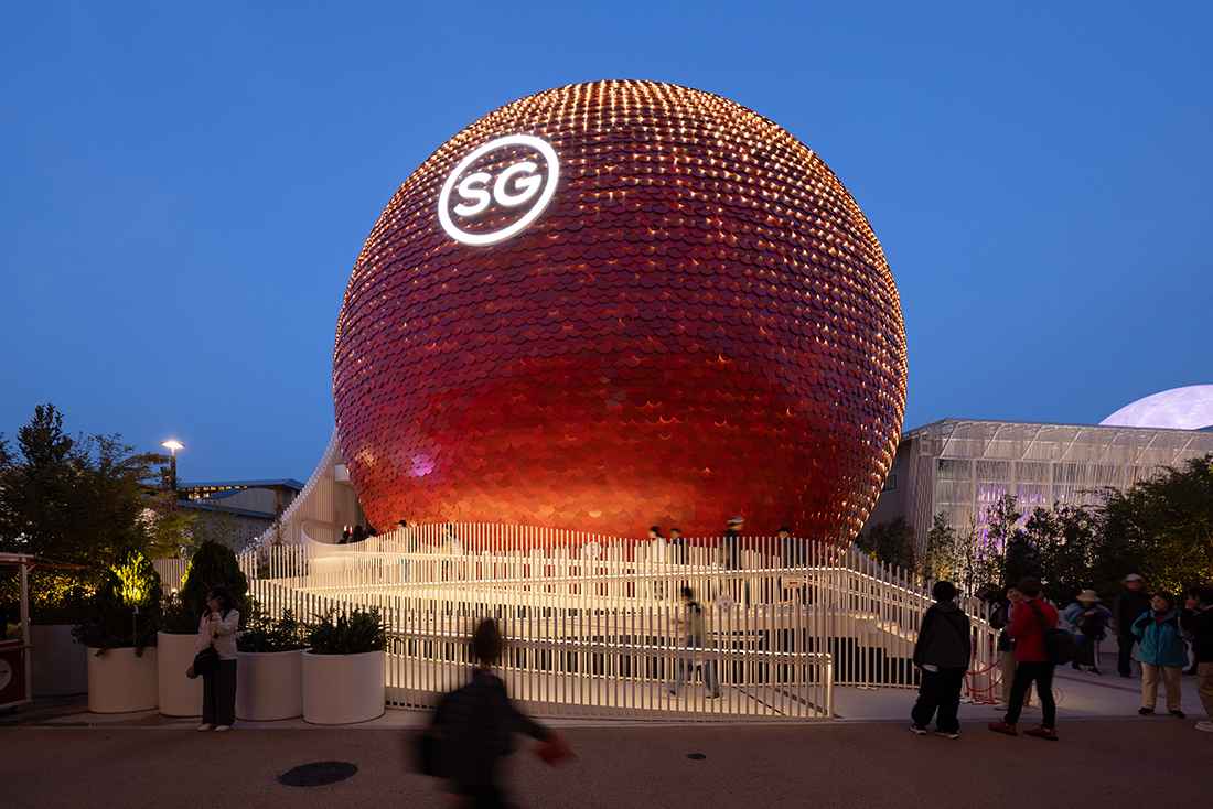 Commissioned by the Singapore Tourism Board, the Singapore Pavilion, The Dream Sphere, is a 17-metre-tall sphere clad in 17.000 recycled aluminum discs. It is a larger-than-life, three-dimensional representation of the “Little Red Dot”, a term of endearment for the nation that symbolizes Singapore’s vision and global impact, despite its geographical size. Using modular, sustainable systems, it minimizes environmental impact and aligns with UN SDGs.