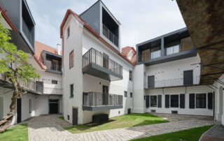 The single-family house is divided into two elongated structures that are connected by a light-flooded part of the building. The L-shaped building creates a barrier between the private garden and the public street. While the first floor of the southern part of the house contains the parents’ retreat, on the ground floor bright and flowing spaces invite the family for coming together, cocking, eating, discussing and chilling. The northern part of the house belongs to the children. Here they can find their private space. The house for the family of seven should offer a home for everyone at every age. Therefore, it is designed as a multi-generational home, and can be divided into three separate and autonomous units.