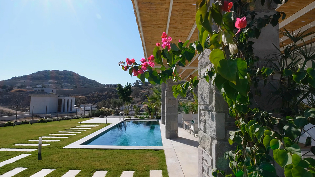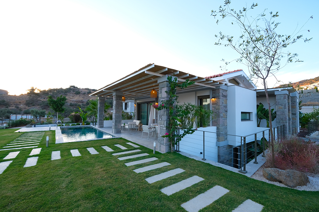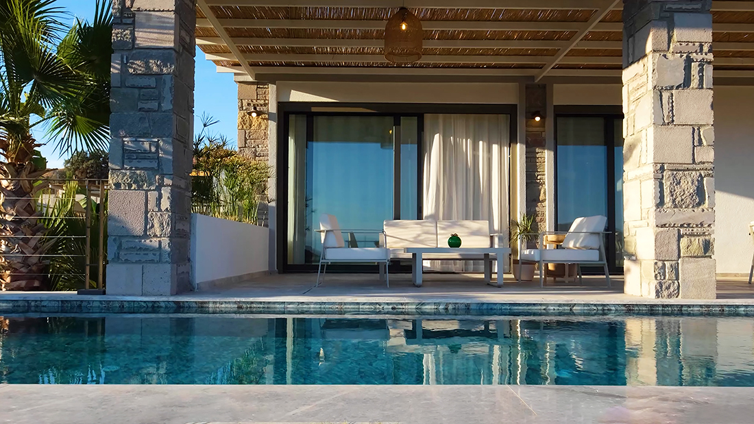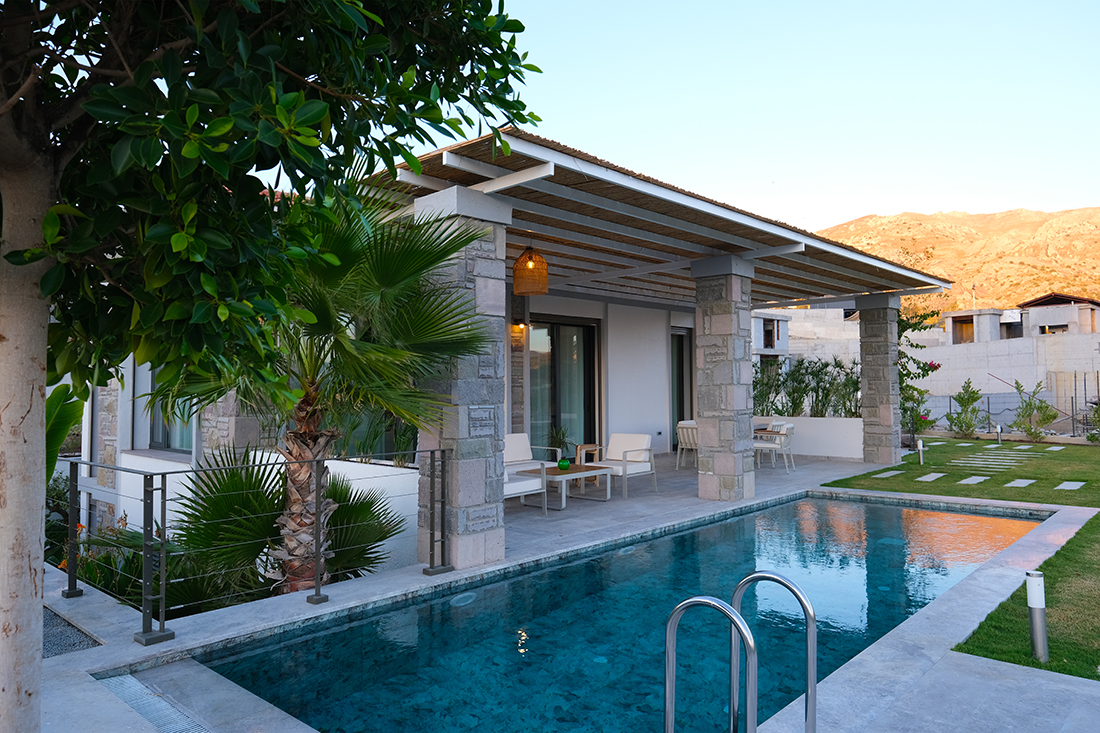 The project, located in the Gumusluk area of the Bodrum Peninsula, spans a 19.750 m² site known for its rugged topography. It consists of 16 residential units, designed in two distinct typologies. Due to local zoning restrictions, the design incorporates both ground and basement levels.
