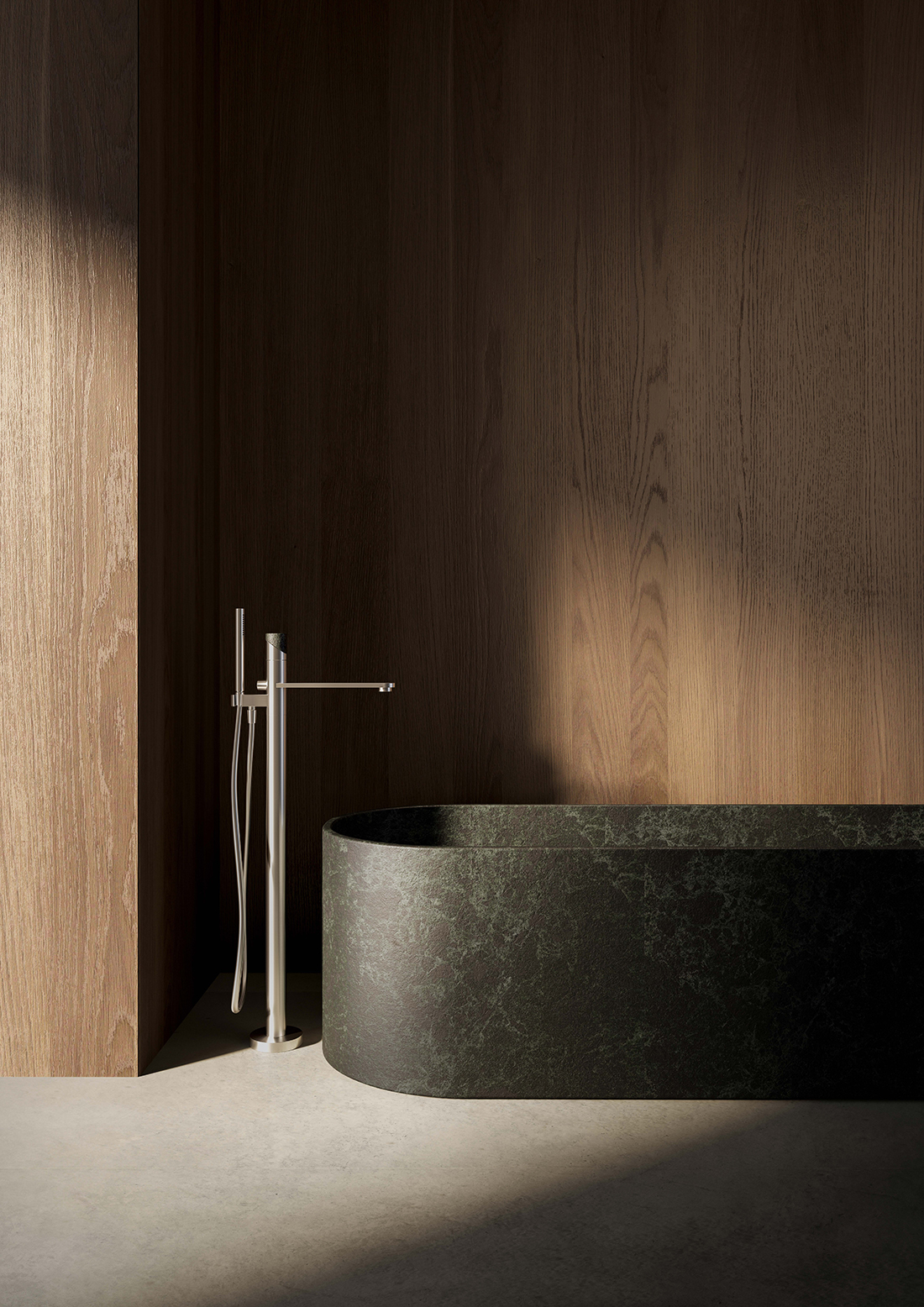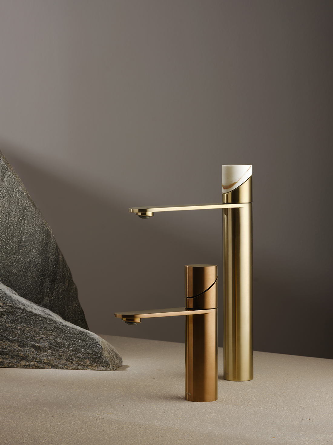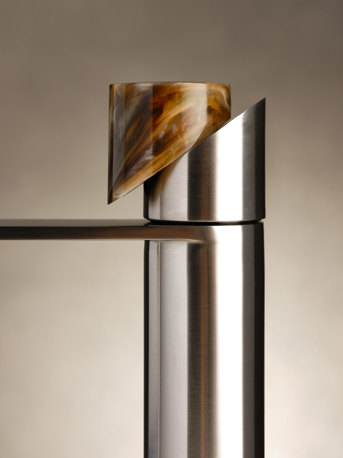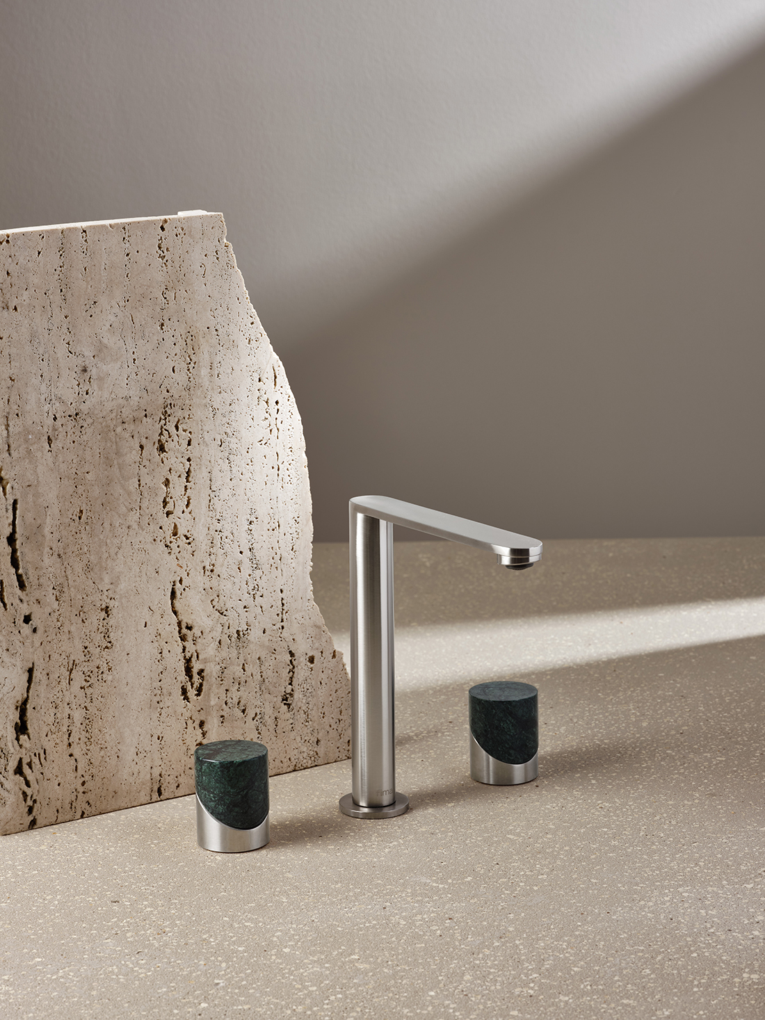 The handle – a purified cylinder divided by an inclined plane – glides with gentle pressure, merging superior ergonomics with a “less is more” aesthetic. Crafted from eco-sustainable AISI 316 stainless steel, the series elevates daily gestures into sensory experiences through customizable inserts in marble, wood, and handcrafted resin.