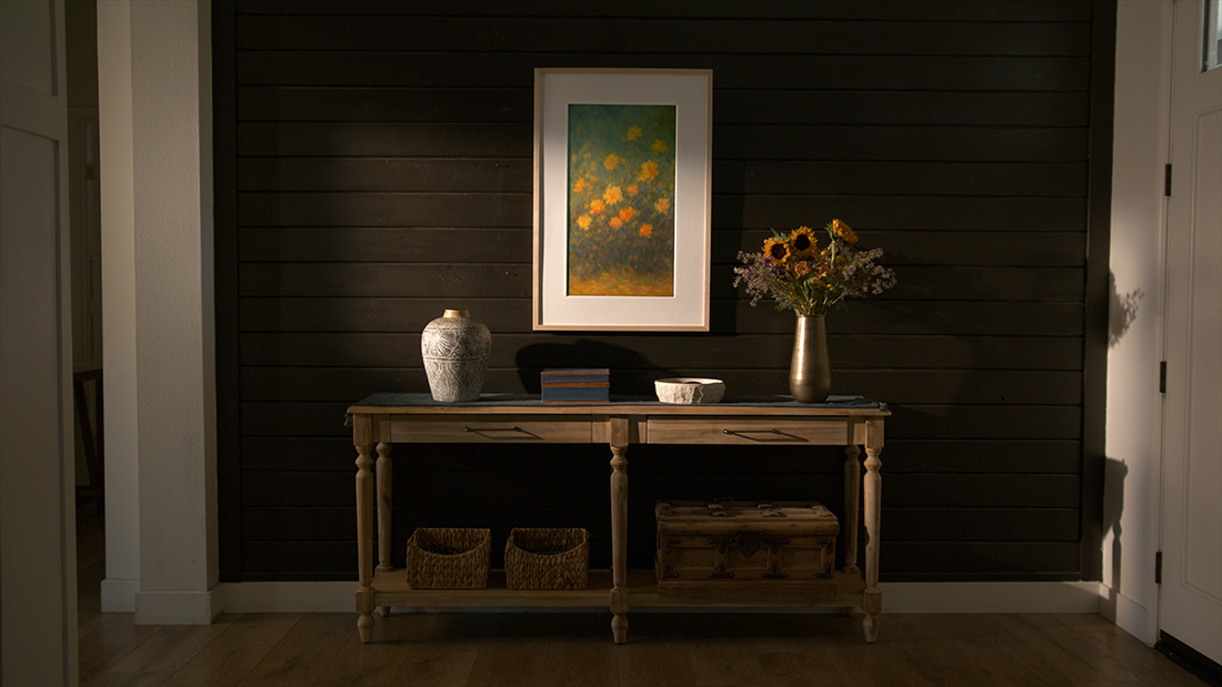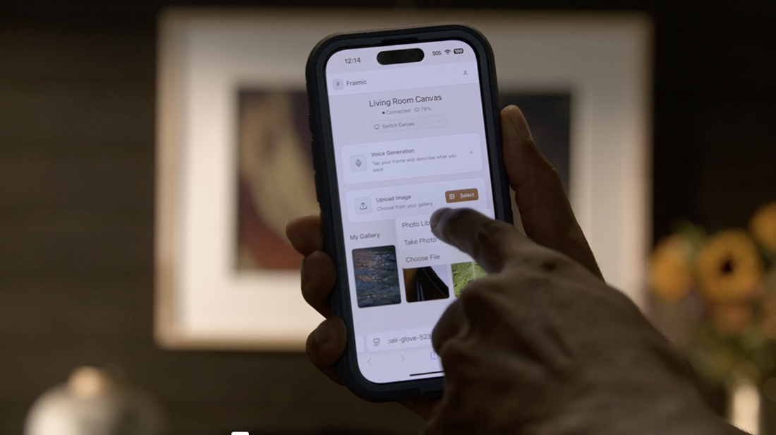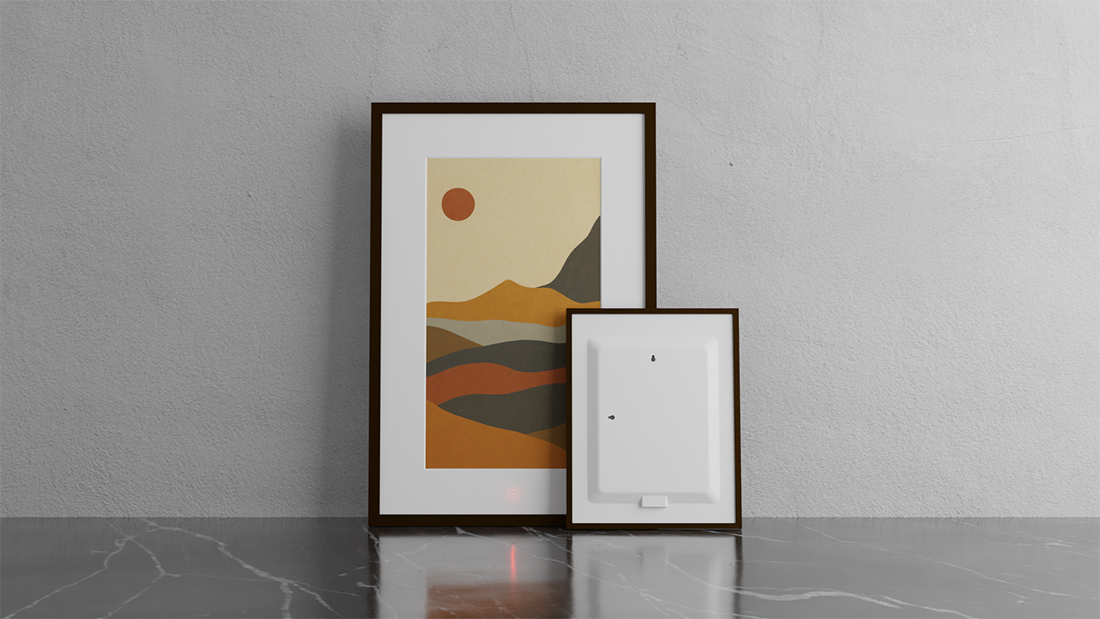 Fraimic is a modular digital art canvas that combines voice interaction, AI image generation, and color E Ink display technology for sustainable, long-term art presentation. The display module fits standard 14 × 18 in (35.6 × 45.7 cm) and 24 × 36 in (61.0 × 91.4 cm) frames, allowing users to freely select or replace frames to suit different interiors. Its matte, paper-like E Ink screen looks like ink on paper and consumes power only during image updates, resulting in a multi year battery life from a single charge.