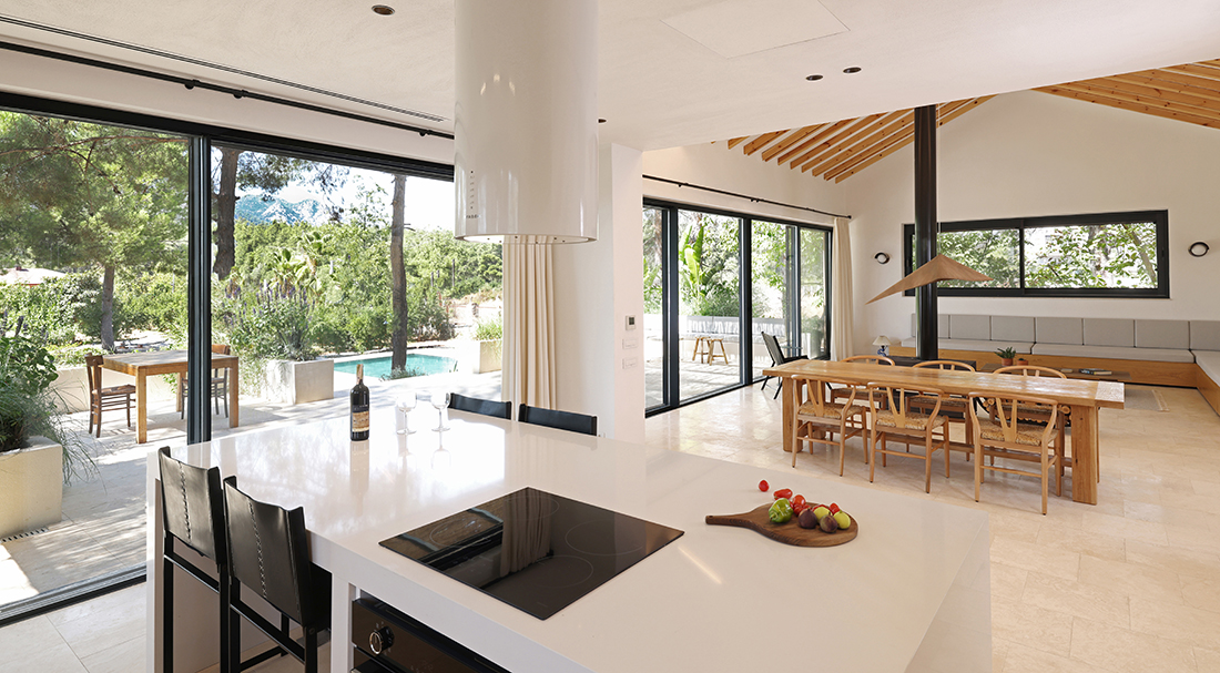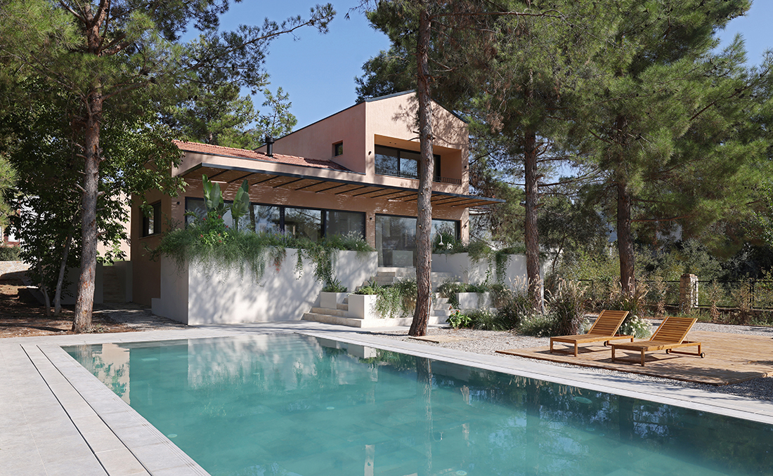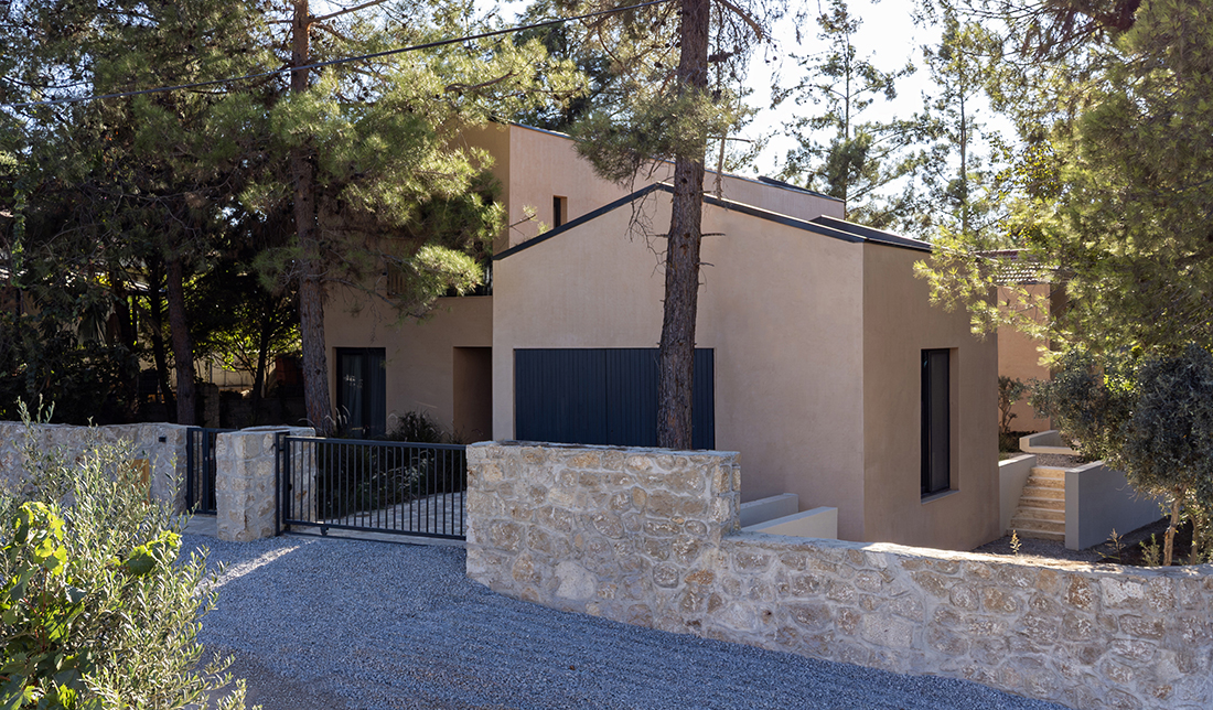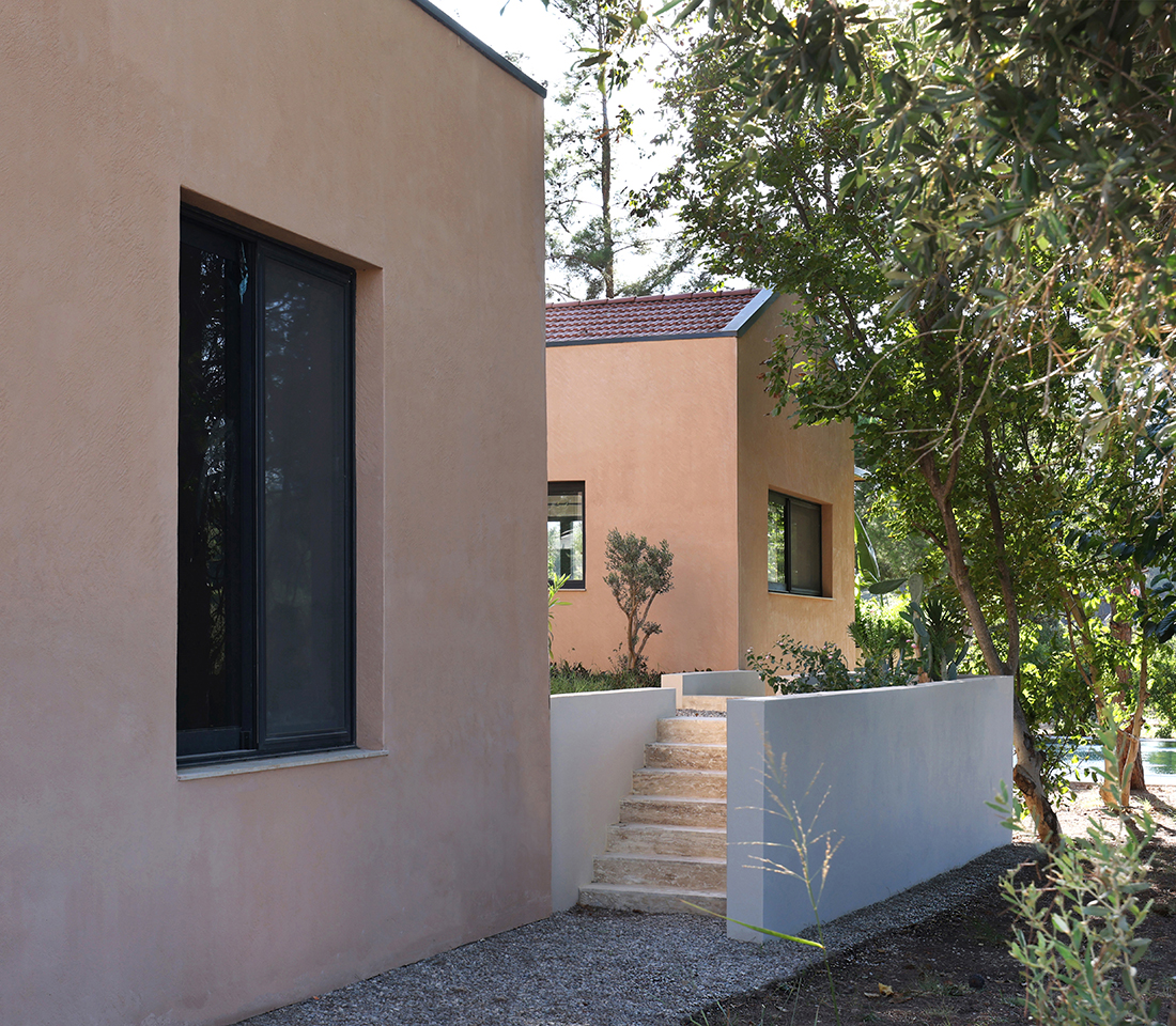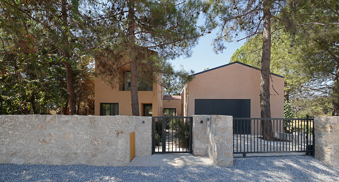 Villa Solymos, located in Döşemealtı, Antalya, consists of a main residence, a single-story garage unit, and interconnected outdoor spaces. Inspired by the region’s earth tones, the project is organized along an axis extending from the street to the lower garden, overlooking the Solymos Mountains. The steep terrain is shaped with terraces and stairs, while existing trees are preserved, and buildings are placed within clearings. Living areas open to the view, and circulation spaces maintain a constant visual connection with nature.