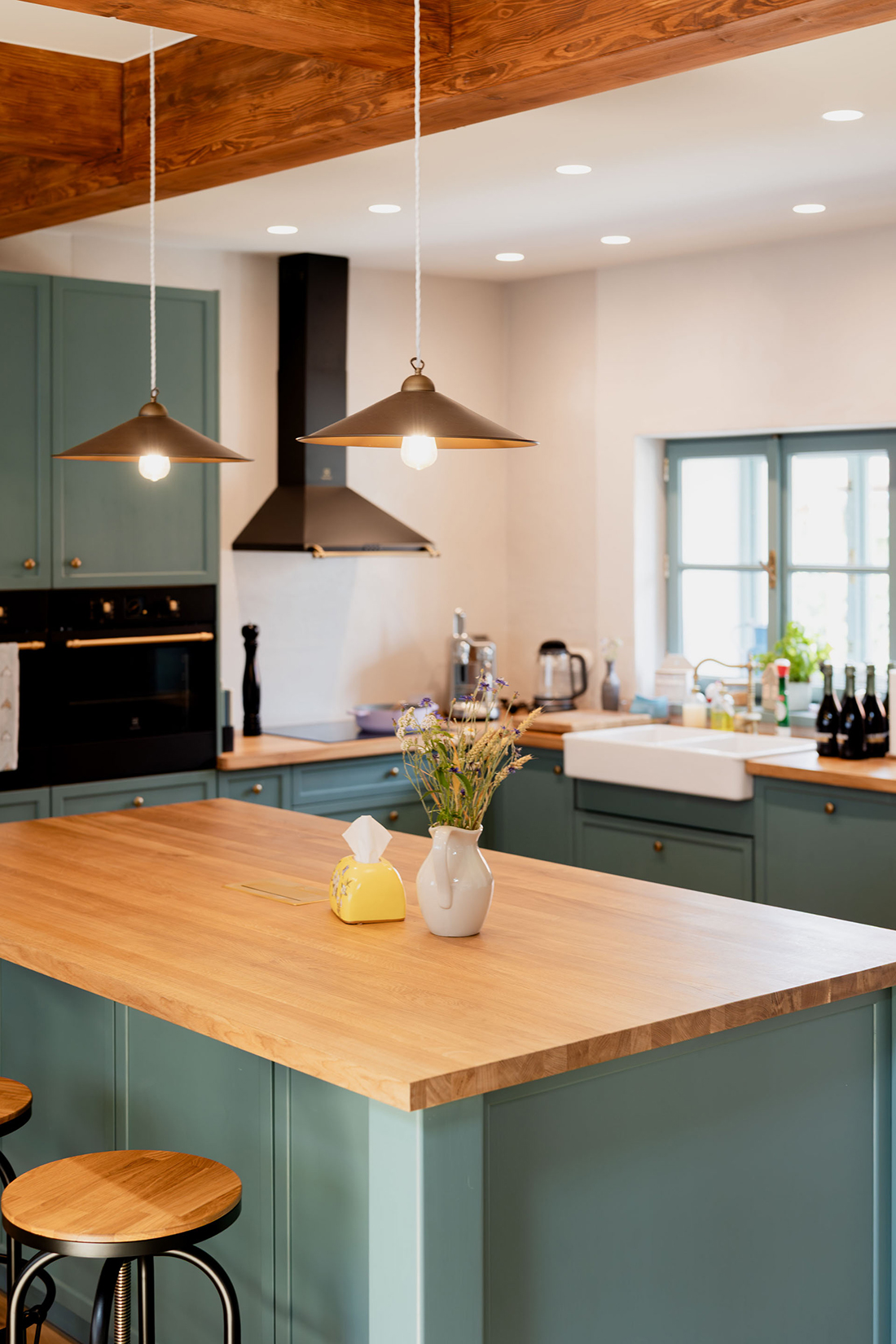 Natural materials such as wood, stone, and textured plaster form the foundation of the interior, emphasizing tactility, durability, and authenticity. A distinctive color palette, defined by the client, plays a key role in shaping the atmosphere. Soft, muted tones are used to unify individual spaces and subtly reference traditional rural interiors, while their contemporary application gives the house a fresh and timeless expression. The open living area connects kitchen, dining, and relaxation spaces into a communal heart of the home, reflecting the social nature of rural life.