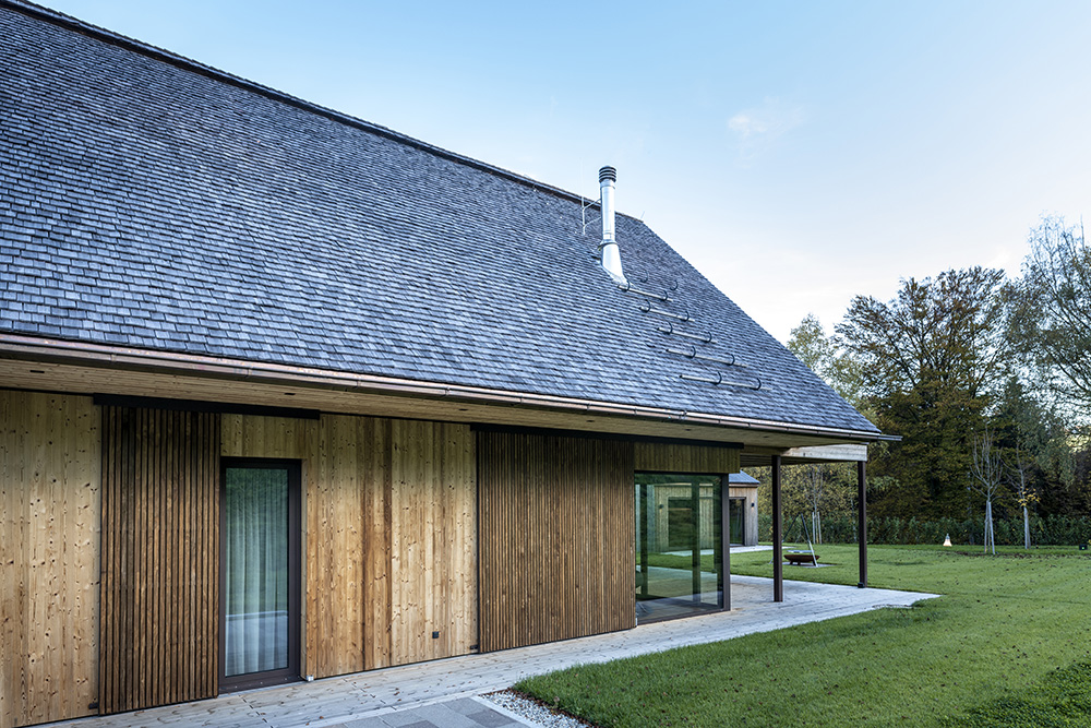 The property has an east facing slope where the new buildings serve, together with the main house, as a completion of an ensemble of several individual buildings. Originally, the hut served as a shelter from weather events during the seasons. In spring from the cold, in summer from the heat and in autumn as a break from grape harvesting. It has also served as a sleeping-in, without electricity and water. Later, the hut was also used to pull up the vine stocks as well as a tool hut. At first glance, the enlarged, revitalized “Winzerhütte” (Winemaker’s hut) appears like a traditional southern Styrian farmhouse nestled within the vineyards. When you look at it calmly, it turns out to be a compact place of retreat: it can be closed on the mountain side and opened quickly on the front for unobstructed views into the landscape. As an ensemble, the Spa Chalet together with the Sauna Chalet forms an inner courtyard that conveys privacy and intimacy. Inspired by the regional roof structure, the exterior views create a sense of unity, timber slats let light and air into the openable glazed facade.