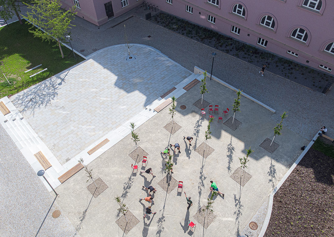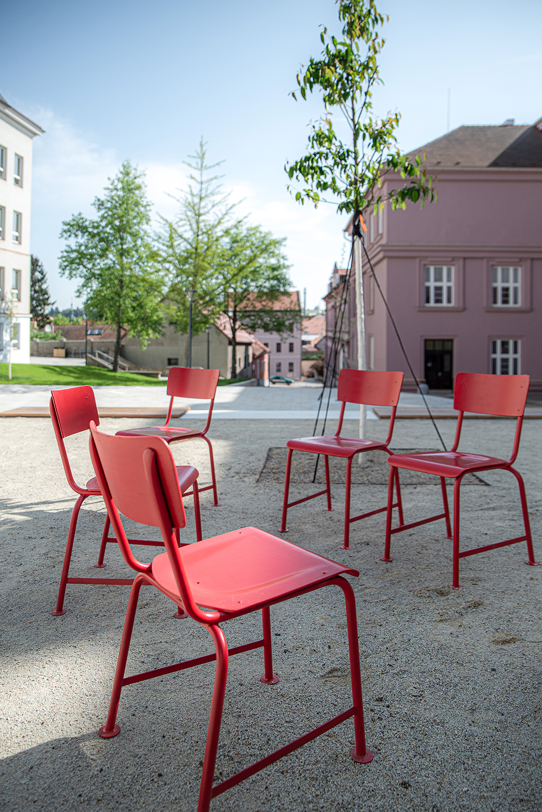 The park square, located near Pelhřimov’s historical center between the Rondocubist gymnasium and the business academy, is being transformed from a disjointed, hard-to-navigate space into a vibrant public area. Organized across three interconnected levels, the park features distinct zones. The upper level includes a bosket with shade-providing trees and flexible seating. The middle level boasts a paved stone area bordered by an amphitheater with tiered seating, creating a central space for gatherings, events, and outdoor learning.