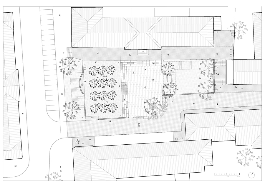 Open to all age groups and social backgrounds, the revitalized park is designed to be inclusive, welcoming, and safe. It fosters interaction, enriches urban life, and serves as a dynamic connection between the city and the neighboring schools. The landscape design incorporates new trees arranged according to a grid layout, ensuring a structured and cohesive design. This approach carefully plans the positioning and spacing of the trees, creating a harmonious and organized visual effect.