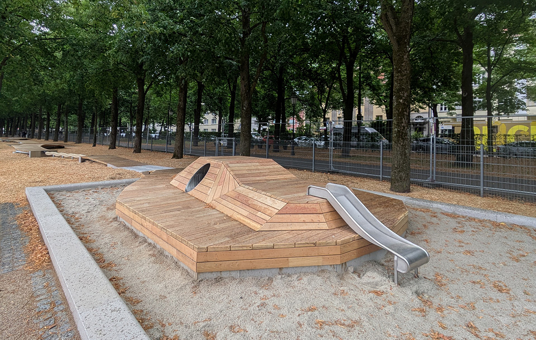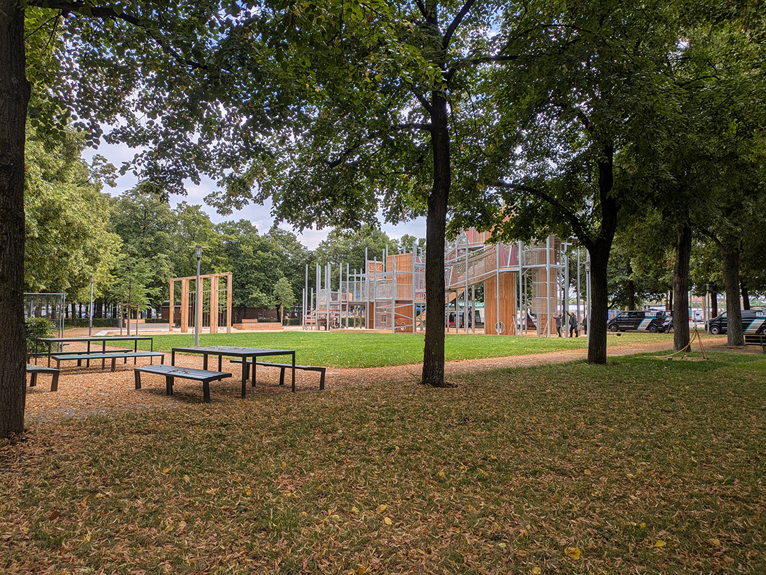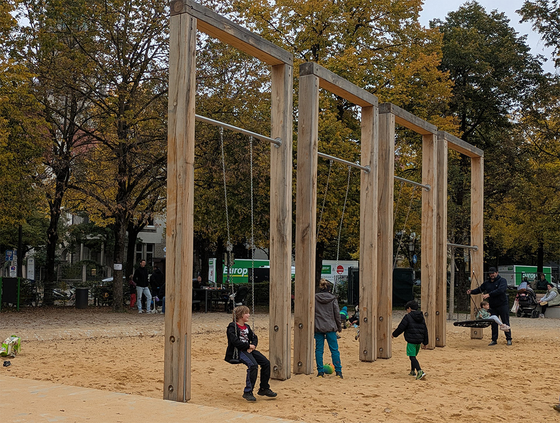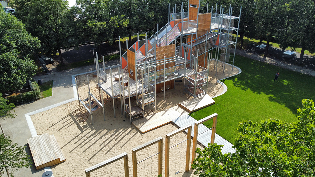 The play stations along the avenue are grouped: play and relaxation in the north, fitness in the central area, and toddler play in the south. The new platform course, with adjacent sky swings and a wide slide, evokes associations with “Wiesn” rides. Smaller children are catered for on the lower level, while older children and teenagers can climb via varied routes and slide down together.