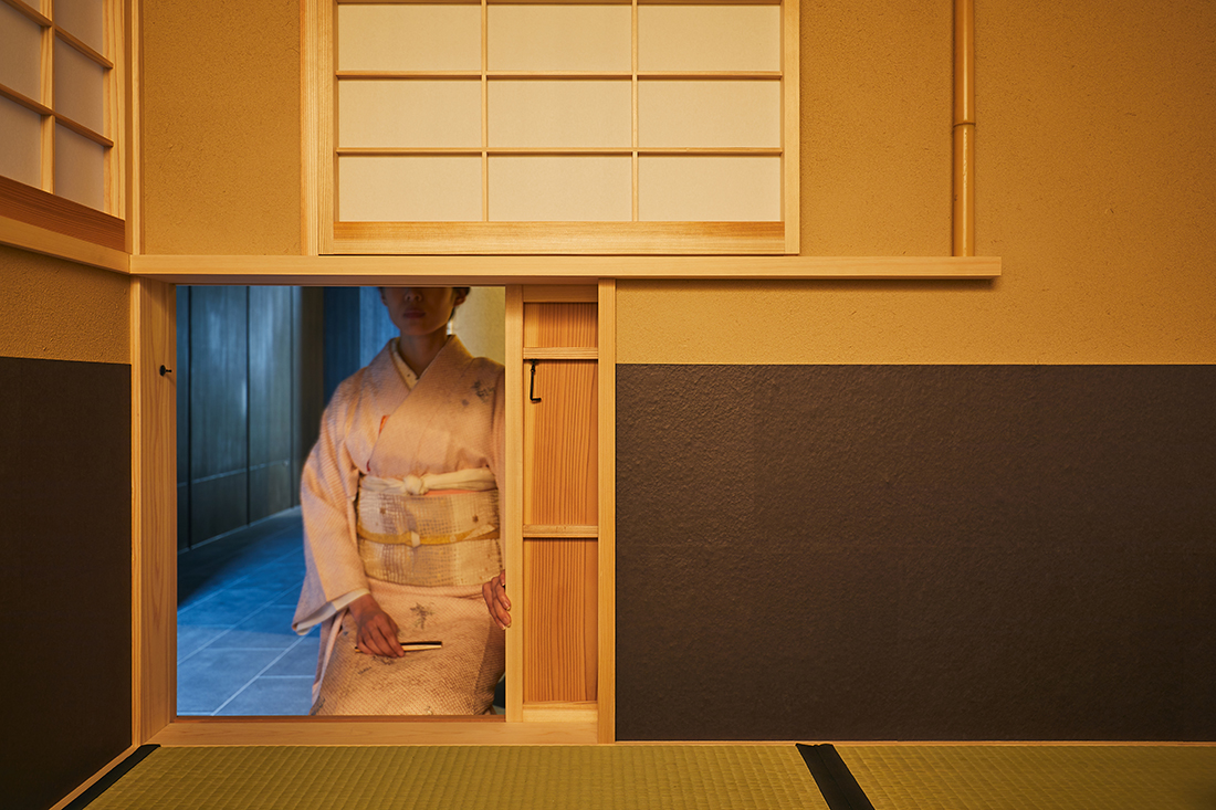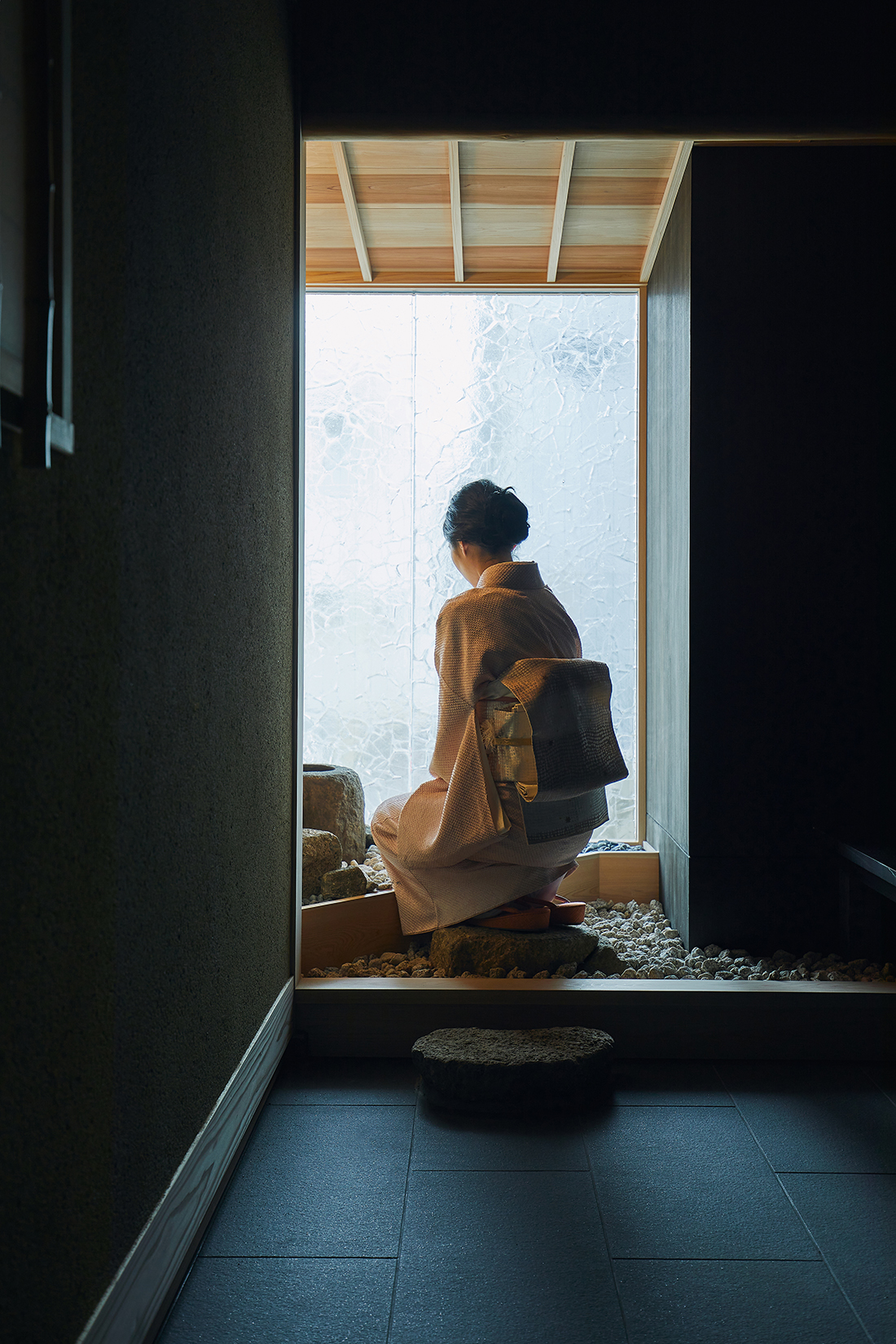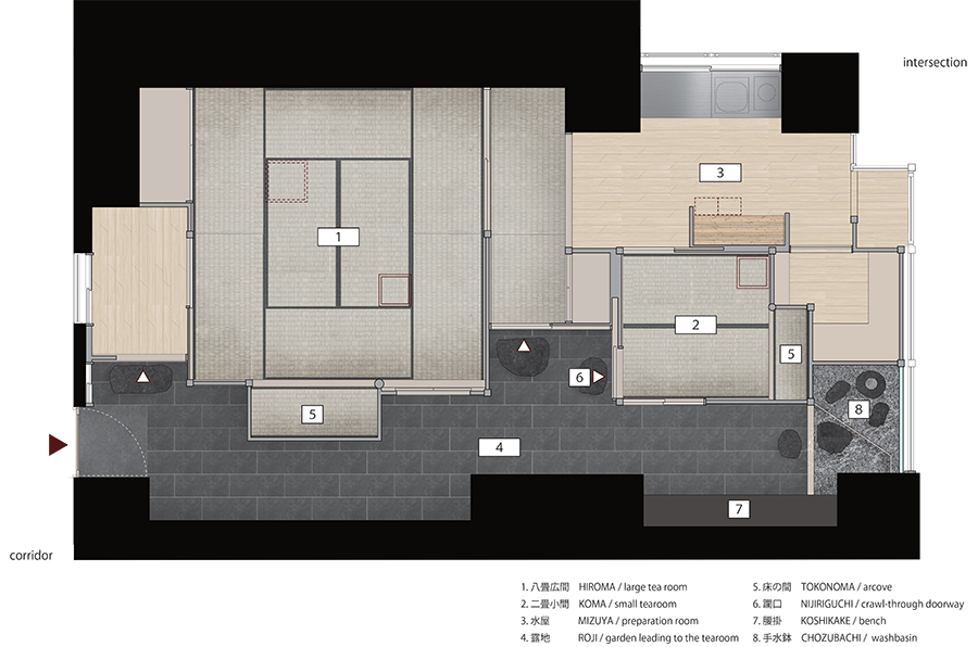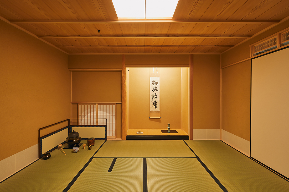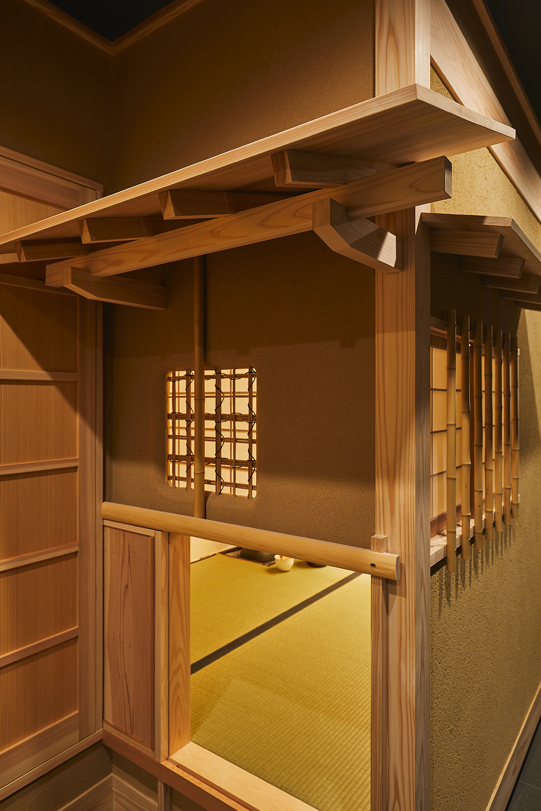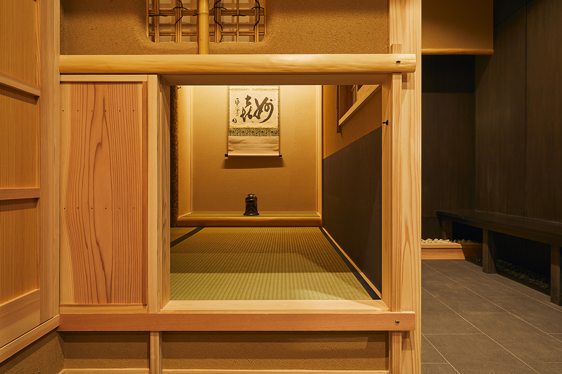 The tea room is located within a condominium in Tokyo, situated at a busy intersection with a large opening facing the crossroads. While the glass walls are advantageous for commercial use, they pose challenges for a tea ceremony space due to their high visibility and limited soundproofing. The primary challenge was finding a way to transition the environment and atmosphere between everyday life and the serene, sacred tea ceremony.