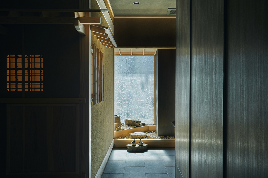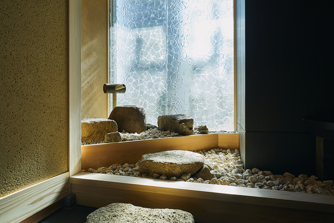 This was resolved by installing 100mm-thick corrugated glass in front of the existing glass walls to dampen both sound and light. The layout was then designed to place the most sacred space, the KOMA, at the center, surrounded by a MIZUYA (preparation area), a warehouse, and a ROJI (garden path). This arrangement creates a gradual transition toward the KOMA, forming a darker and quieter atmosphere as one moves inward.