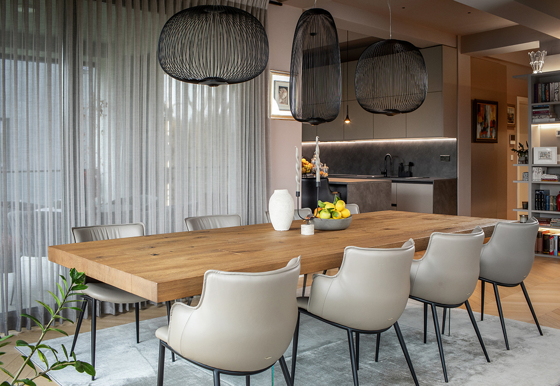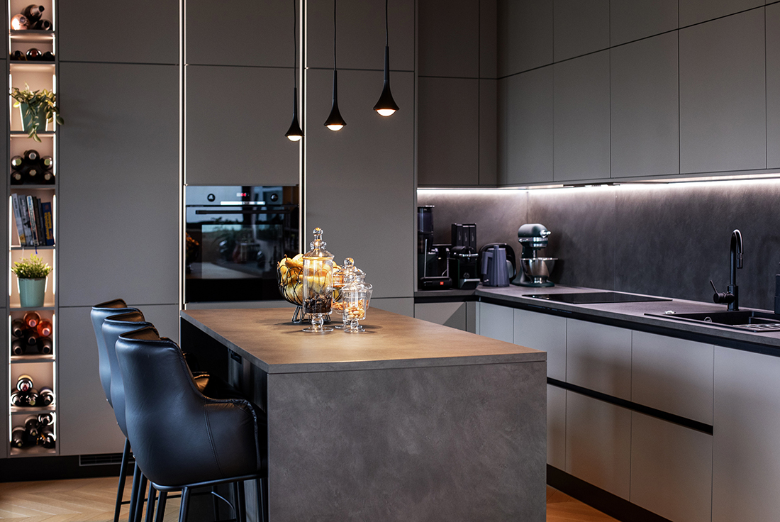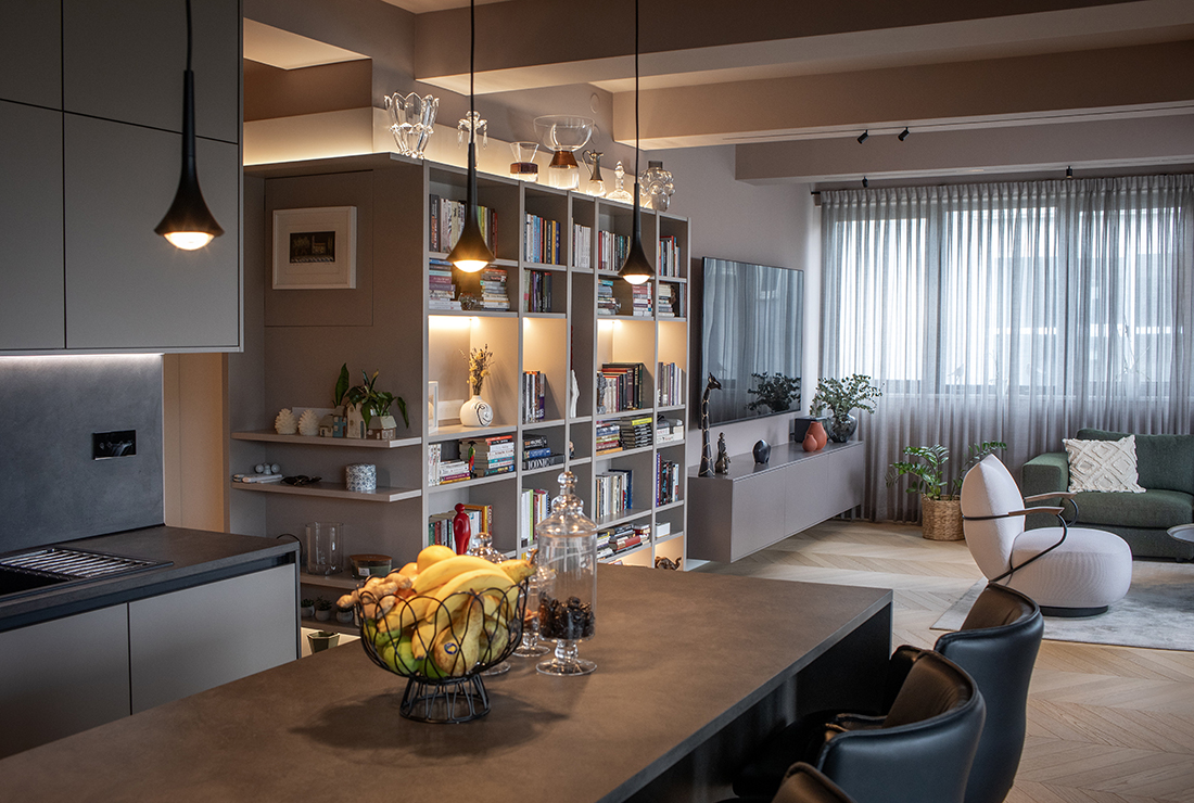 The apartment has three levels: the entrance area is on the middle floor, the ground floor, where you can enter either from outside or from the garage. The basement houses the utility area (laundry, storage), while the living space is on the first floor. A distinctive feature of the building is that it was constructed with reinforced concrete, with visible RC beams and a ceiling-integrated heating and cooling system. Therefore, there were extreme limitations for running installations and designing the lighting.