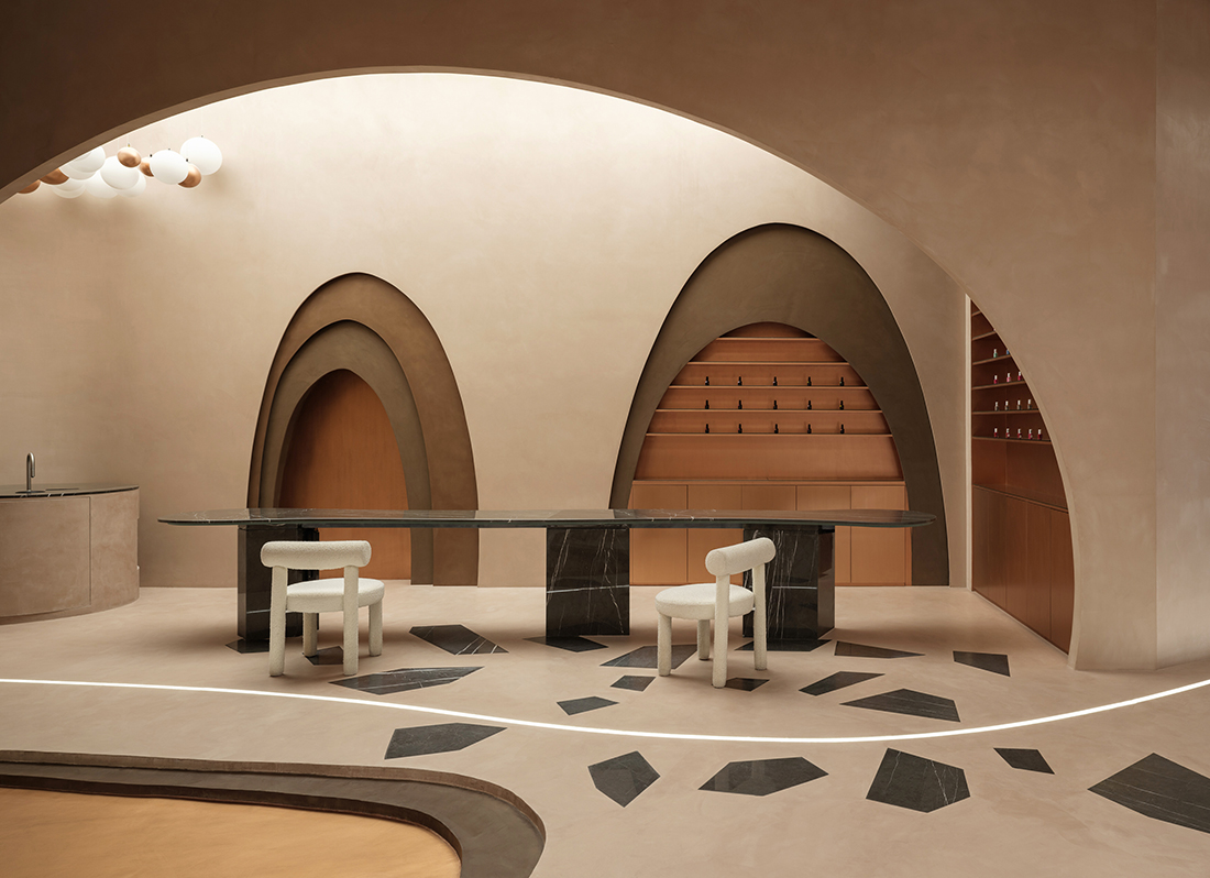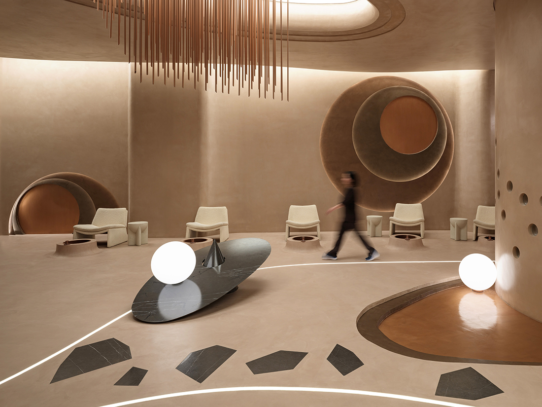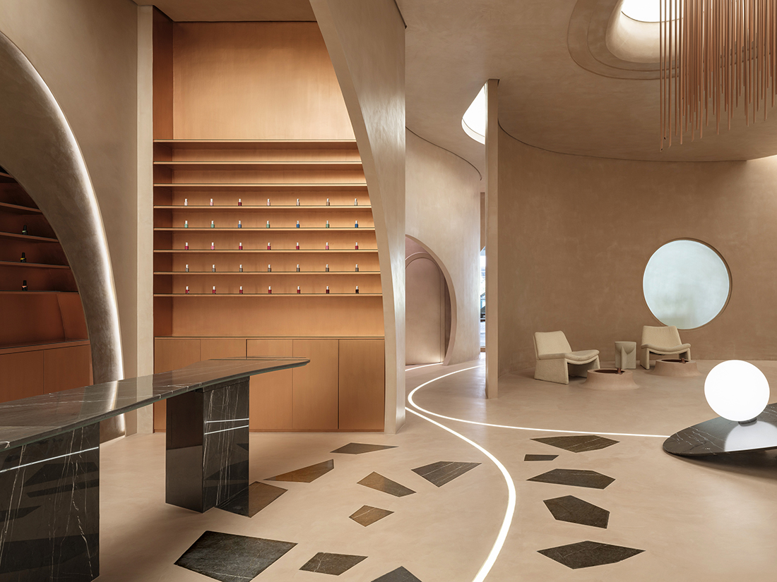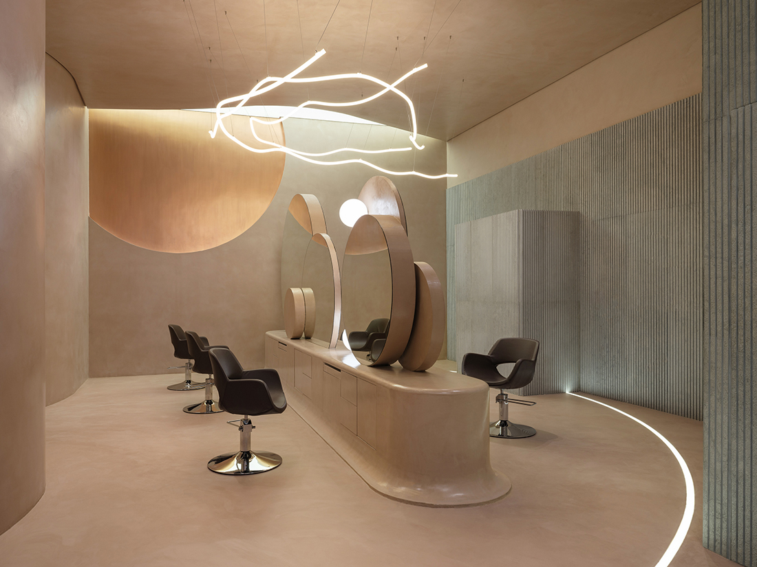 A central, elliptical skylight acts as the spatial core of the salon, allowing natural light to softly animate the interior throughout the day. This is complemented by integrated linear lighting and spherical luminaires that echo planetary forms and guide circulation. A restrained palette of warm, earthy tones and tactile materials enhances the sense of serenity and cohesion, while custom-designed furniture and lighting elements merge seamlessly with the architecture. Stellar Beauty Salon reflects ark4lab’s approach to architecture as an emotional and sensory landscape, transforming a commercial interior into a refined and timeless spatial journey.