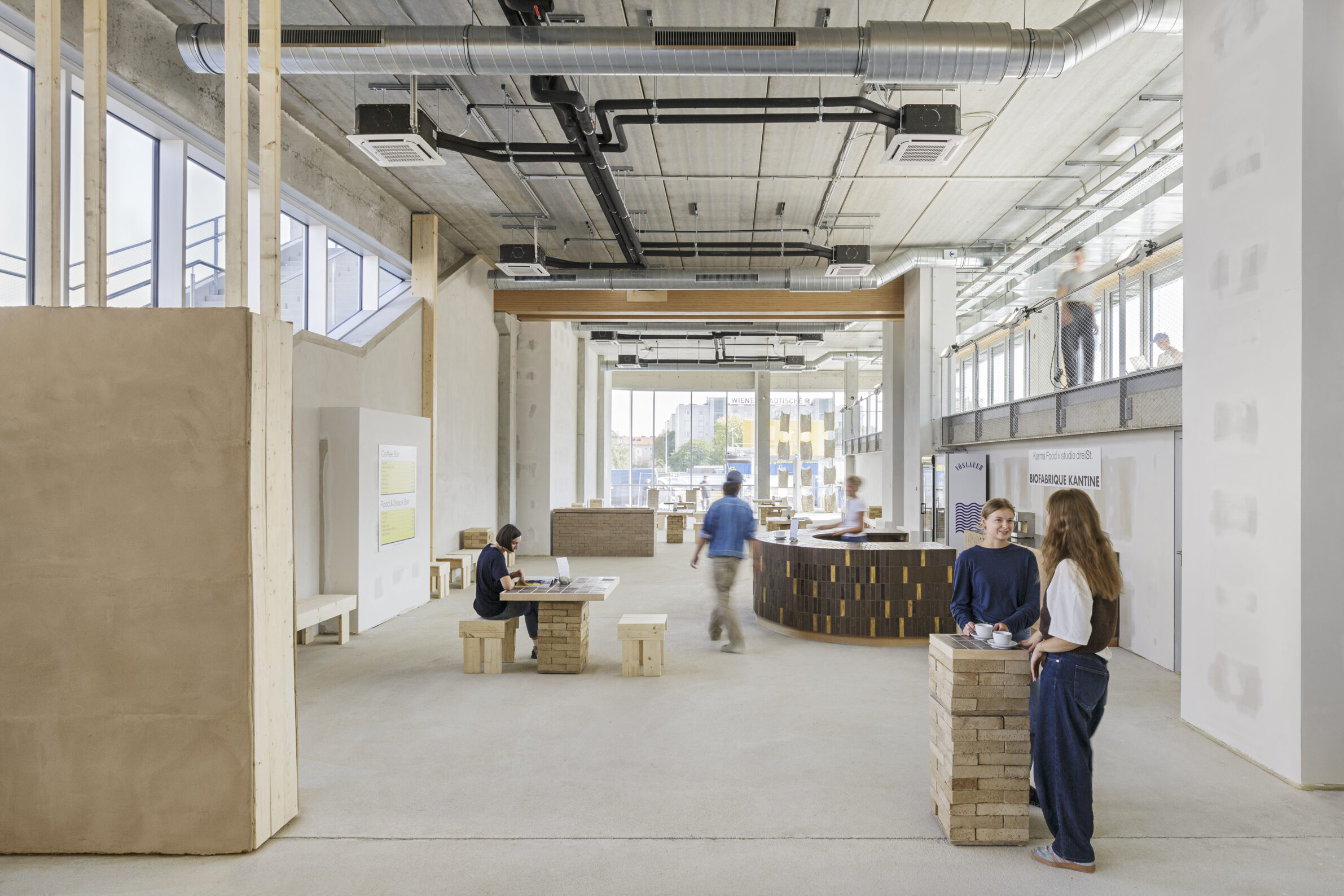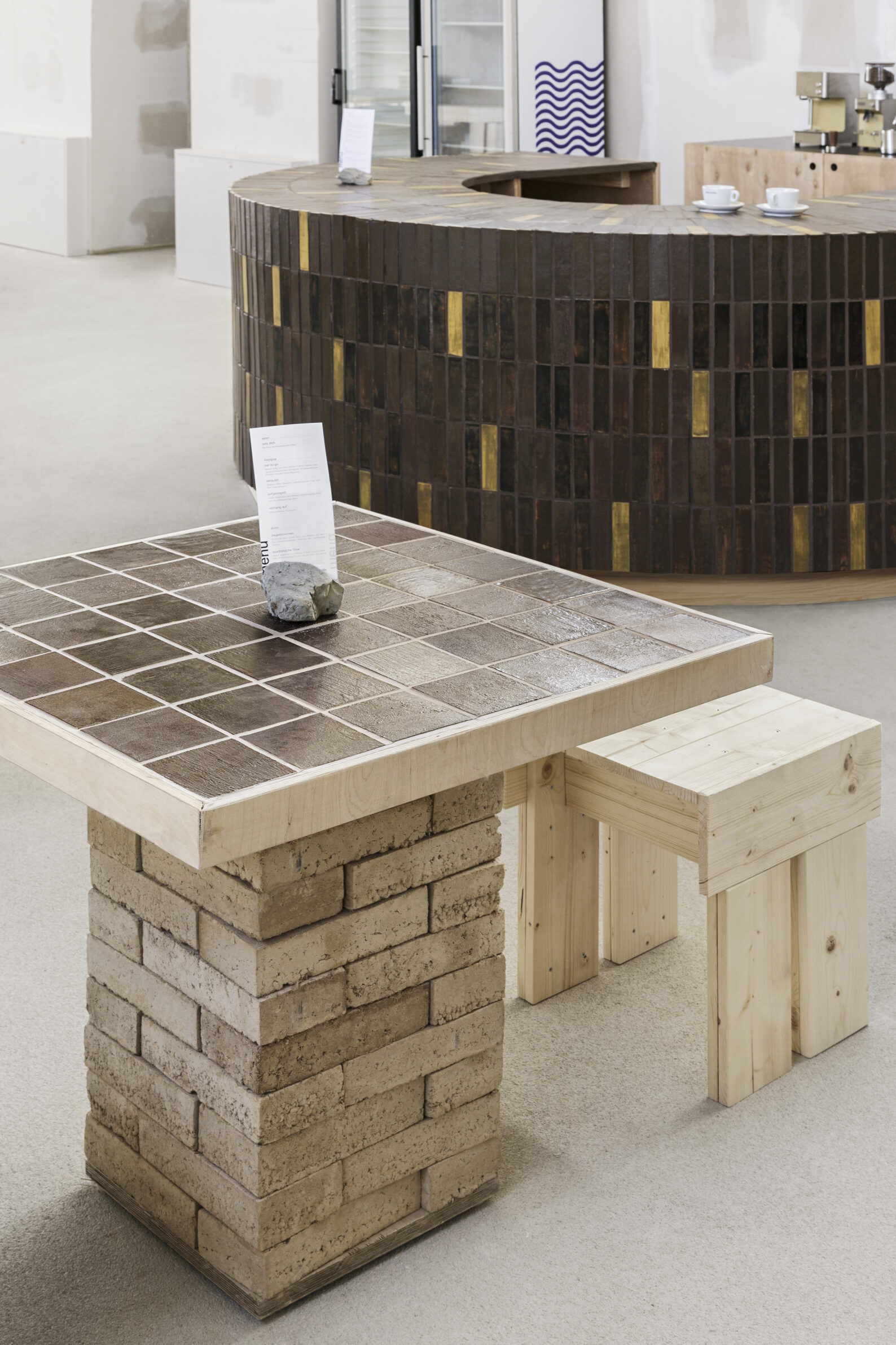 How do you create new valuable materials from waste materials? The Biofabrique Kantine is a festival cafe designed and built by studio dreiSt., which was commissioned by the Vienna Business Agency and VIENNA DESIGN WEEK for their 2024 exhibition. It is an experimental material experience in which urban waste finds a new use. Excavated clay from Vienna's construction sites is used as tile glaze for the bar counter, carbon lime from sugar production holds the table top in the form of rammed bricks. The project questions the exploitation of natural resources and shows an approach to how local (residual) materials could function in a circular construction industry. Bioregional, recyclable and adaptable make a statement for a new way of building. Whether it's a decomposable table base or a portable bar - every building element is designed to last beyond the festival, be it in a new form or in a different location.