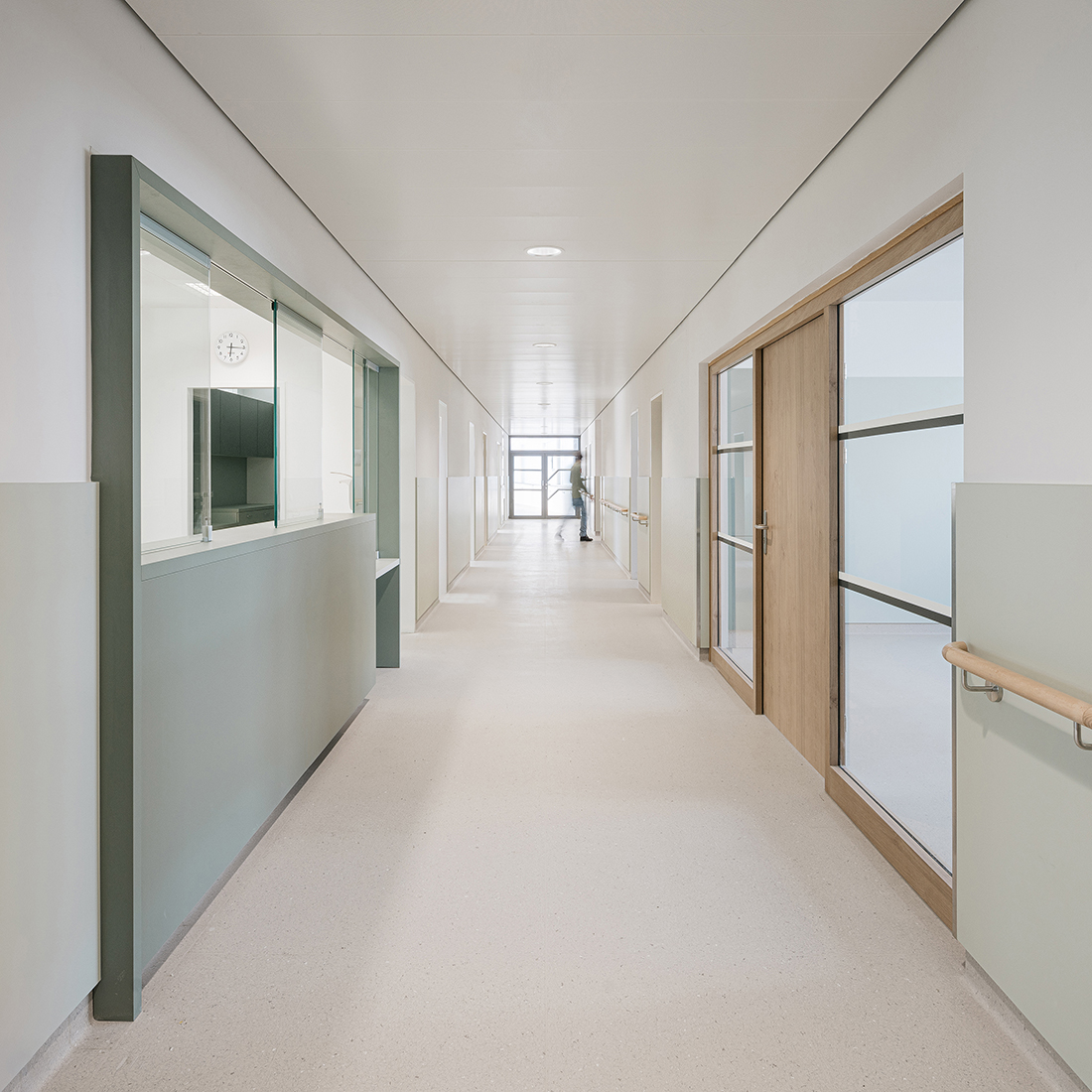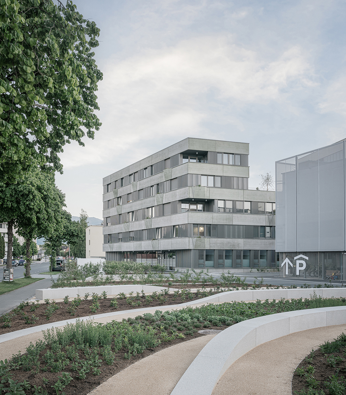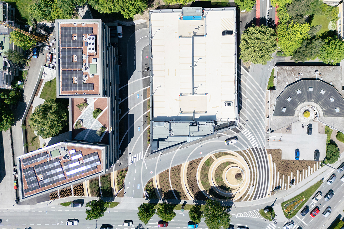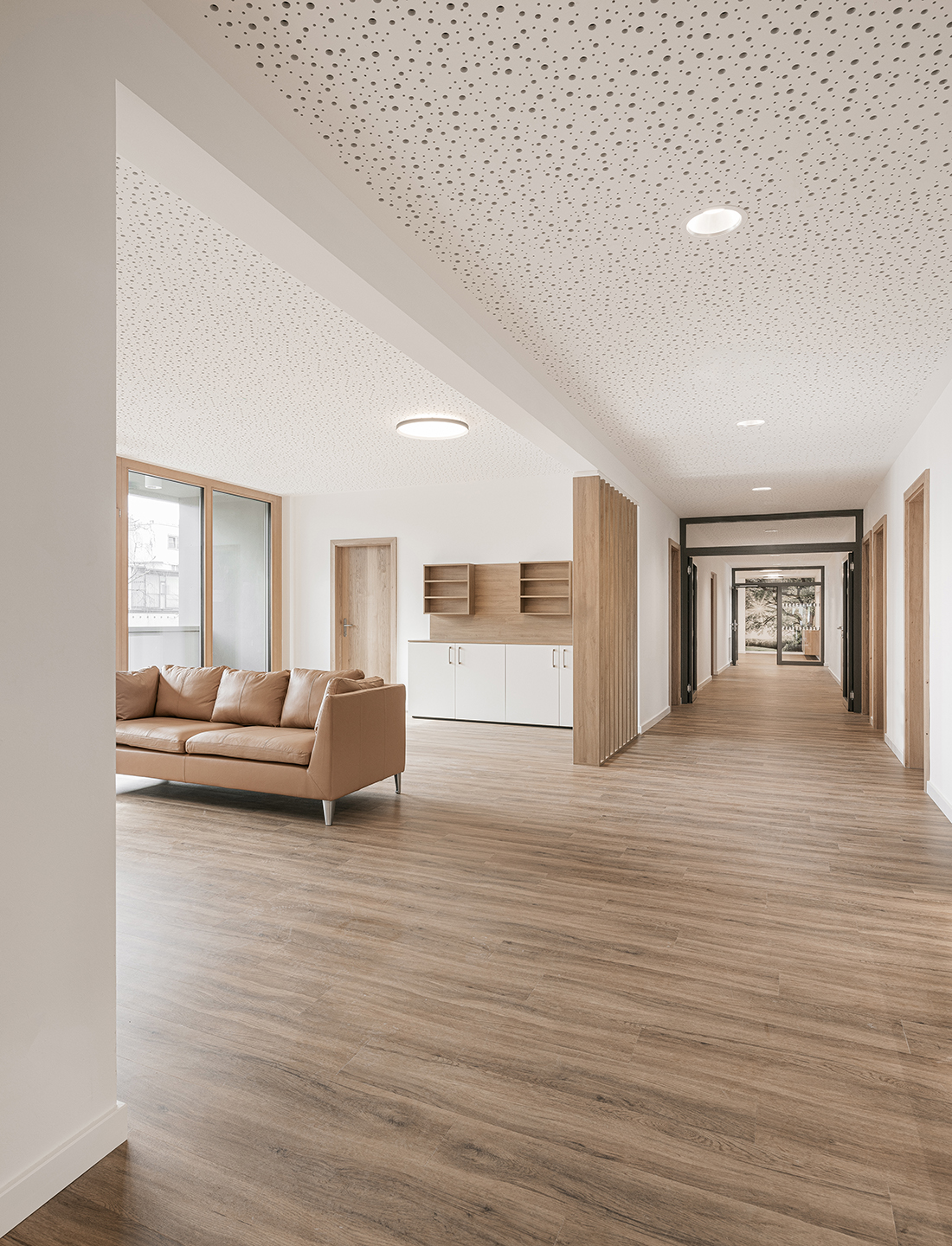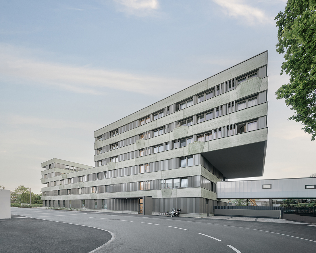 The Addiction Therapy Center Salzburg is the result of a cooperative planning process on the former parking site of the Christian Doppler Hospital. The project addresses the complex urban interface between public space and the hospital campus, previously fragmented by traffic and parking infrastructure. Together with adjacent developments, the building forms a new urban edge, responding to the intersection of Ignaz-Harrer-Straße and Guggenmoosstraße, reinforced by an award-winning landscape design.