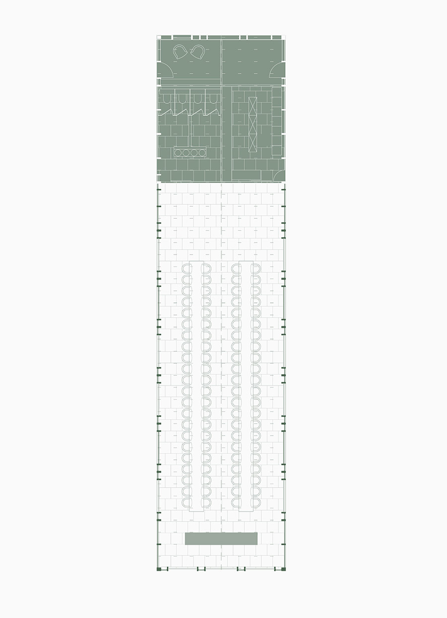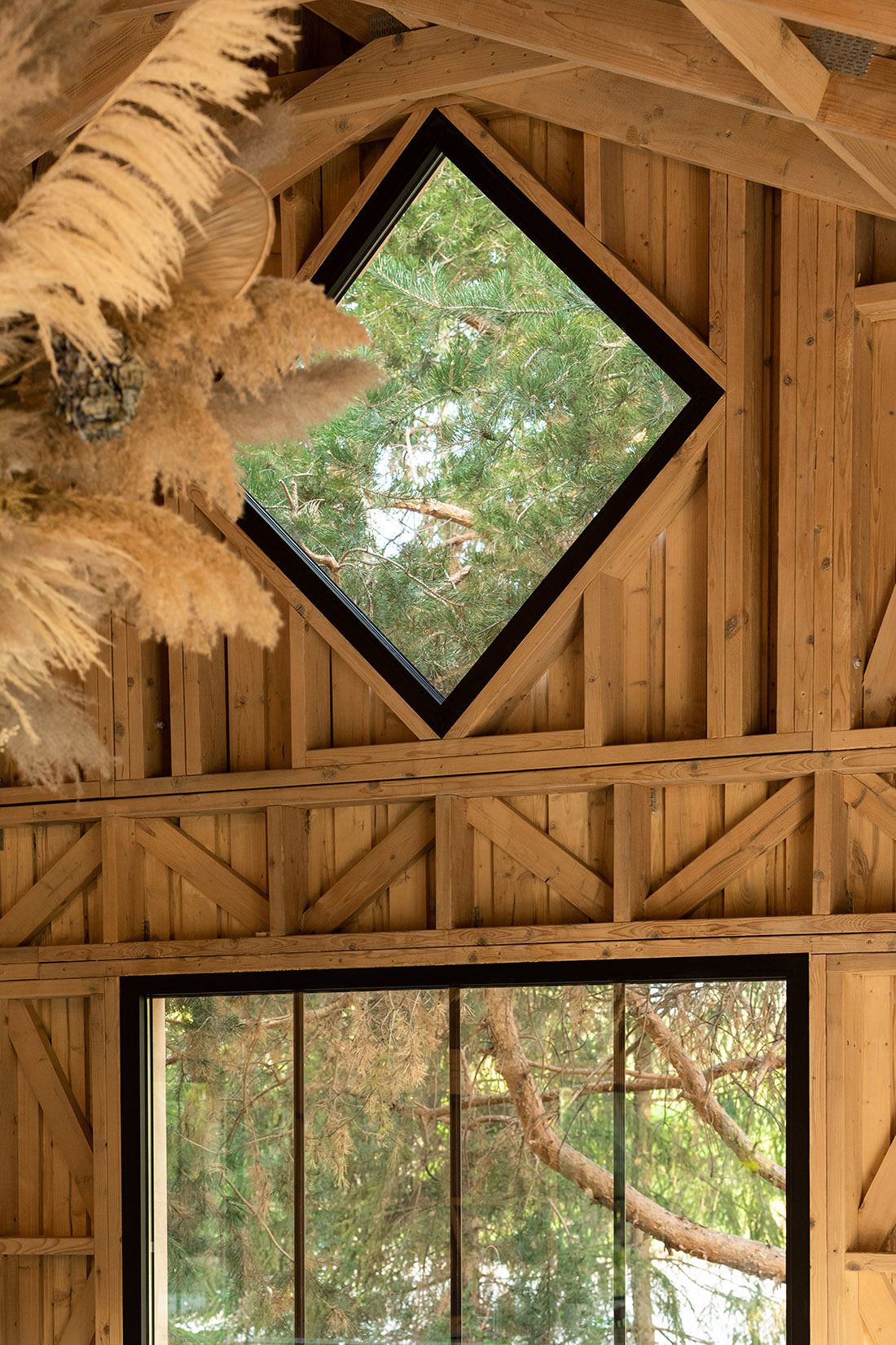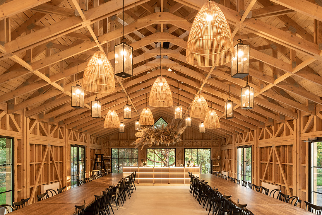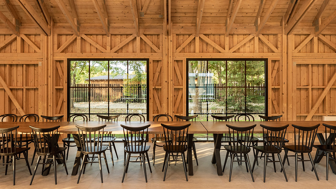 The primary objectives of the project were to preserve the existing vegetation and to position the building in a way that complements it. As such, the pavilion is a contextual response, aiming to harmonize with both the immediate elements of the site and the rural environment in which it is situated. Wood emerged as the ideal choice, not only for its sustainability but also for its aesthetic qualities, providing both the elegance of structure and a natural affinity with the surroundings. The challenge of constructing such a structure with simple, natural wood elements was to maintain a wide opening without the need for additional components.
