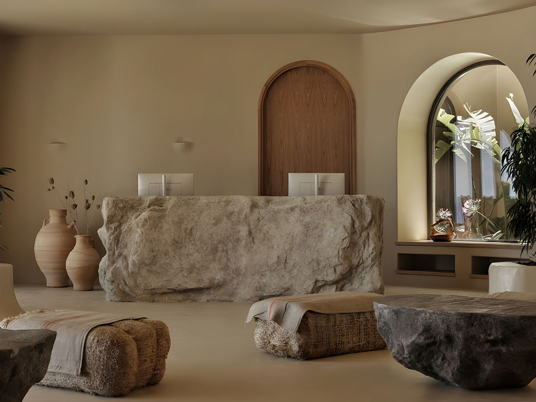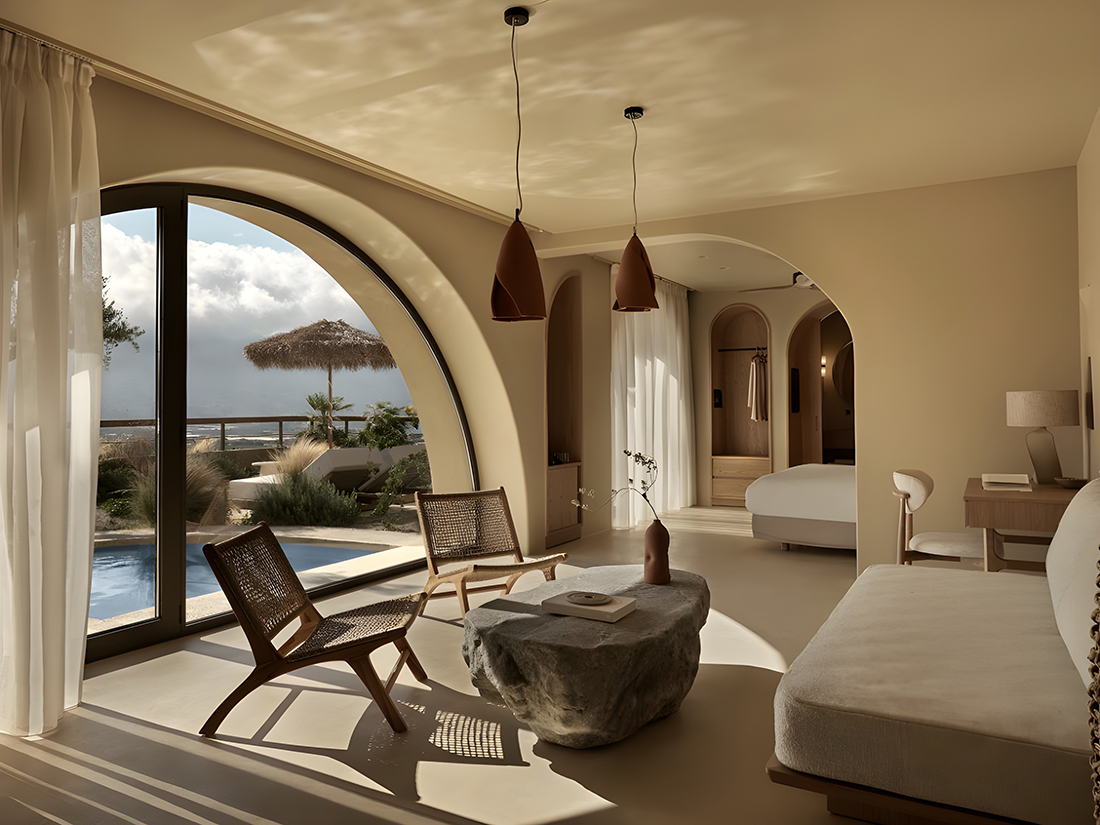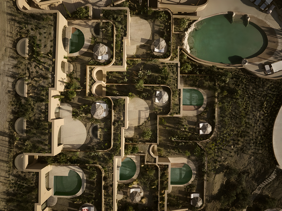 Set on an olive-clad hillside overlooking the Aegean, the hotel unfolds through a rhythmic composition of full and half arches, abstracted from Venetian and Ottoman geometries, translating Chania’s historic essence into light, texture, and tranquility. Interior surfaces of hand-applied microcement, tinted with Cretan mineral pigments, create a continuous, immersive, cave-like environment. Almost every room opens onto outdoor spaces of water, plants, lime mortar, and local gravel, forming tranquil microclimates that dissolve the boundary between architecture and landscape. Courtyards and terraces invite slower inhabitation, echoing the island’s balance between human craft and nature.