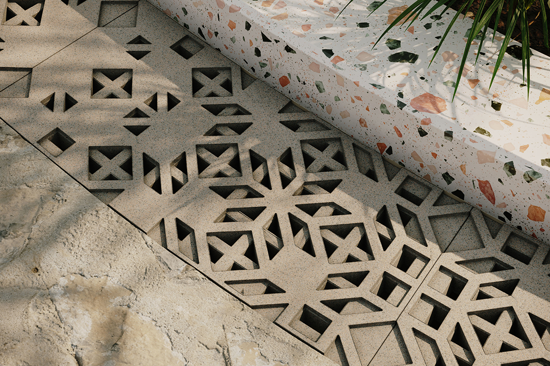 Tessera doesn’t reinvent the breeze block – it reimagines it for today. Three distinct blocks form a modular system that gives homeowners and designers the freedom to compose walls that are uniquely their own: playful yet structured, creative yet enduring. Tessera’s geometry draws from Arabic motifs, reinterpreted into a contemporary, modular language. Its three block variations combine into intricate patterns that echo regional heritage while remaining versatile – locally relevant and globally appealing.