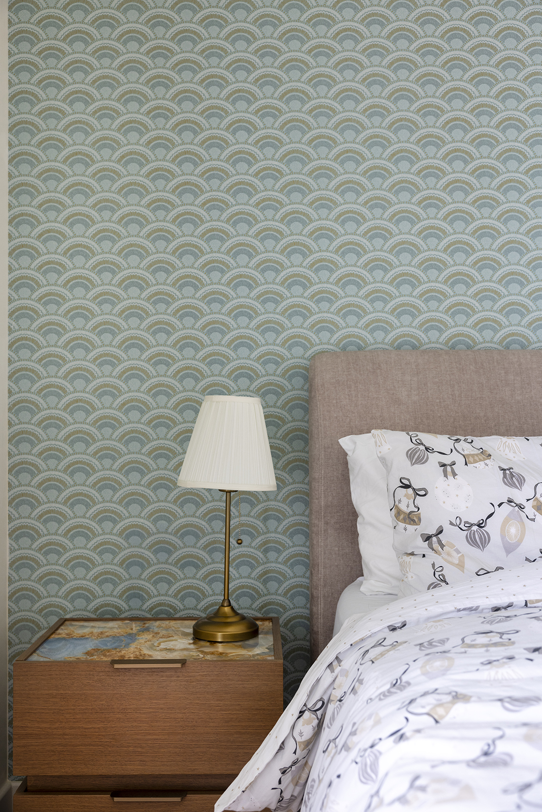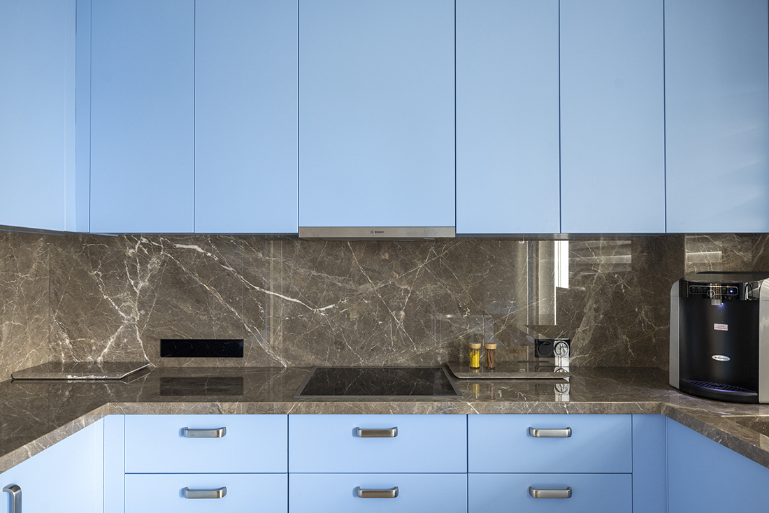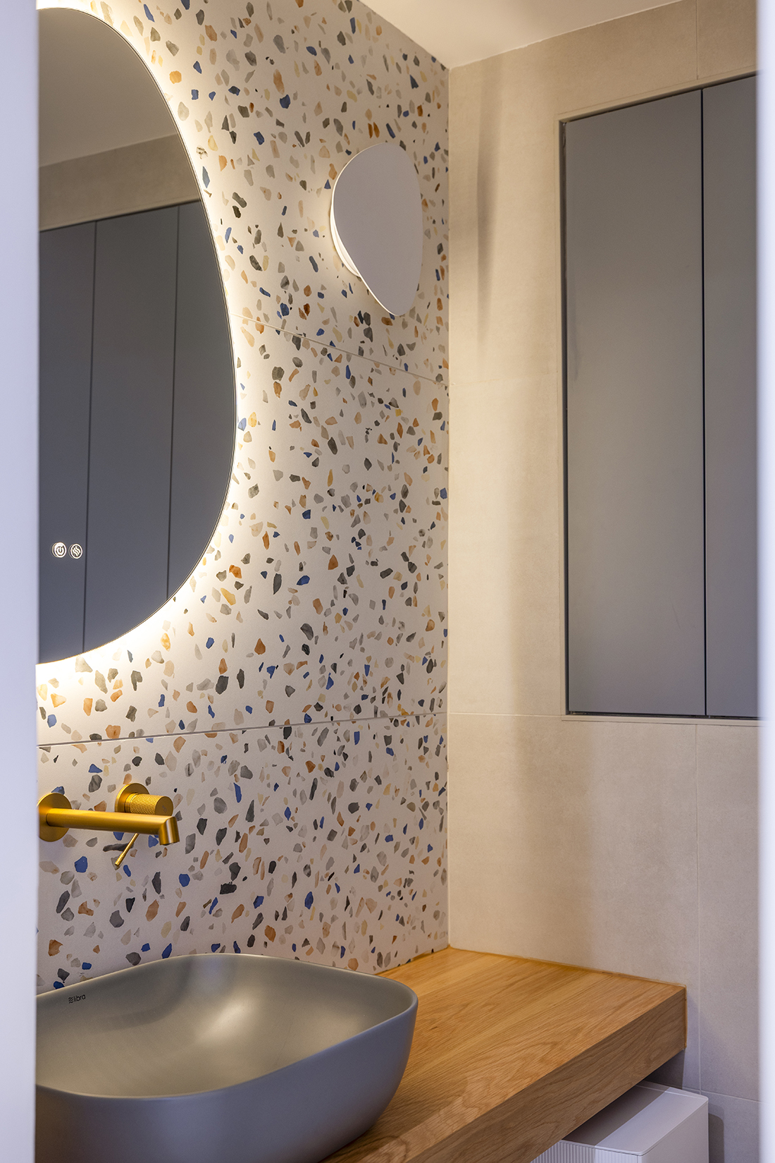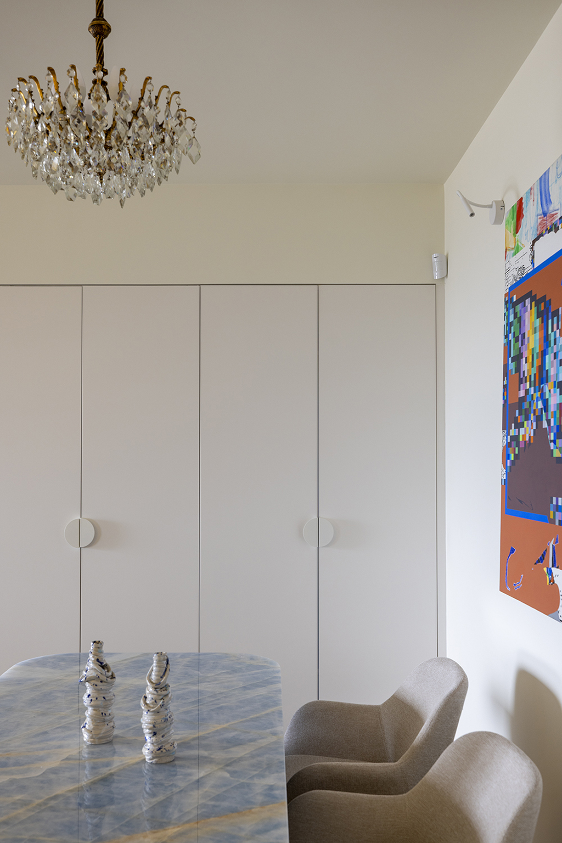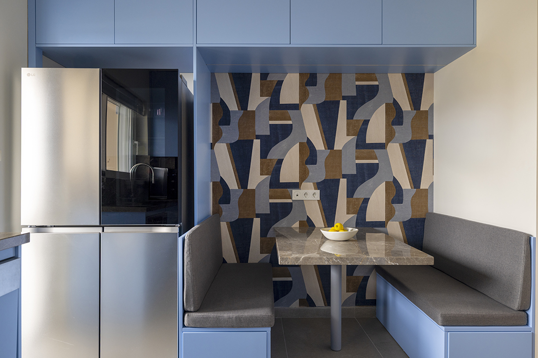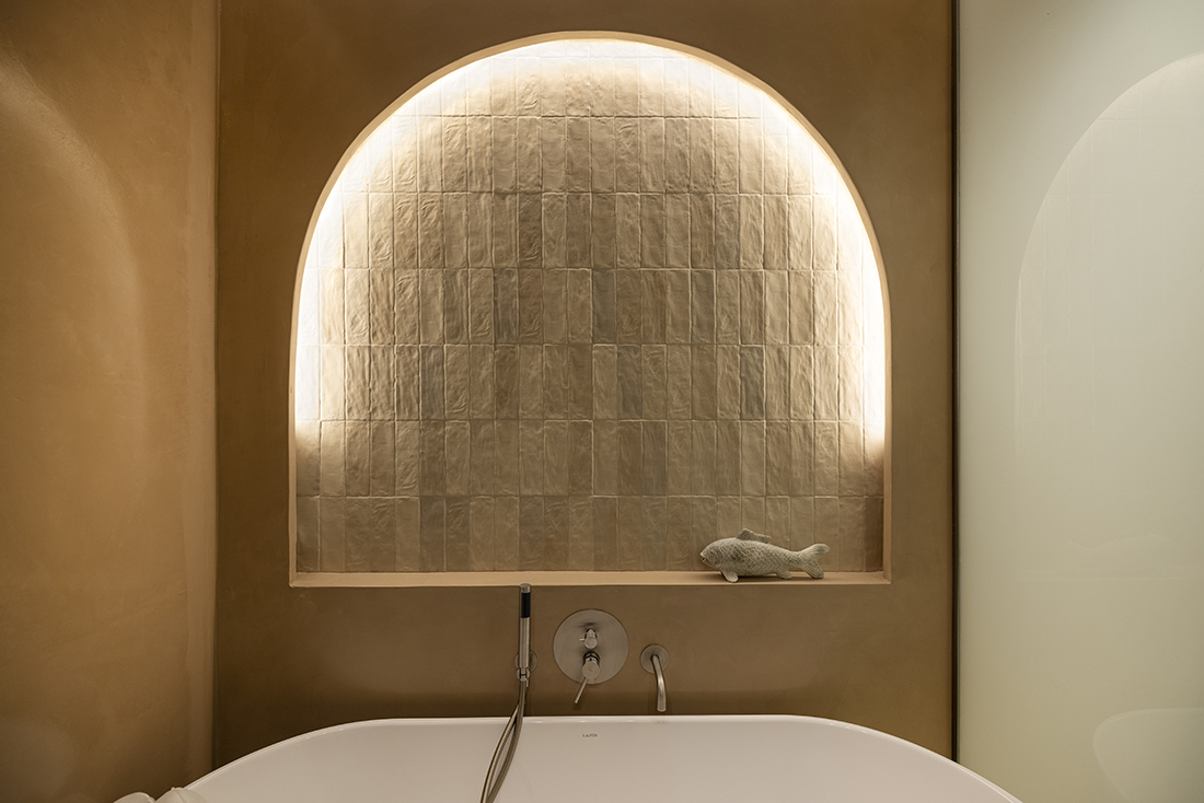 All storage elements are fully integrated and custom-designed, allowing each space to be defined primarily through pattern, geometry, and materiality. The kitchen is characterized by strong, almost graphic, geometries; the living area unfolds in a restrained palette of beige tones and travertine surfaces, while the dining space is anchored by a singular artwork. A solid color defines the transitional corridor, leading to a bedroom shaped by a soft, curved pattern language. Mosaic surfaces articulate the WC, while stone and polished cement render the bathroom tactile and grounded.