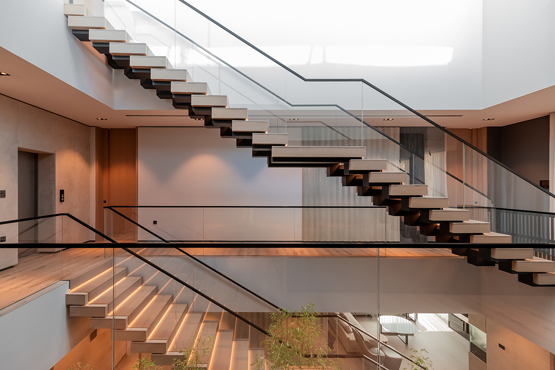 Nestled amidst the vibrant tapestry of Amman, Jordan’s capital, The Frame Residence stands at 1000m2 and is a testament to contemporary architectural elegance. At the heart of its design lies a double-volume atrium, a luminous space that serves as the soul of the home. Bathed in natural light pouring through a glazed roof, the atrium casts a soft glow on the surrounding living spaces, creating a dynamic interplay of light and shadow.