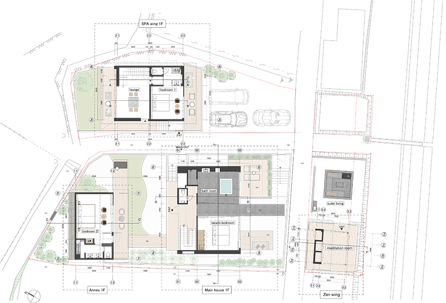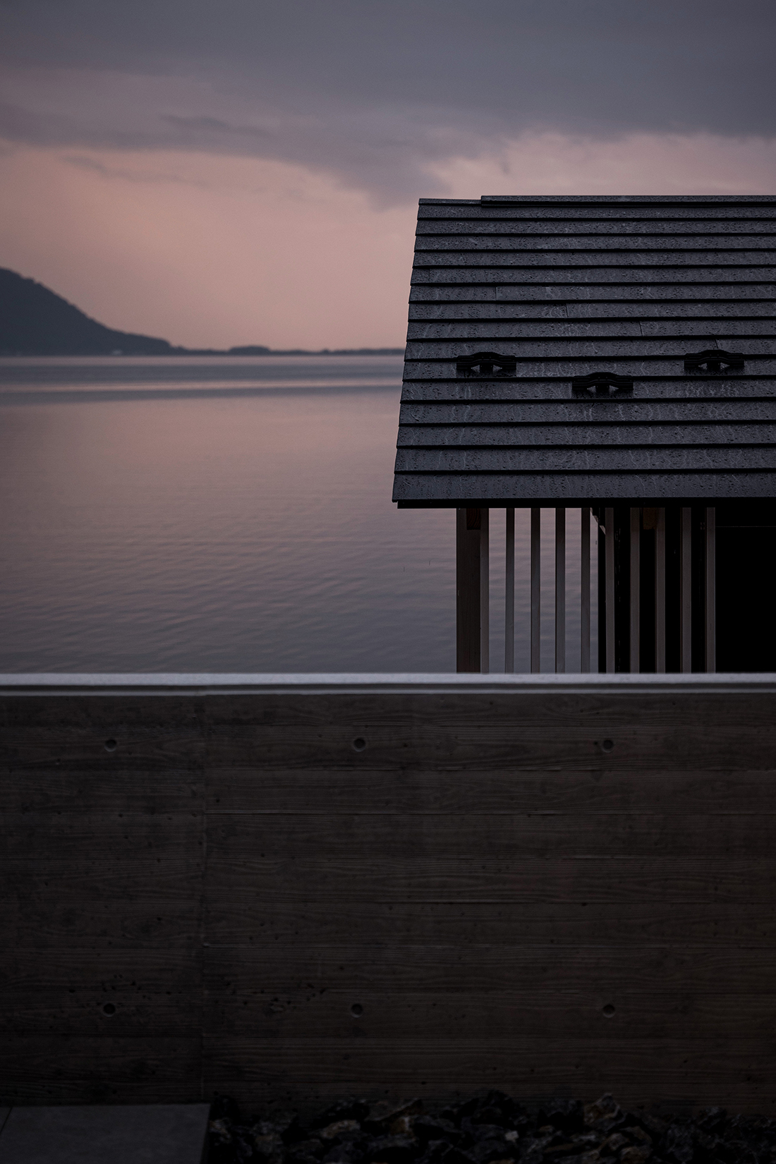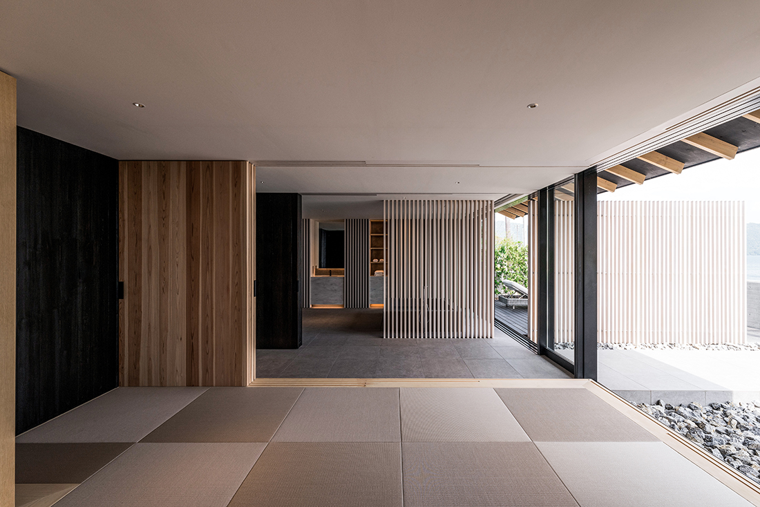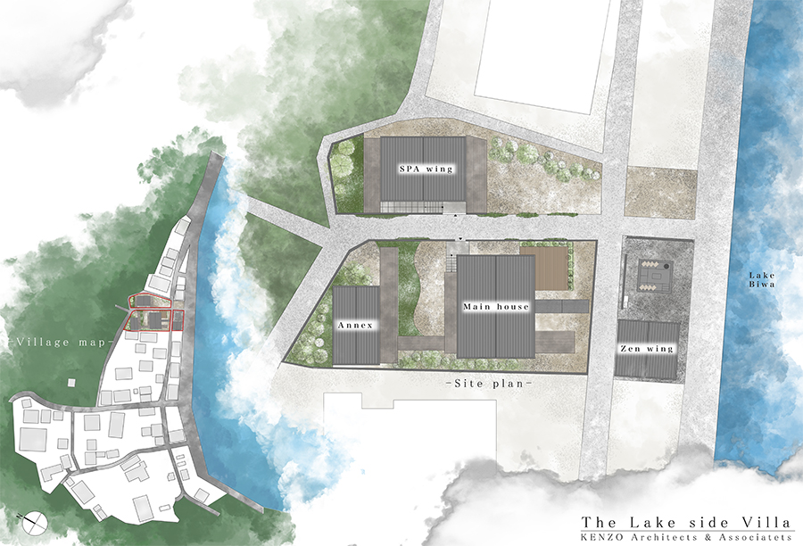 This villa is located at the far end of Lake Biwa, the largest lake in Japan. The design and volume of the villa were carefully determined to preserve the scenic views of the traditional village, using the public road that runs through the site. The villa is divided into four wings: the “main house” (living and dining rooms, bathroom), the “annex” (bedroom), the “SPA” wing (sauna, bedroom, lounge), and the “Zen” wing (outdoor living area, meditation room).