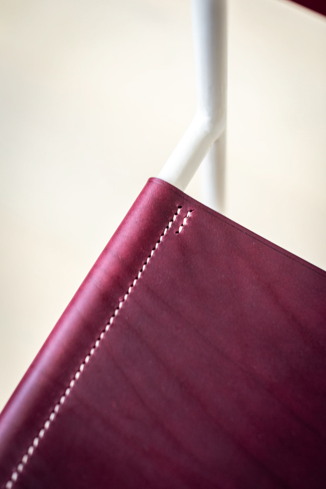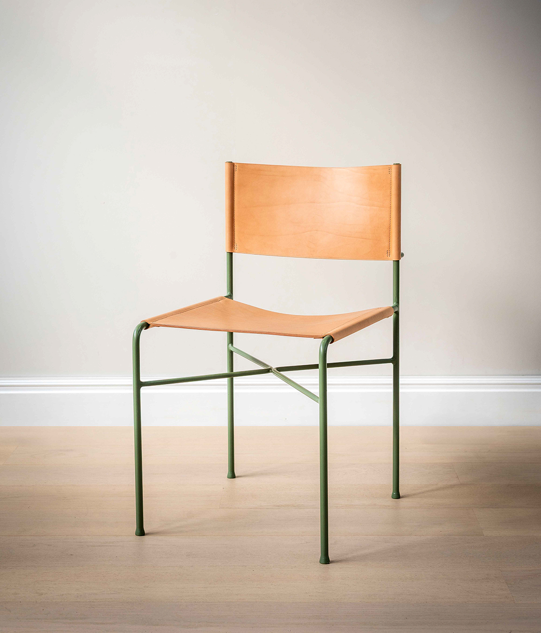 The seat and backrest are made from vegetable-tanned saddlery leather, cut from the shoulder panel to retain its natural grain. Constructed from a solid metal bar and reinforced with a 15-ounce canvas, the angle of the seat and back is carefully designed for maximum comfort, with canvas lining to prevent stretching. Each leather panel is individually hand-stitched to the frame using a traditional twin needle saddle stitch, ensuring durability and a rich patina that develops over time.