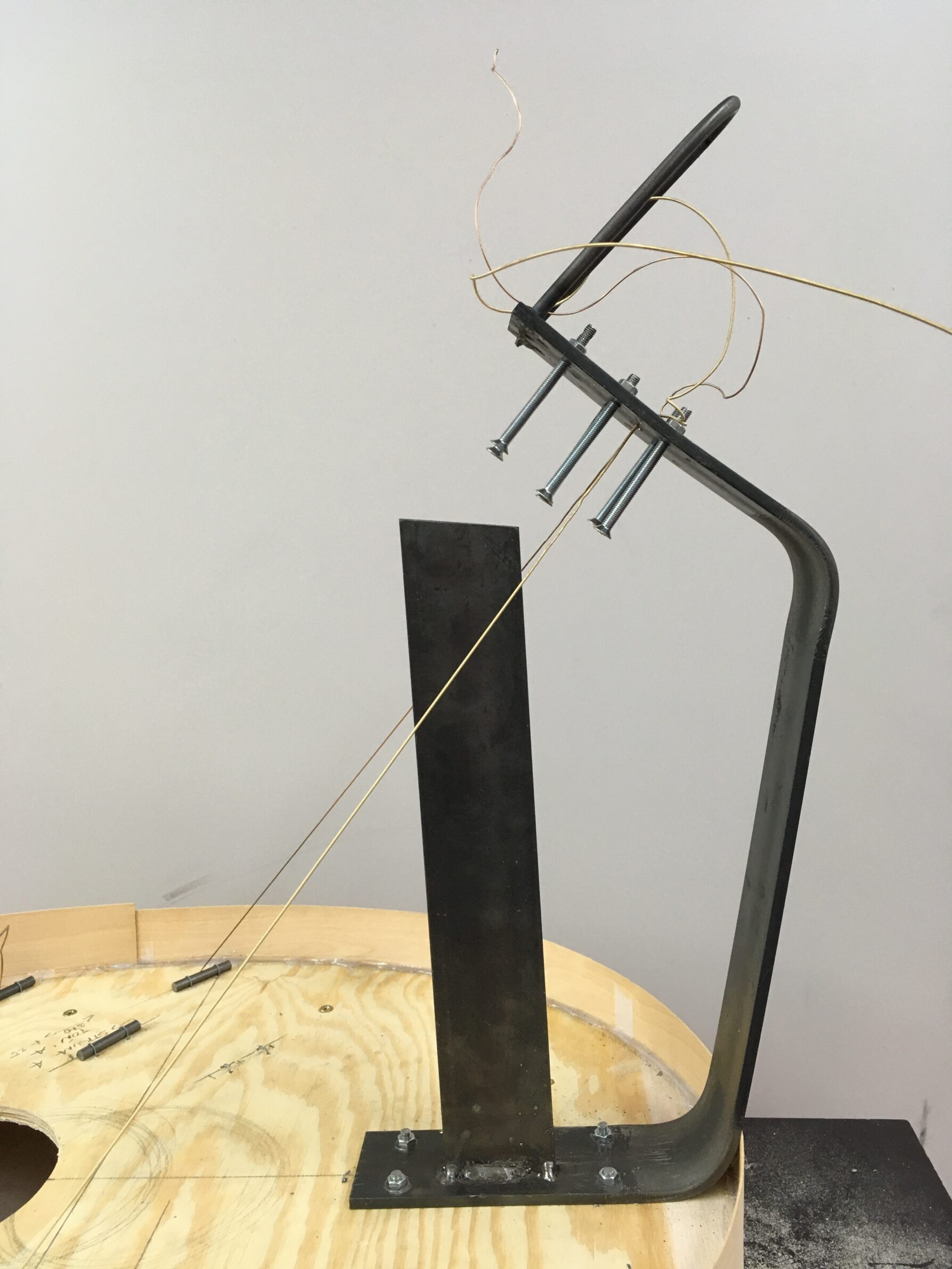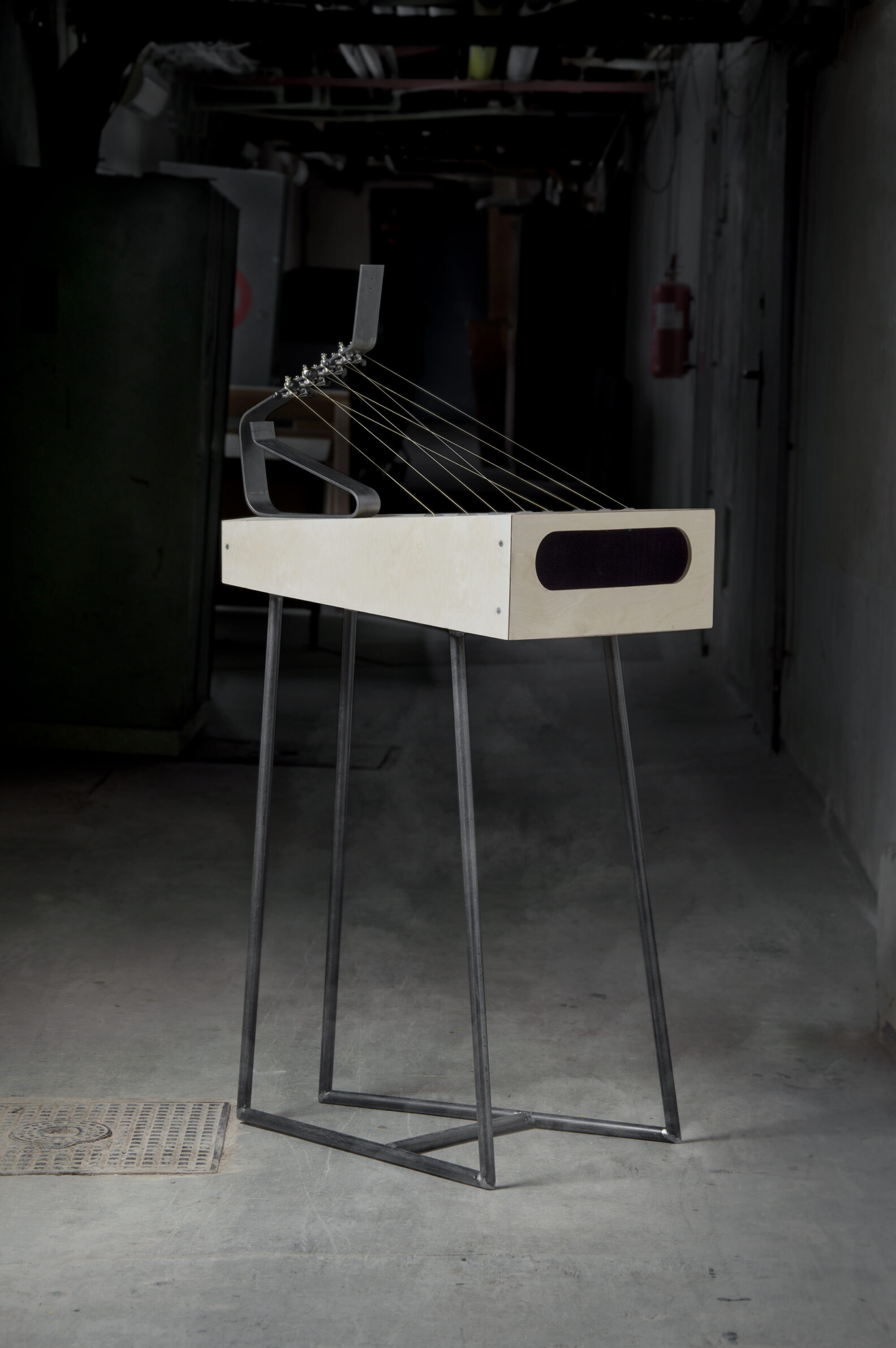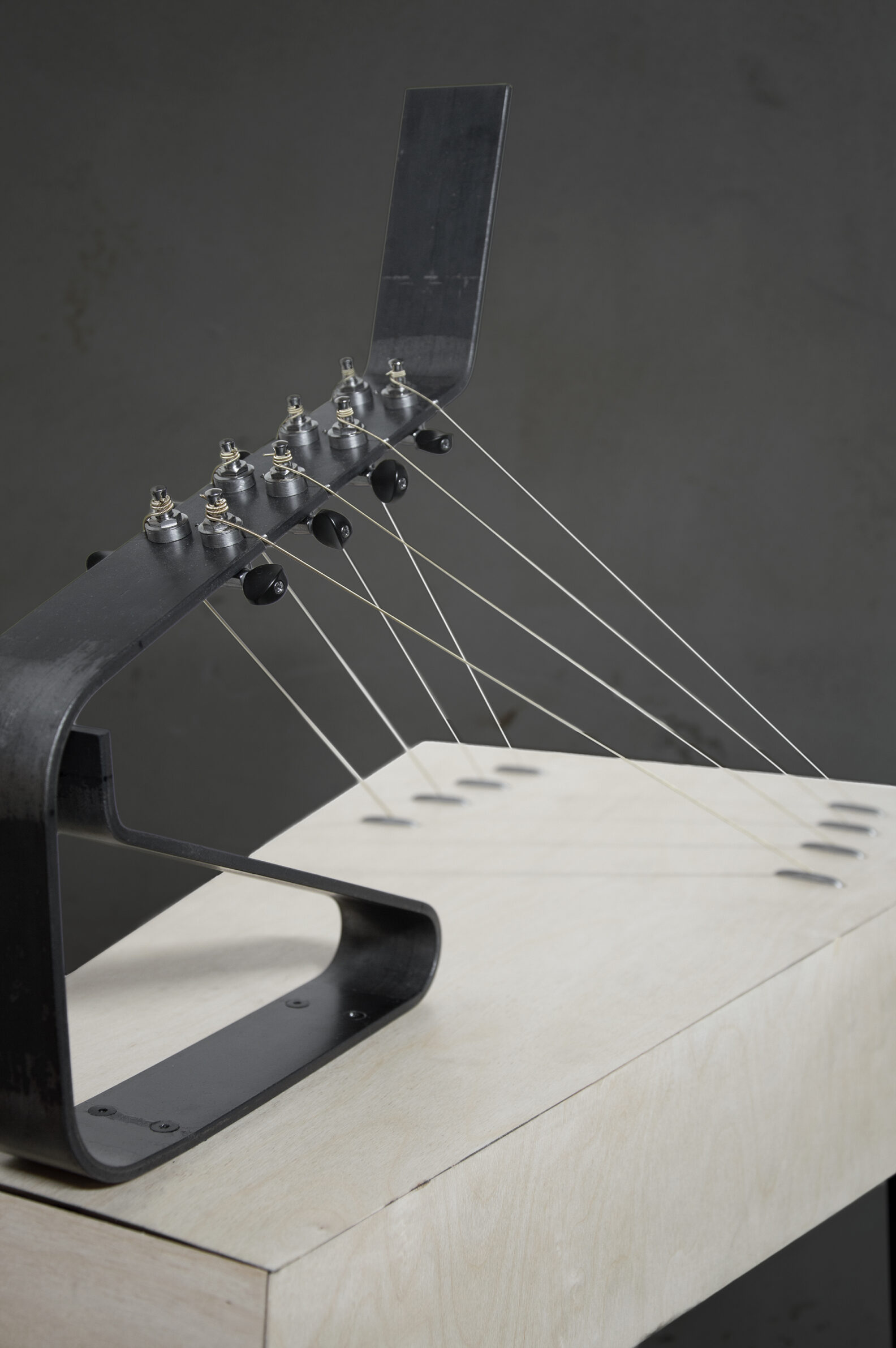 The design is based on the spring-like bending of a steel flat bar, where all curves arise purely from functional requirements. The upper part forms a lever that, when pulled back, increases the tension of the strings and thus changes their pitch. The lower inward-bent section serves a supportive role: under greater string tension, the part of the arm with the tuning mechanism braces itself, stiffens, and stops bending downward. At the same time, it retains the flexibility necessary for the aforementioned modulation.
