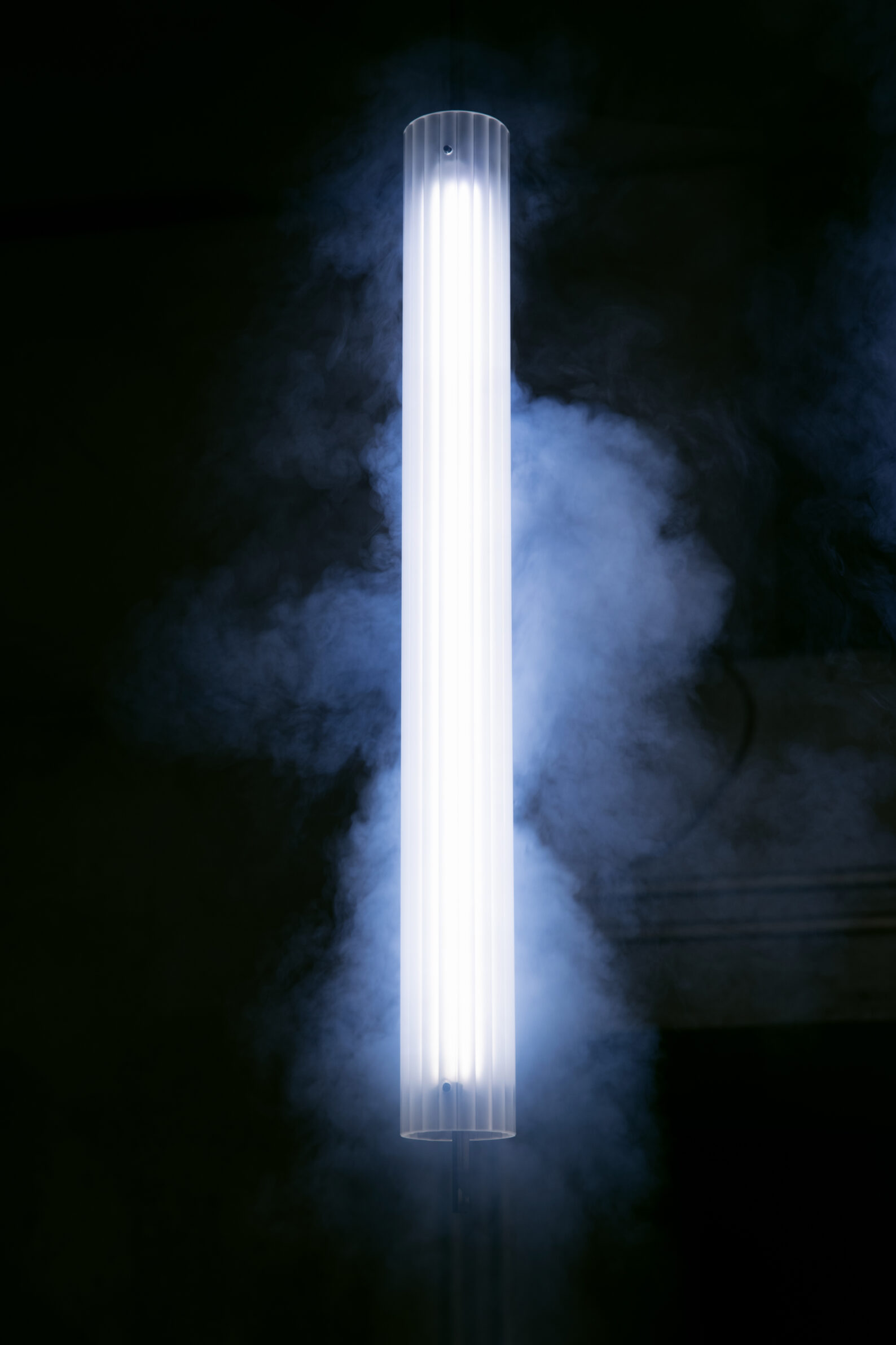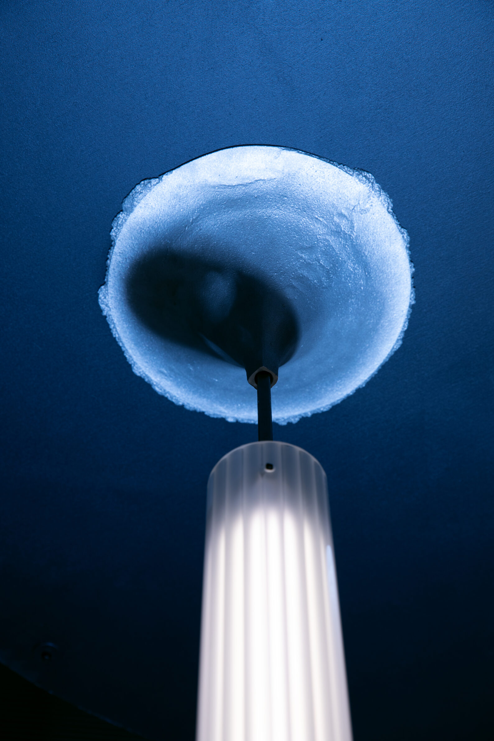For this reason, I worked with raw materials—steel, aluminium, and prefabricated borosilicate tubes that carry an industrial imprint. After casting the aluminium canopies, I preserved their imperfections, particularly the rough texture left by the sand mold and subsequent sandblasting. The glass tubes are sandblasted from the inside, as if capturing the smoke of raves—the intangible spirit of these ritualistic events enclosed within a fragile glass shell. The entire light is pierced by a steel profile left in its raw state, its vertical line referencing lighting elements frequently used in stage design.