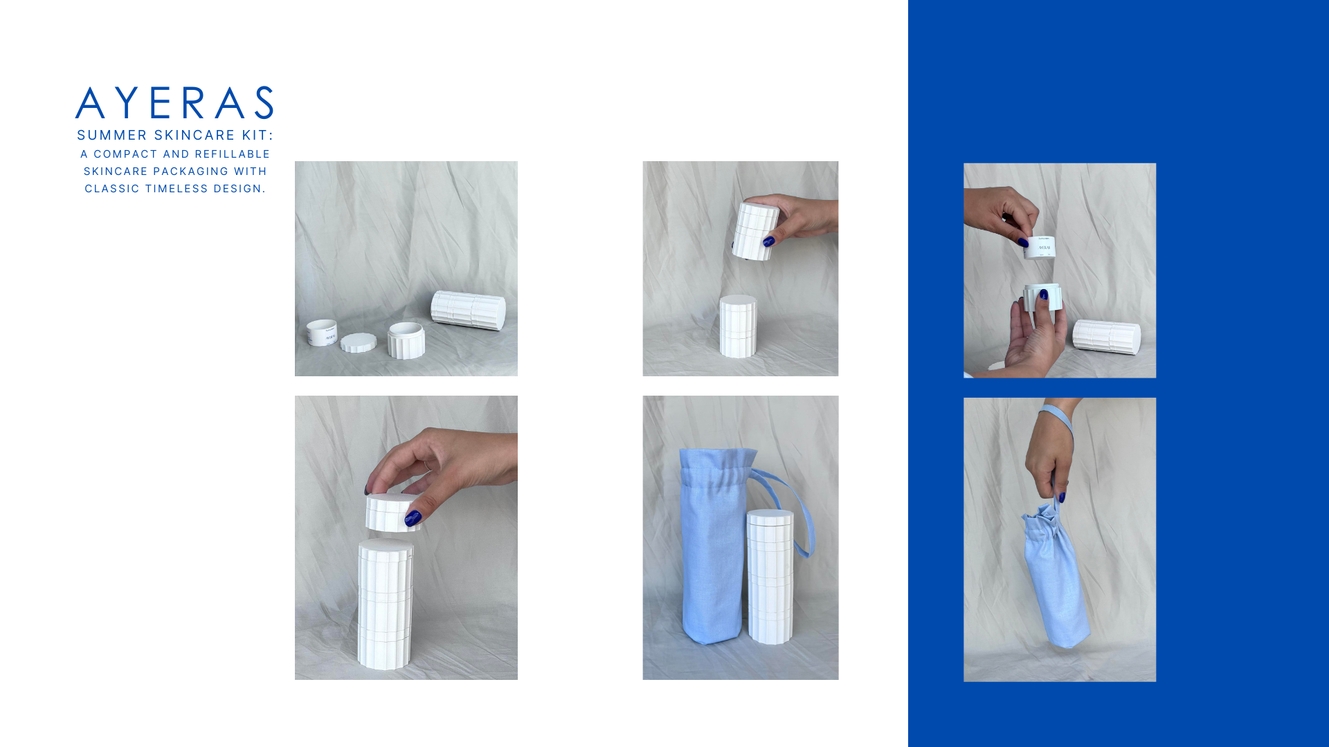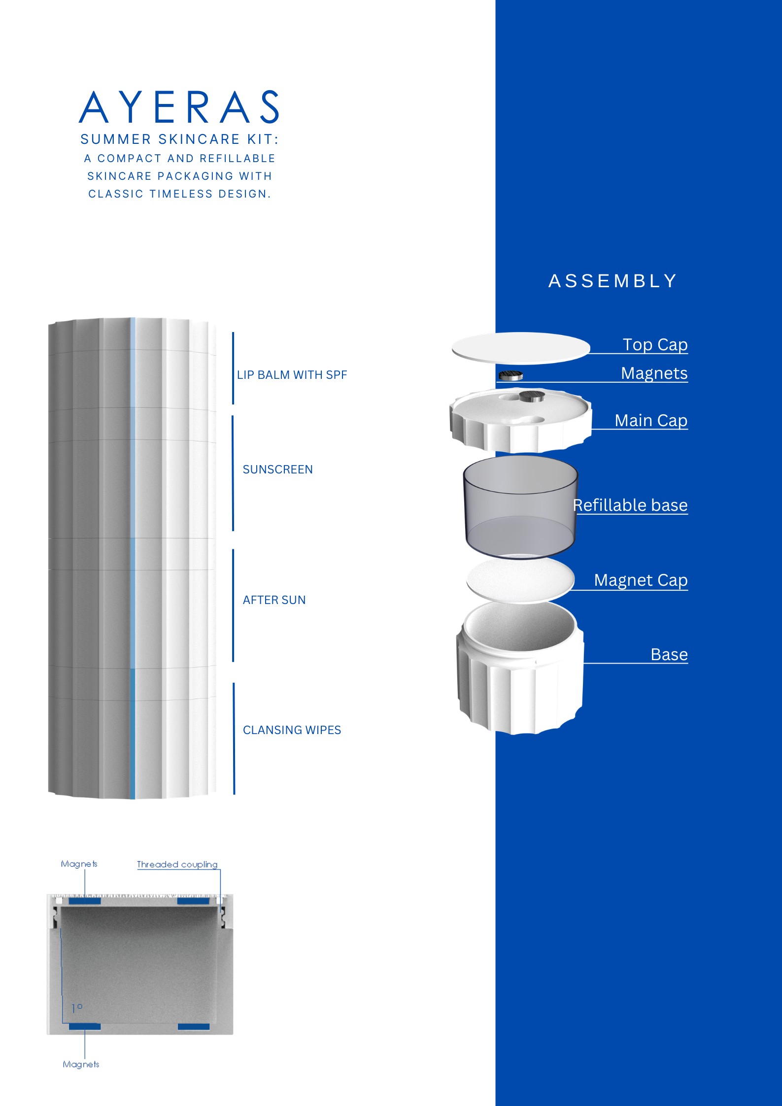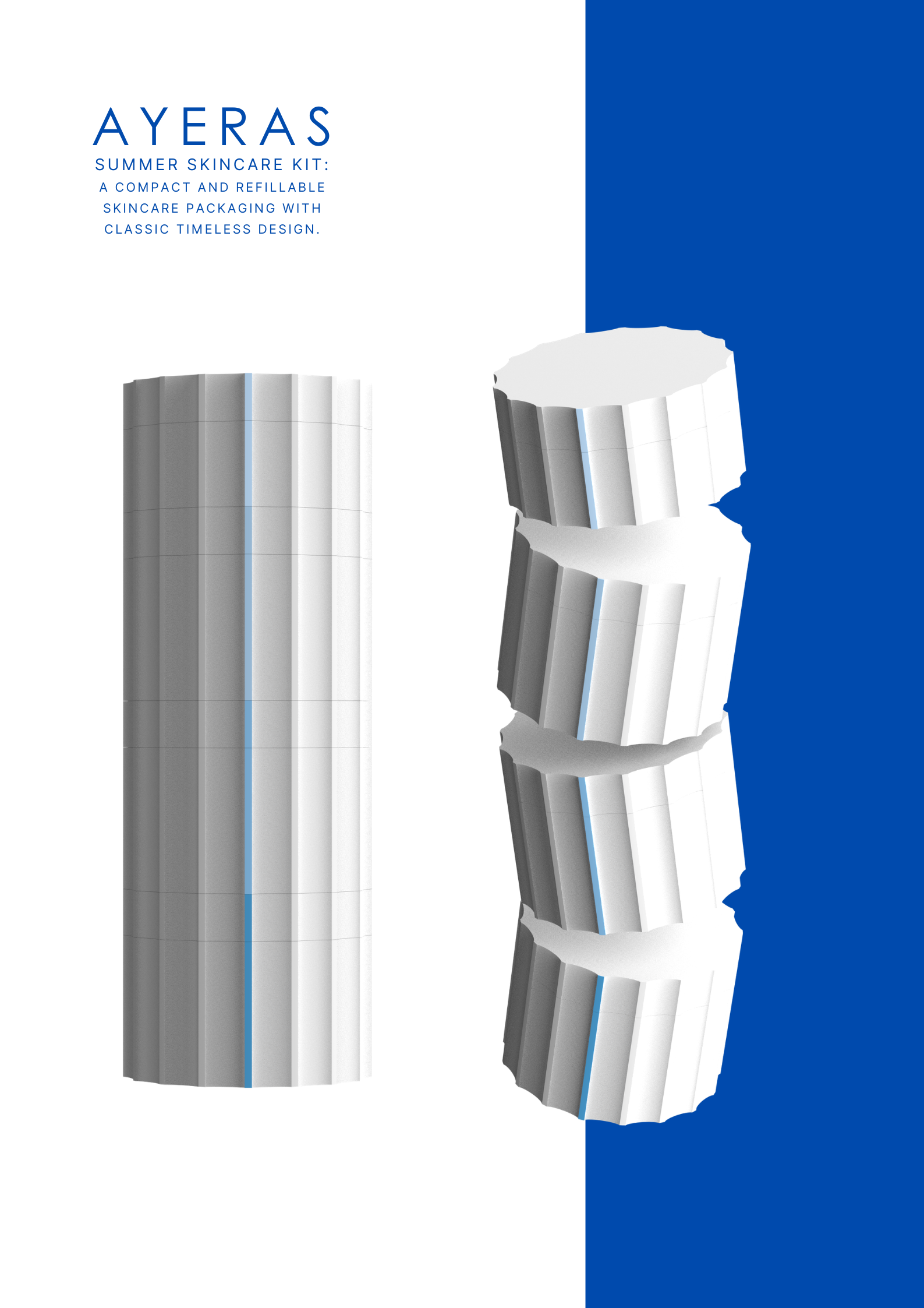 Ayeras is a summer skincare kit designed as compact, reusable, and refillable packaging, combining timeless elegance with functional precision. The kit consists of four individual product cases, linked together with magnets, allowing users to organize, rearrange, and refill them as needed. The design is inspired by ancient Greek column ruins, translating their proportion, structure, and architectural presence into a modern object. Its form emphasizes clarity and balance, creating a sense of order and calm that enhances the ritual of self-care.