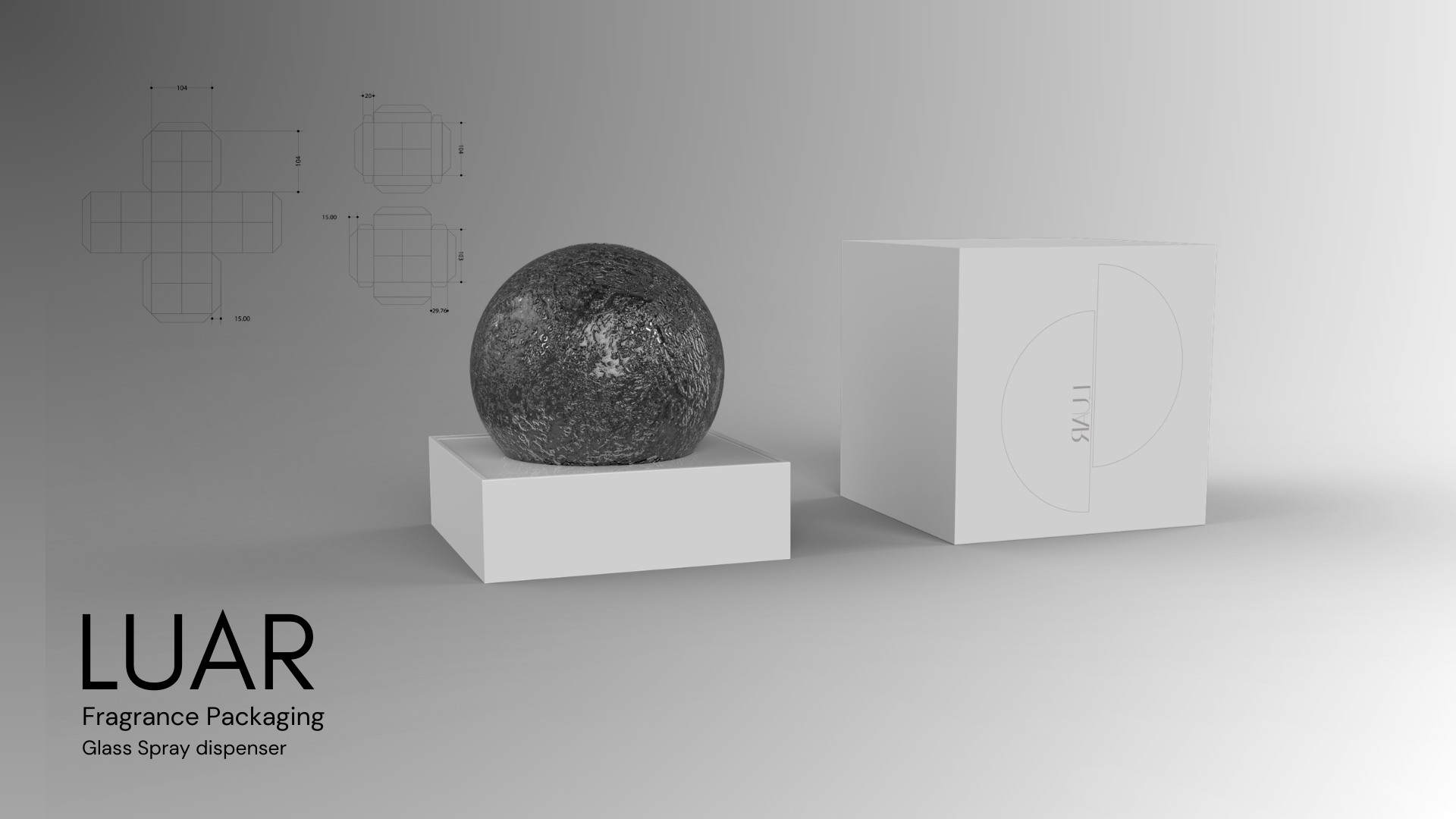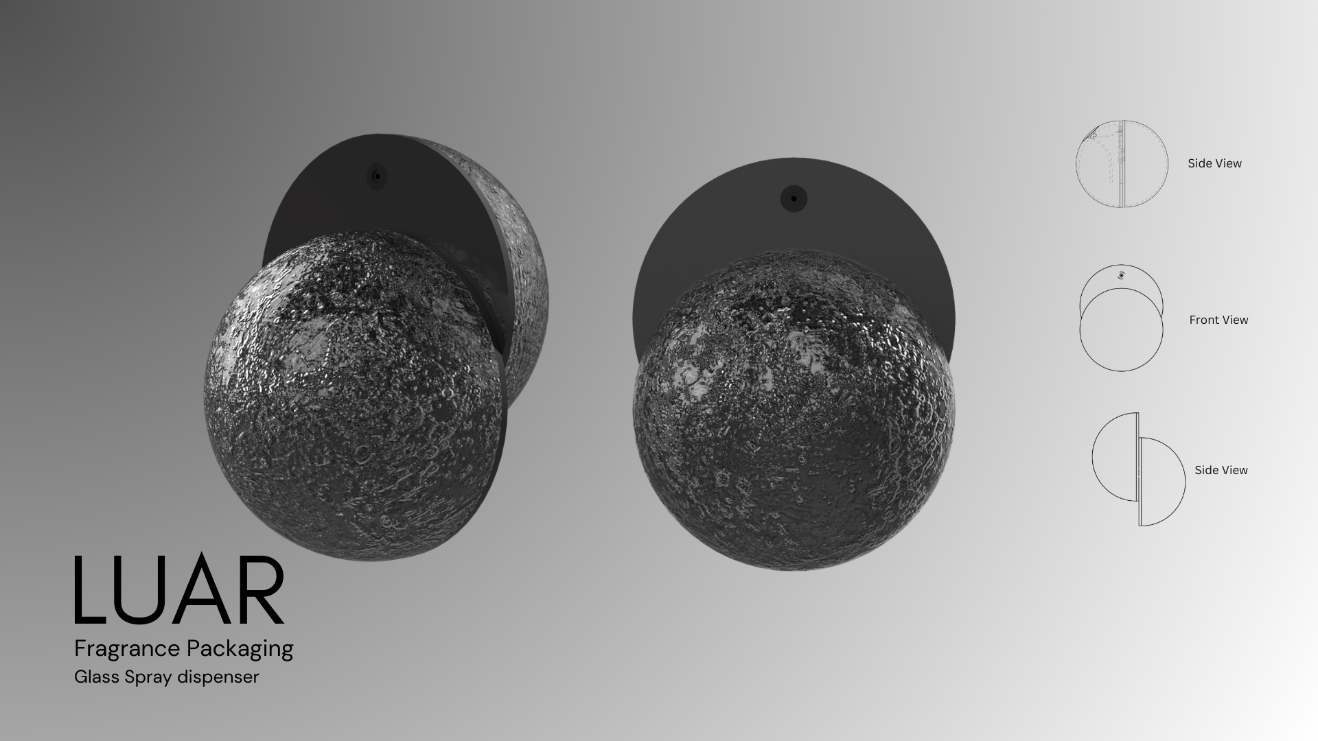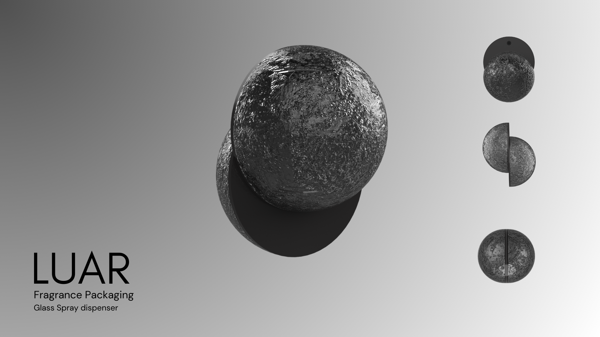 Luar is a fragrance bottle inspired by the moon’s first and third quarter phases, crafted entirely from glass. The form is based on the division of a sphere into two hemispheres, reflecting the visual similarity of these lunar phases while revealing their deeper contrasts. The design embodies the intersection of structure, narrative, and user experience, where design functions simultaneously as object and concept.