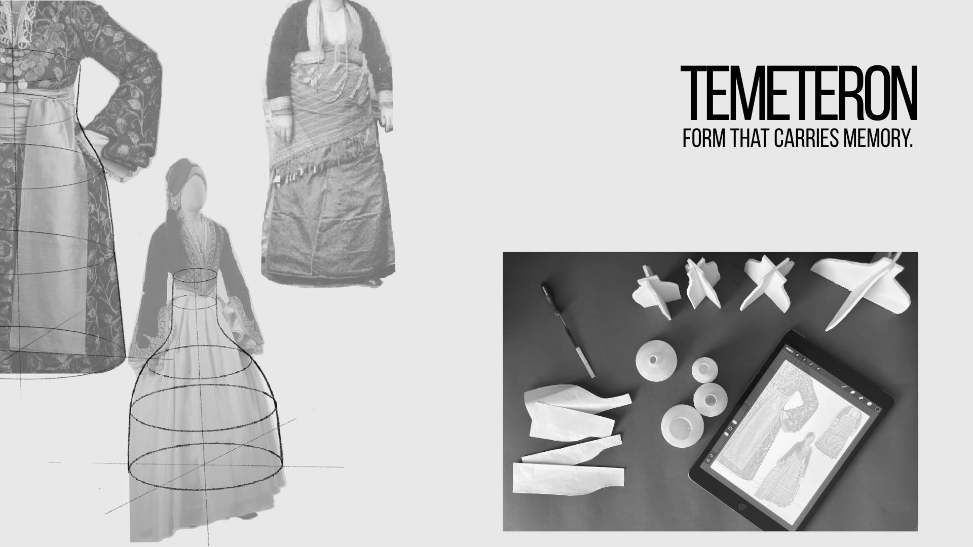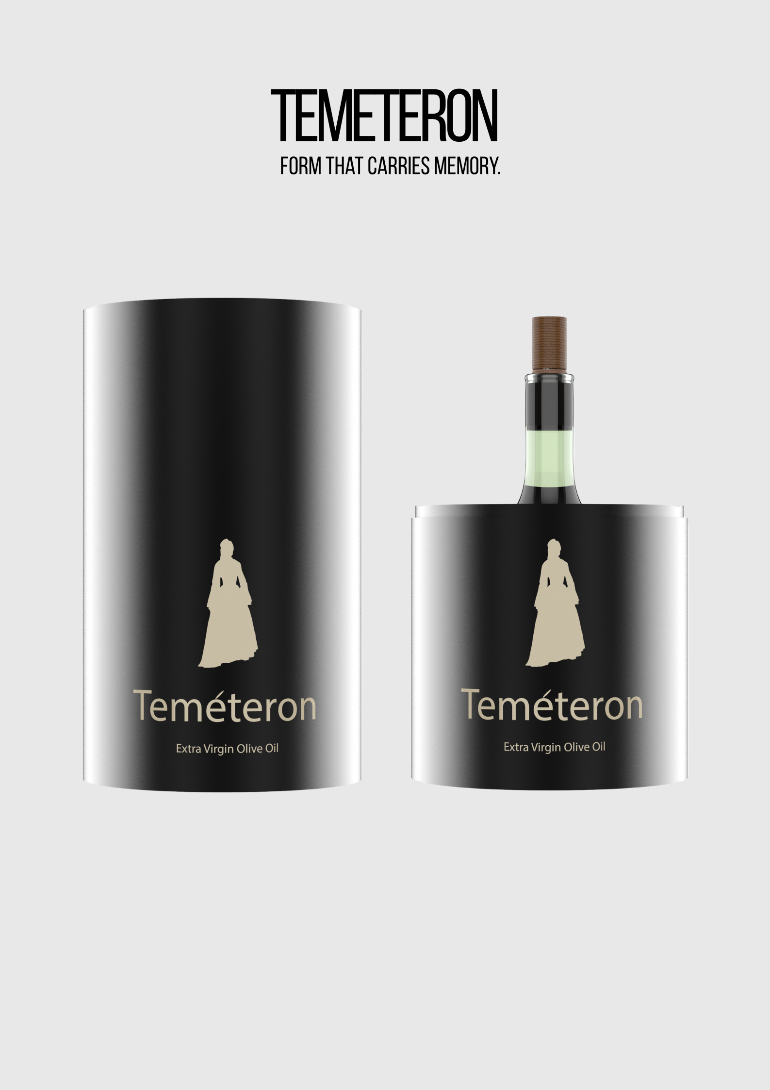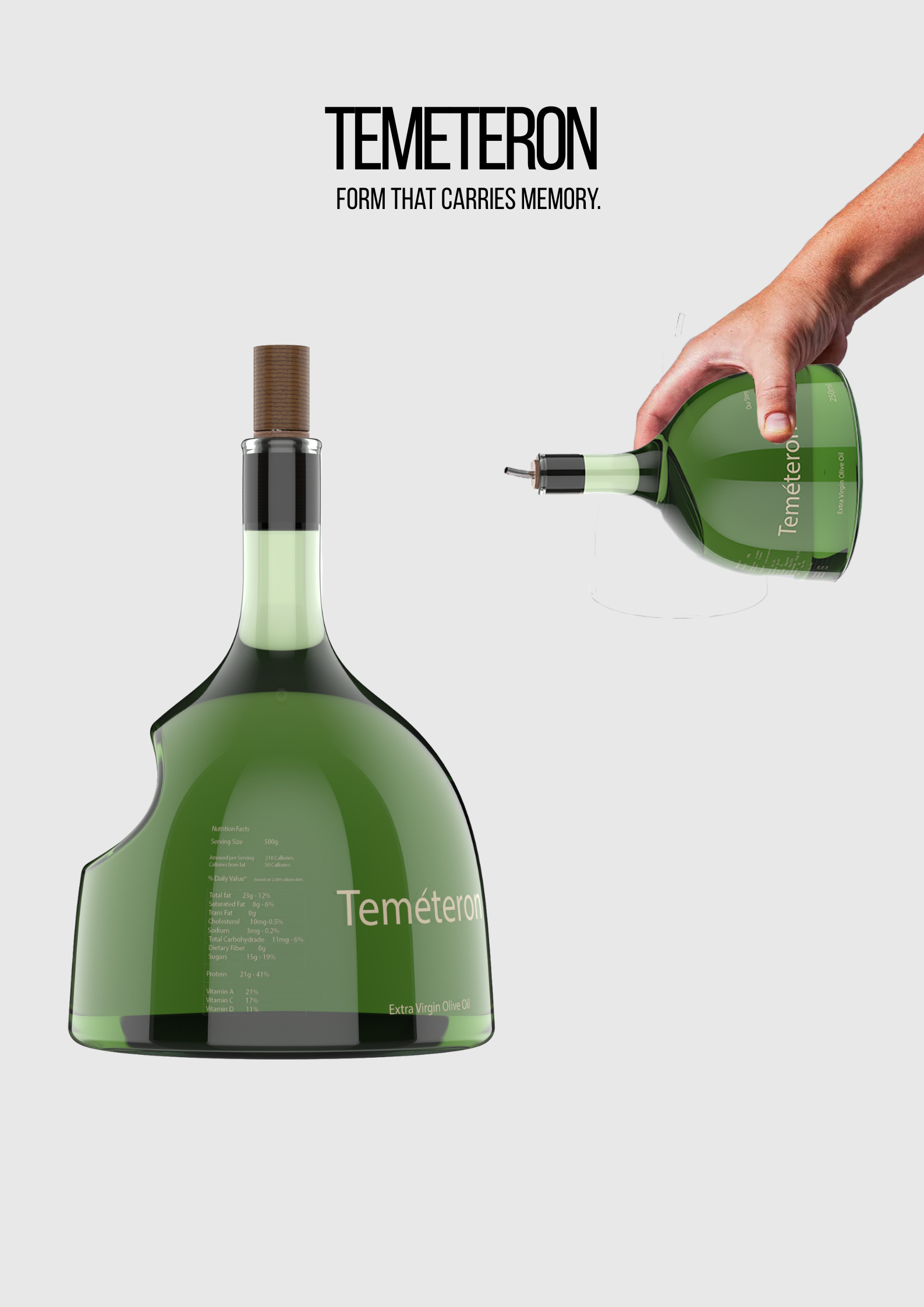 Temeteron is an olive oil bottle whose name, meaning “ours” in the Pontic dialect, reflects shared identity and heritage. The design is inspired by the shapes and folds of traditional Pontic costumes, translating these forms into a contemporary bottle. Treated as a narrative object rather than simple packaging, it uses proportion, material presence, and a curved cut-out surface to improve usability, making the bottle easy to hold and pour despite its larger size. Sustainability guided material choices and lifecycle considerations, reflecting an approach where design operates as both system and story.