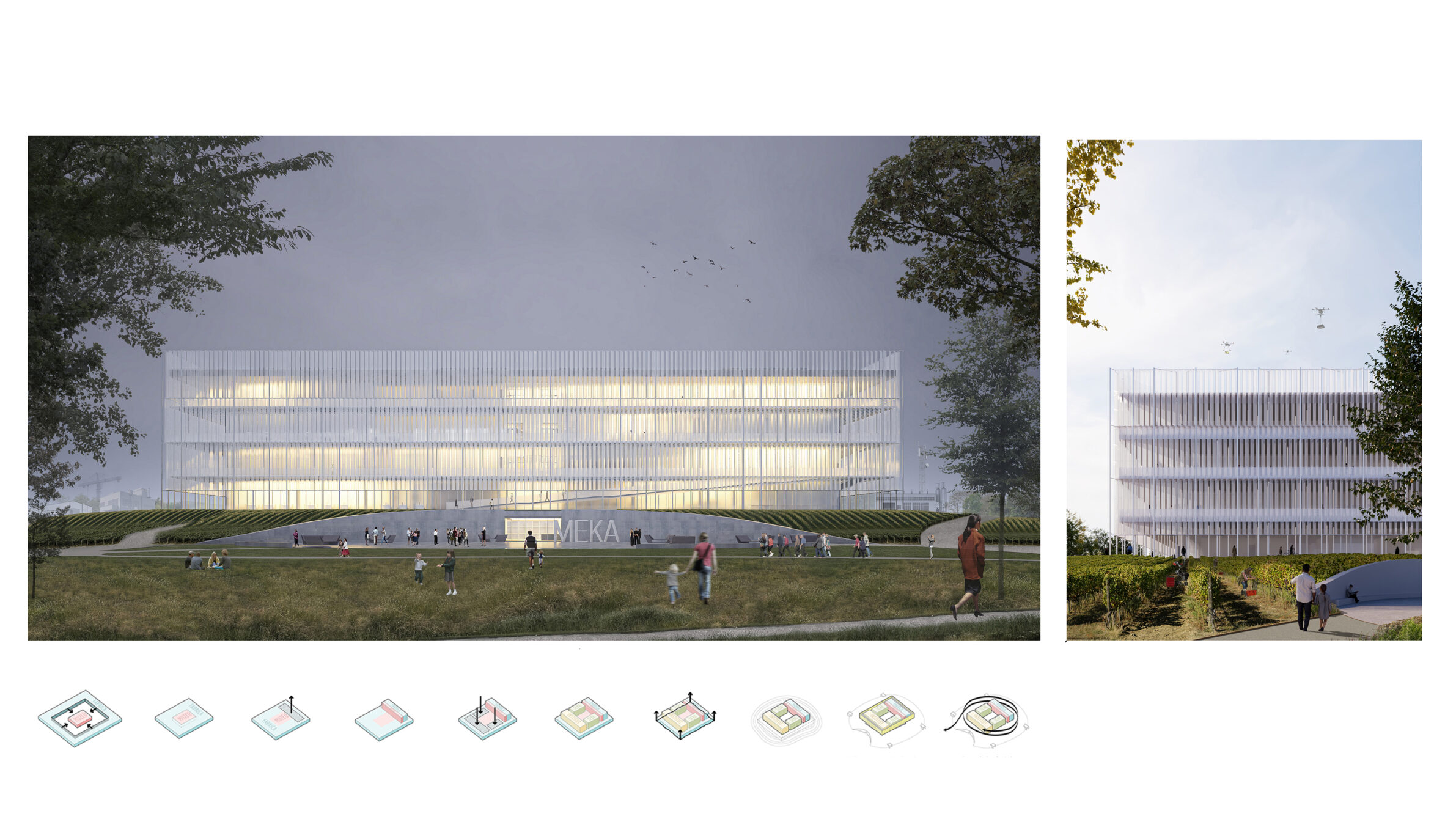 Born from waste, M.E.K.A. builds an architecture of communion, turning waste into resource, the factory into public infrastructure, and recycling into a cultural act. Set within the recovered structure of the former Mecatim platform in Timișoara, the Museum of Ecological Knowledge and Awareness unites three programs: a plastic recycling plant, an applied research institute, and a museum. Architecture becomes part of the technological and social chain: filament production, 3D printing, material research, and the public visibility of the process form one coherent system. A modular structure, made partly from recycled plastic and local resources, supports courtyards, technical zones, and exhibition rooms, all stitched by a continuous public route. Plastic, both raw material and architectural expression, is recovered and returned to the city, making recycling a founding gesture.