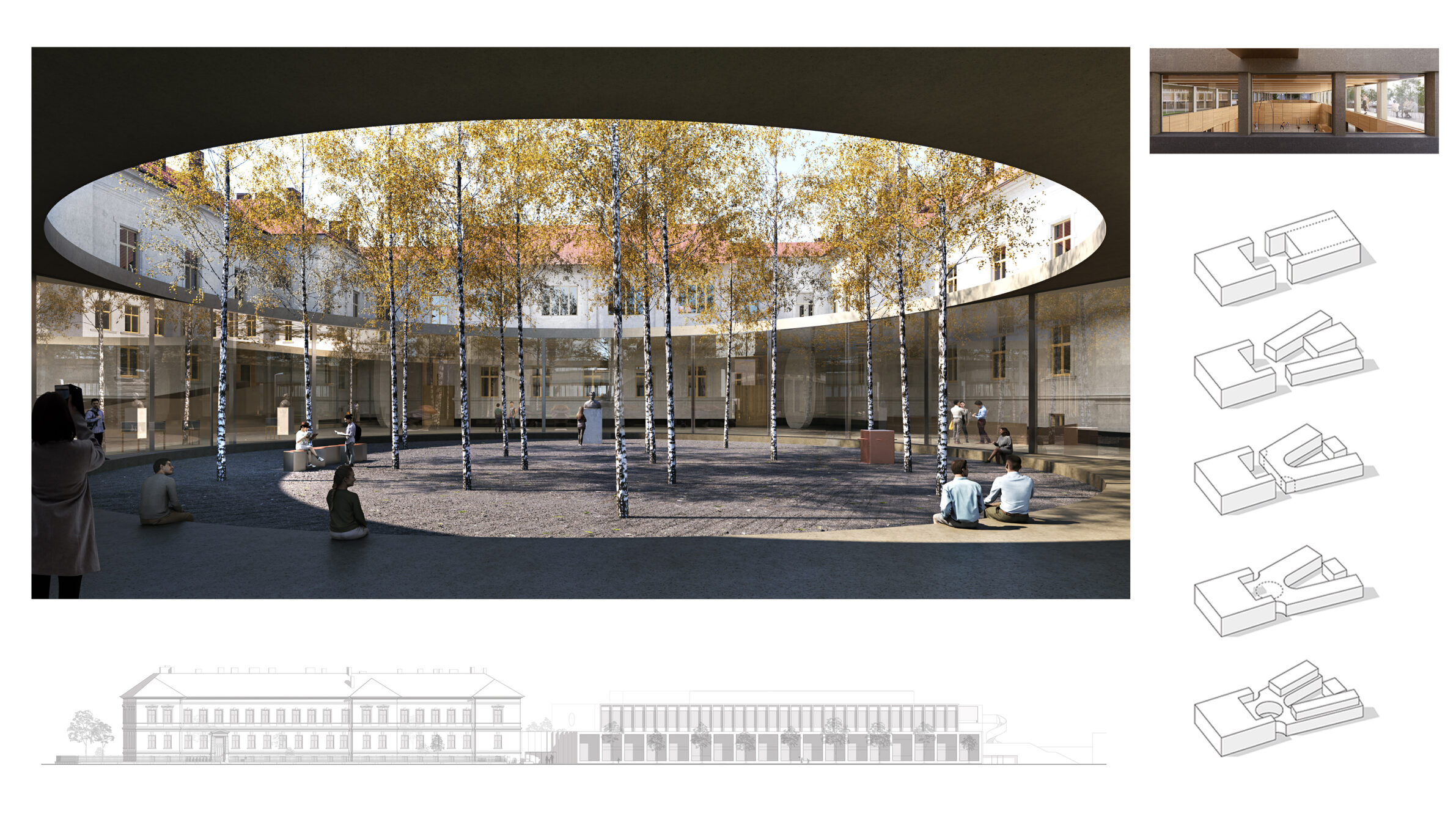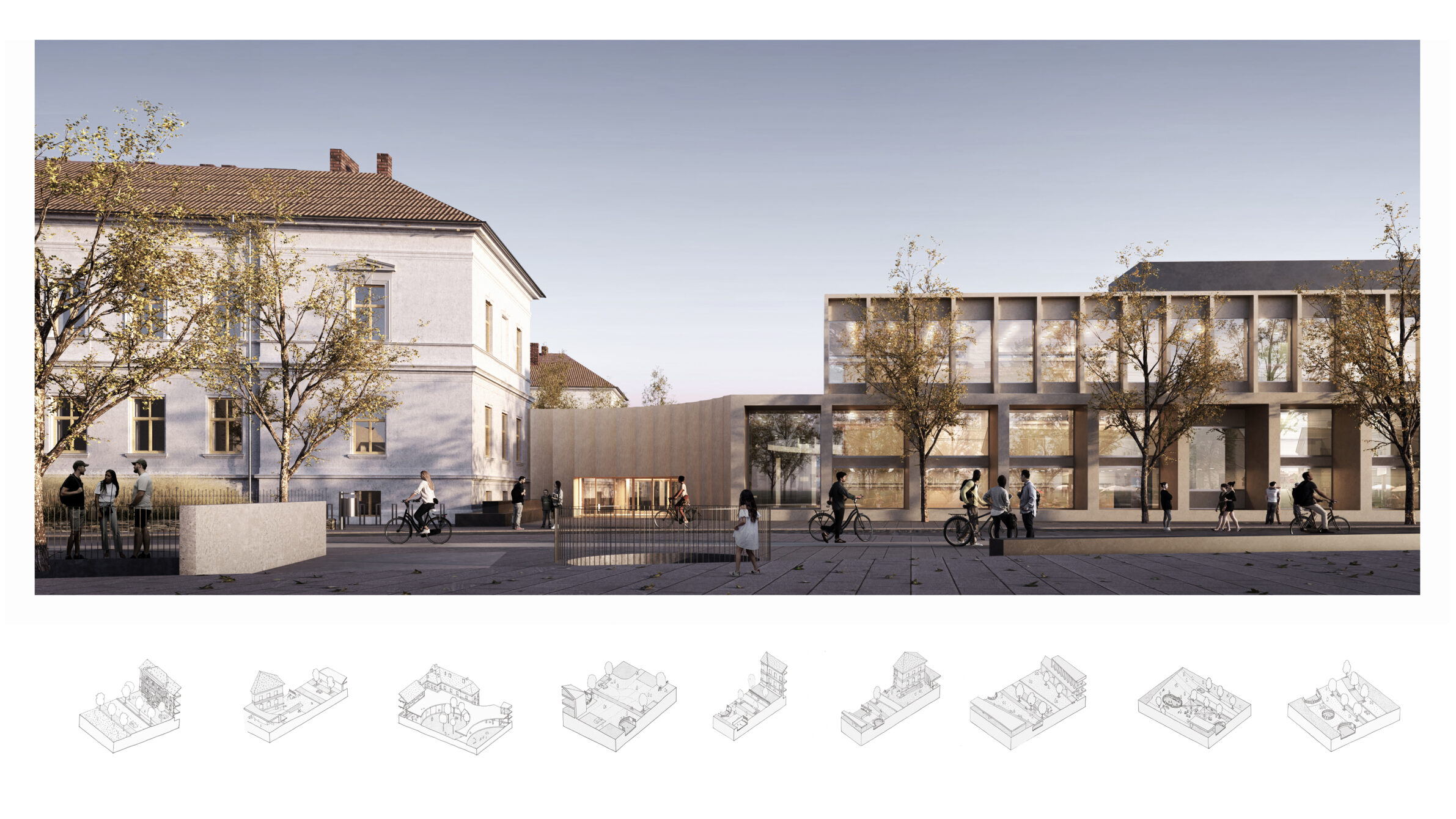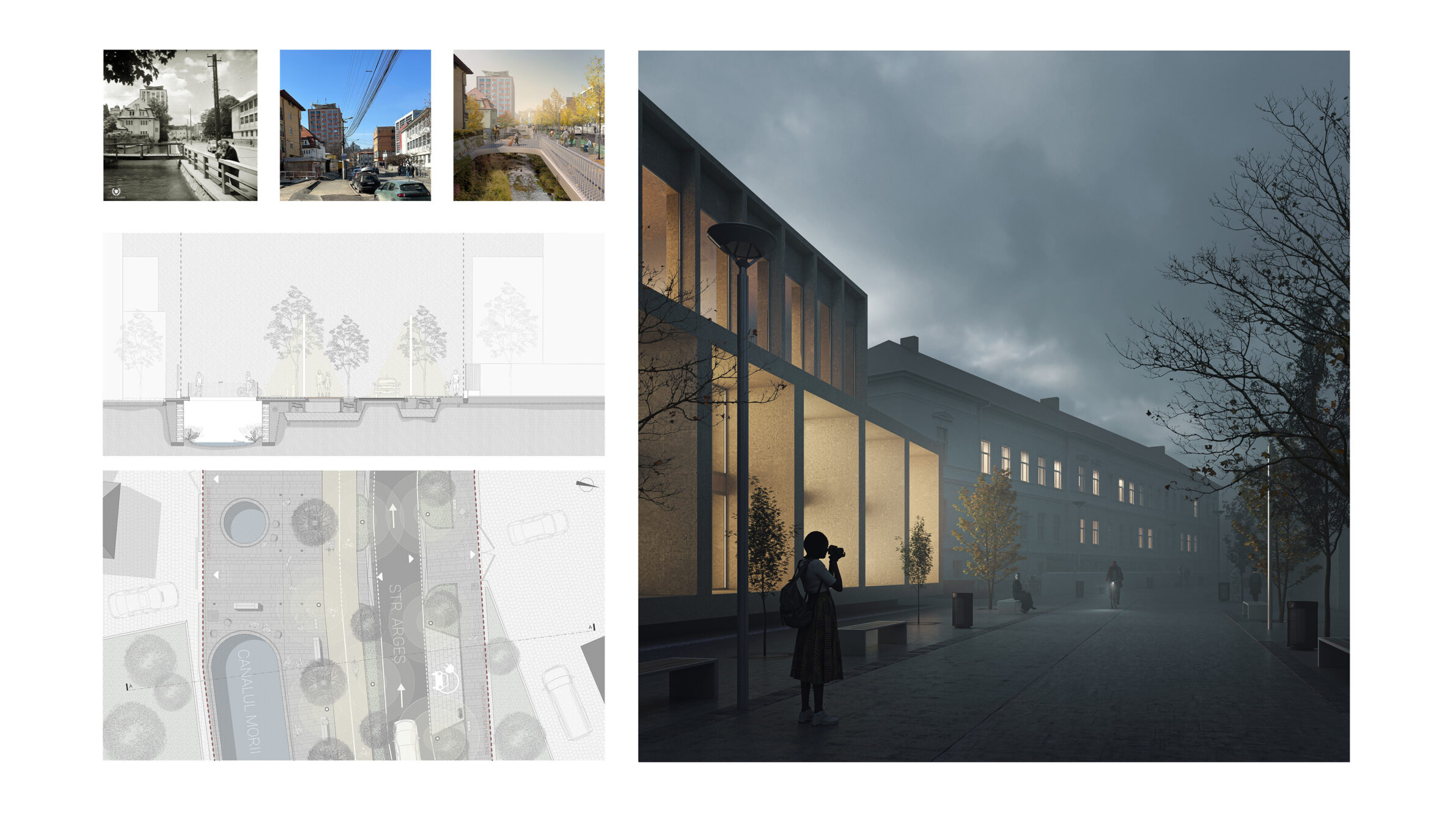 For THEssential Office, this was our first major competition win, an essential launchpad developed with SQM Architecture and Filip’s Concept, where shared beliefs became a coherent architectural statement. We propose that a school in the heart of the city needs a heart of its own. The project strengthens the historic building and inserts simple, compact new volumes that reshape the street fronts and define a protected, playful courtyard where past and present meet. Along Canalul Morii, the promenade is reactivated through minimal interventions over the uncovered canal, enabling flexible movement on both sides and linking paths at multiple levels. Removing parasitic additions helps reclaim pedestrian space and reduce car traffic. Tree planting along cycling routes buffers the school and recalls historic drainage. Colored precast concrete unifies old and new through a rigorous, tectonic language, balanced by deep façade voids and subtle perforation.