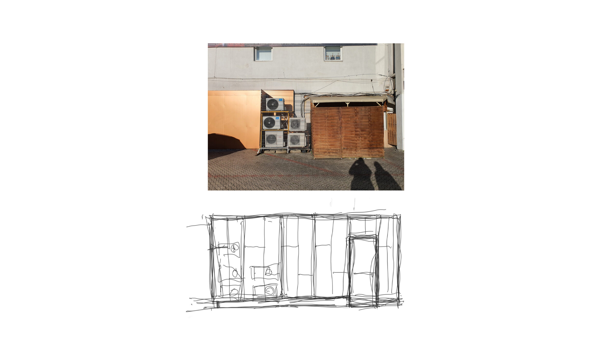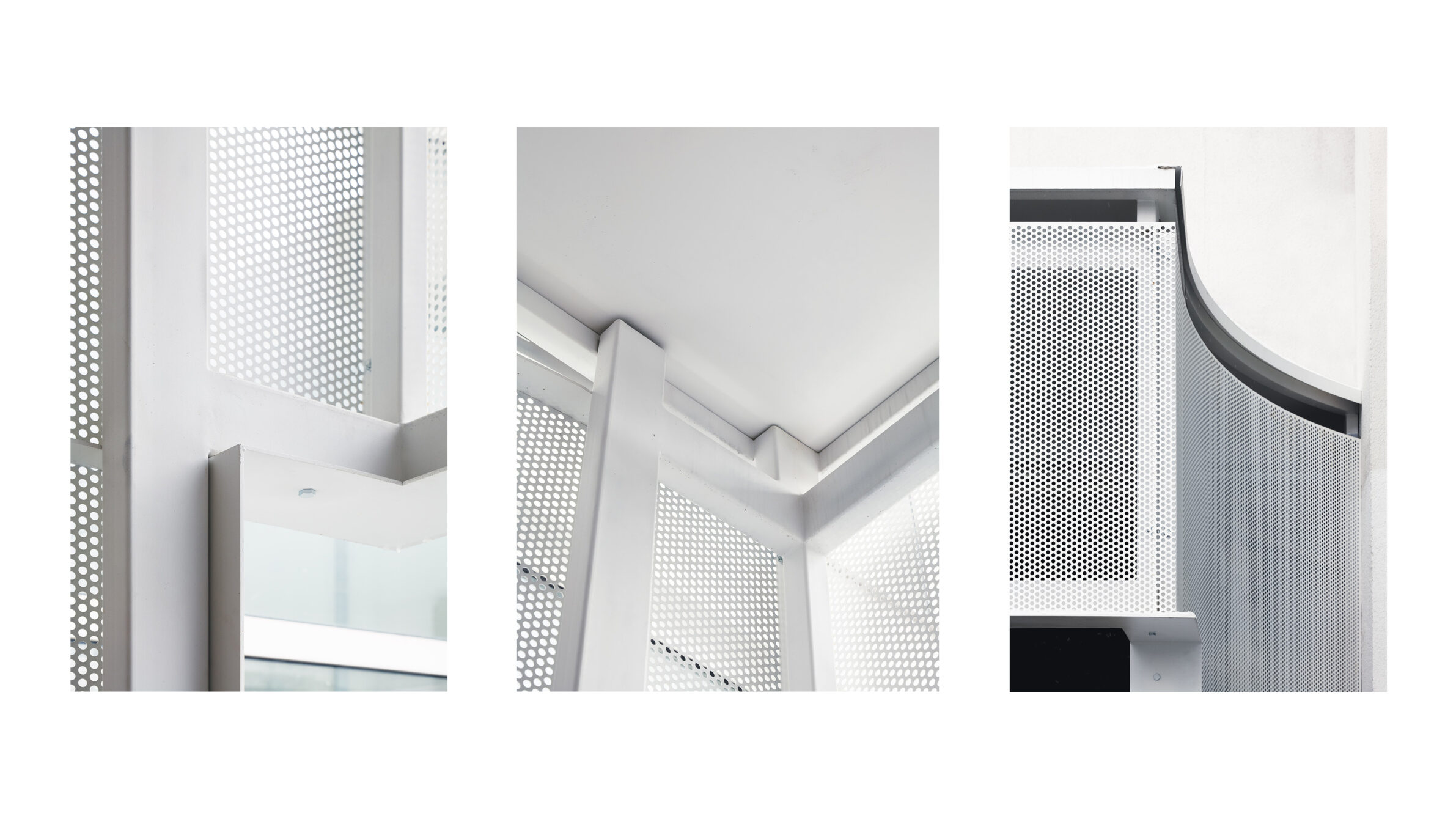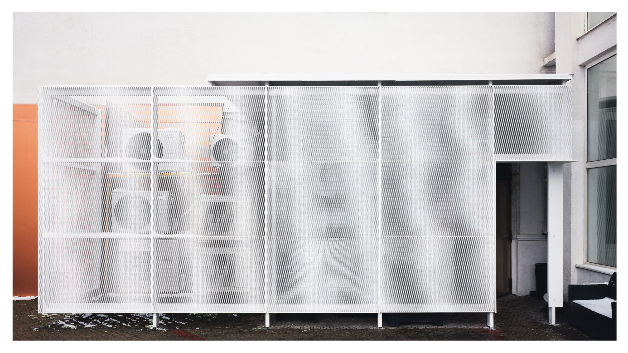 The smoking room was one of our most satisfying projects, thanks to its small scale and the fact that we could closely supervise the execution. It is a compact metal pavilion designed as a space for relaxation and smoking. Conceptually, we aimed for a light, diaphanous structure that still feels protective, providing shade on the south-facing side. The object also brings visual clarity to an area marked by multiple, conflicting languages and functions. Beyond its use as a smoking space, it conceals a series of air-conditioning units placed on the façade and exposed to the public realm. This metal “lace” screens and protects during the day, then opens up at night, softly filtering the light that spills from the interior.