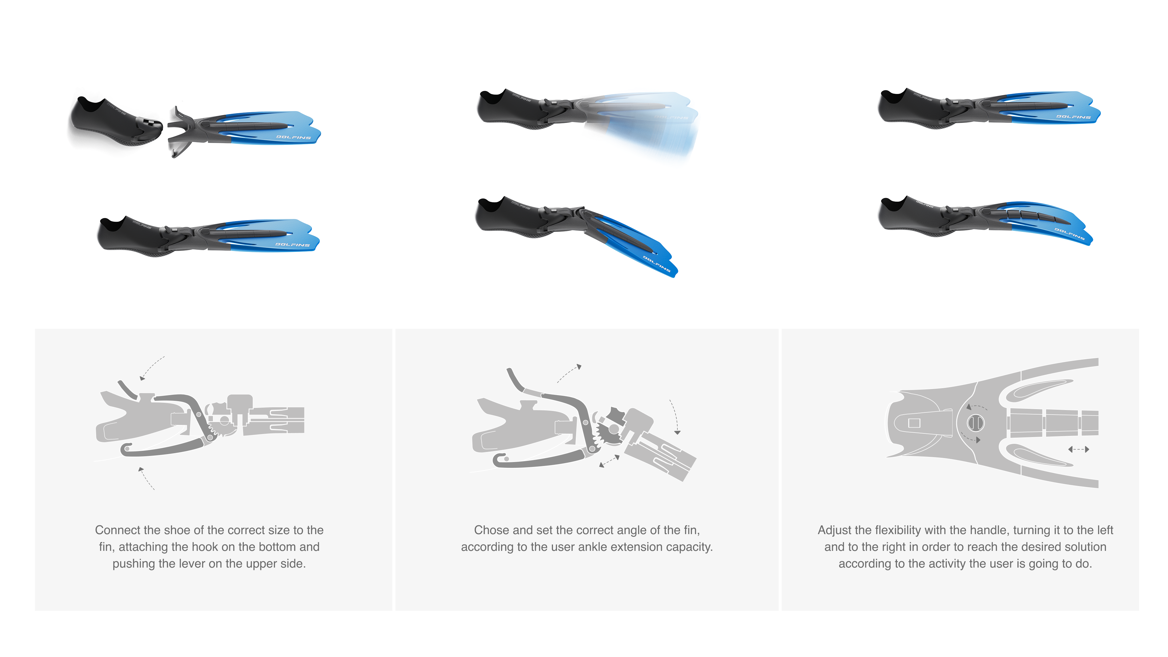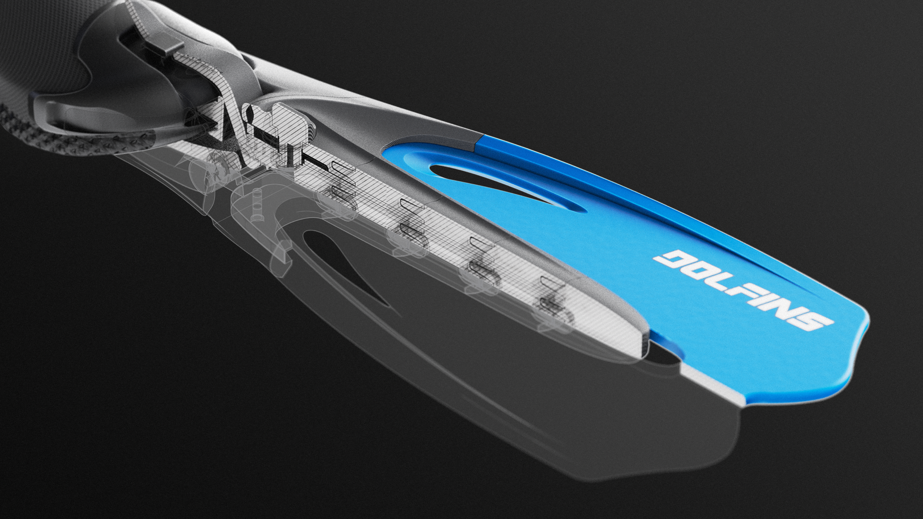 Dolfins revolutionize aquatic sports by introducing customizable fins crafted through MJF printing. With a unique mechanism, users can adjust fin rigidity using a top knob and set fin inclinations, reducing physical strain and enhancing ankle extension. This synthesis of different fin models enables users to tailor Dolfins to their preferences, experience, and physical abilities. The removable boots, adaptable to any size, and interchangeable blades allow versatile configurations. Dolfins’ innovative design streamlines inventory, simplifies maintenance, and offers a dynamic product that adapts to users’ evolving needs. To optimize the product’s potential and exploiting new technologies, Dolfins is designed to be made in a first moment using 3D printing MJF. This creates a "Minimum Viable Product" useful for testing the first user prototypes, collect feedback and financing before moving to a the wider industrial production. Thanks to the Dolfins fins, a single fin can accommodate several users, reducing the need for large inventory and extending the possibility of more people to practice diving activities. The advantage is not only on the plurality of users, but also on the individual: in fact, the possibilities to adjust the fin allow the user to customize it to his liking according to the activity that he is going to perform and his physical performance, which change during the course of the diving season.