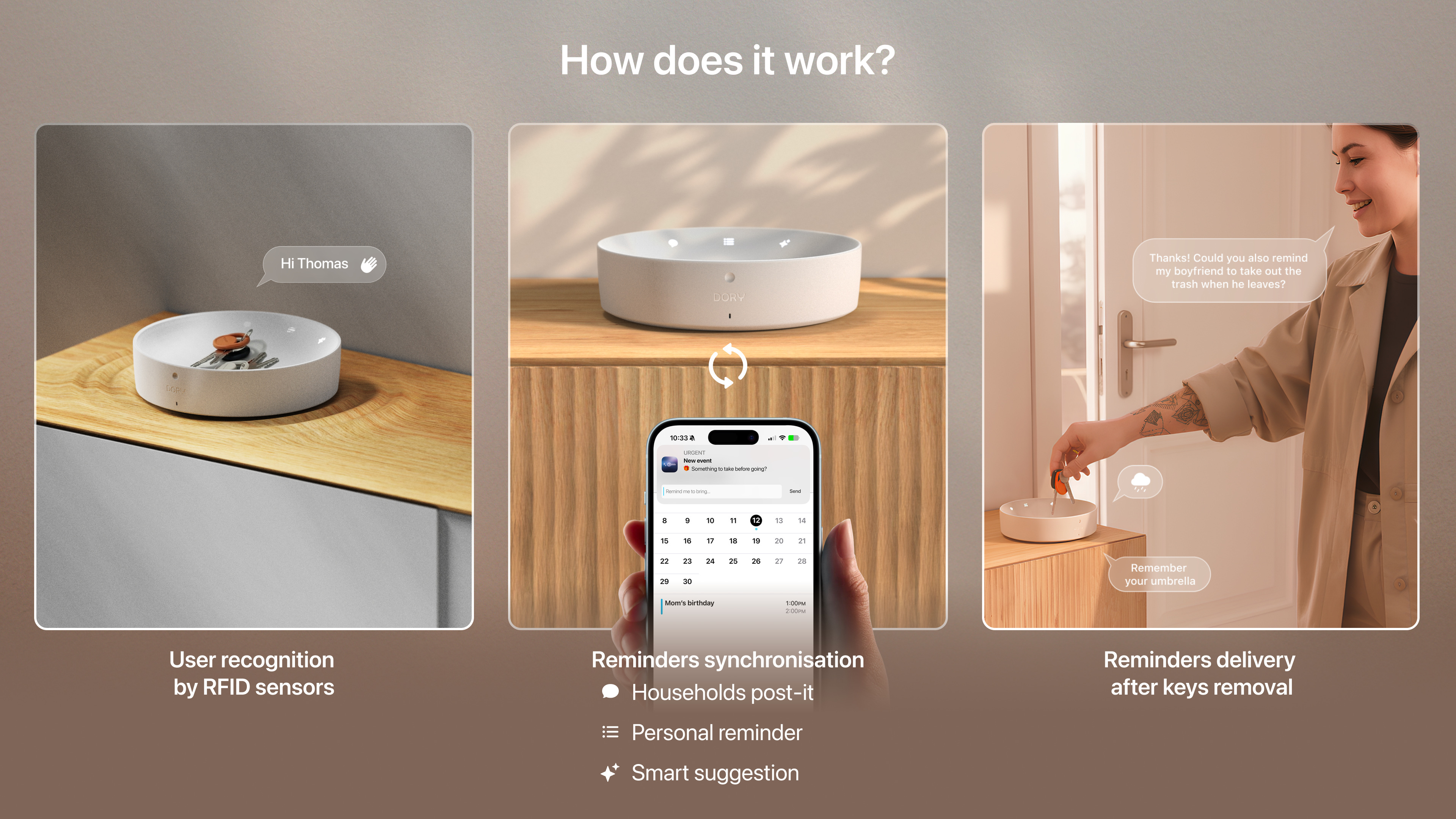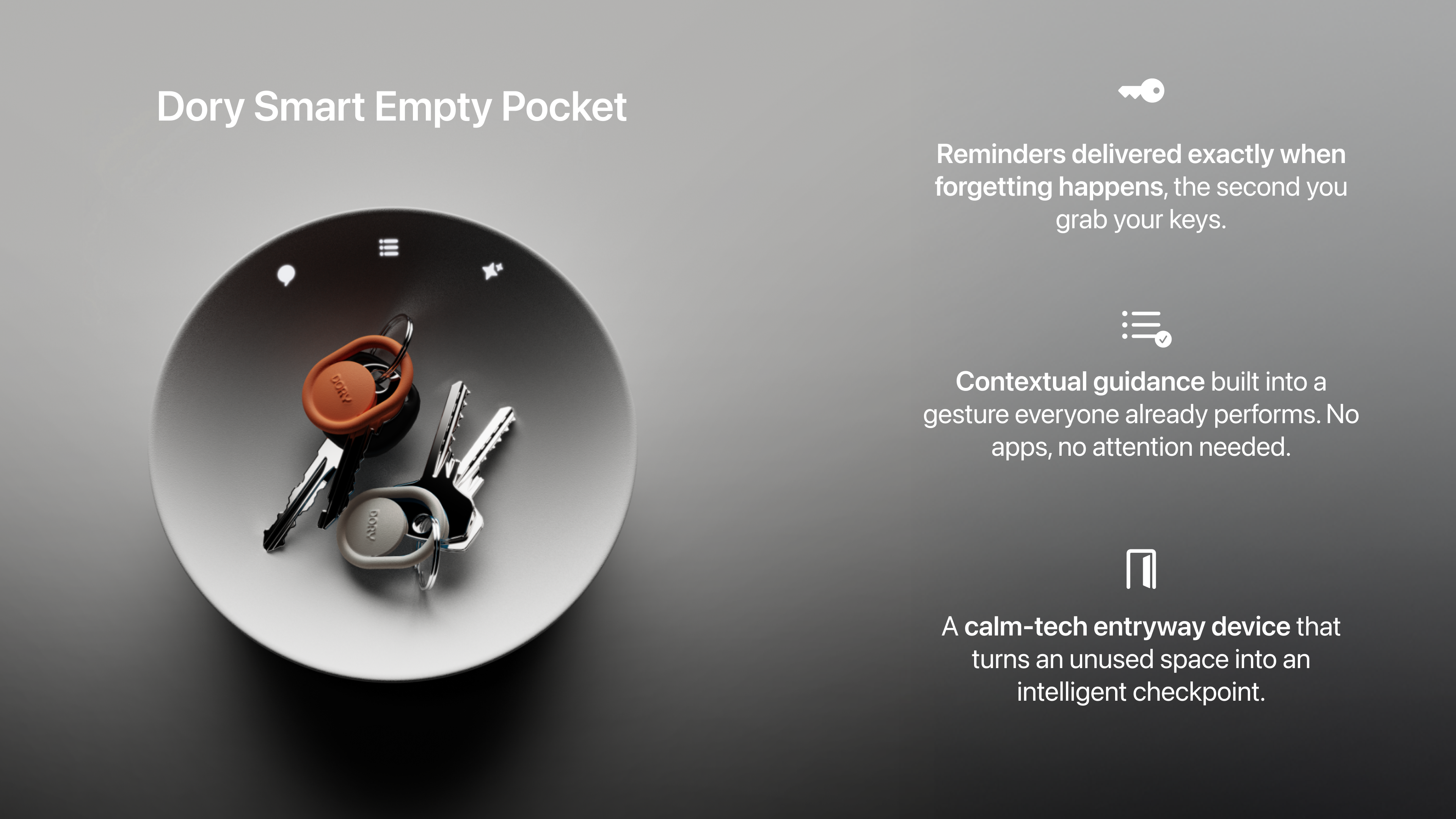 Dory Smart Empty Pocket turns your home entrance into an intelligent checkpoint. The tray detects the natural gesture of placing or picking up your keys, triggering user-specific reminders at the exact moment they're still actionable, before you leave, not after. No ignored notifications, no smartphone dependency: just your existing daily gesture, made smart. Premium design crafted to blend seamlessly into any home environment, with multi-user support, shared messaging and home automation. Invisible technology, immediate value.