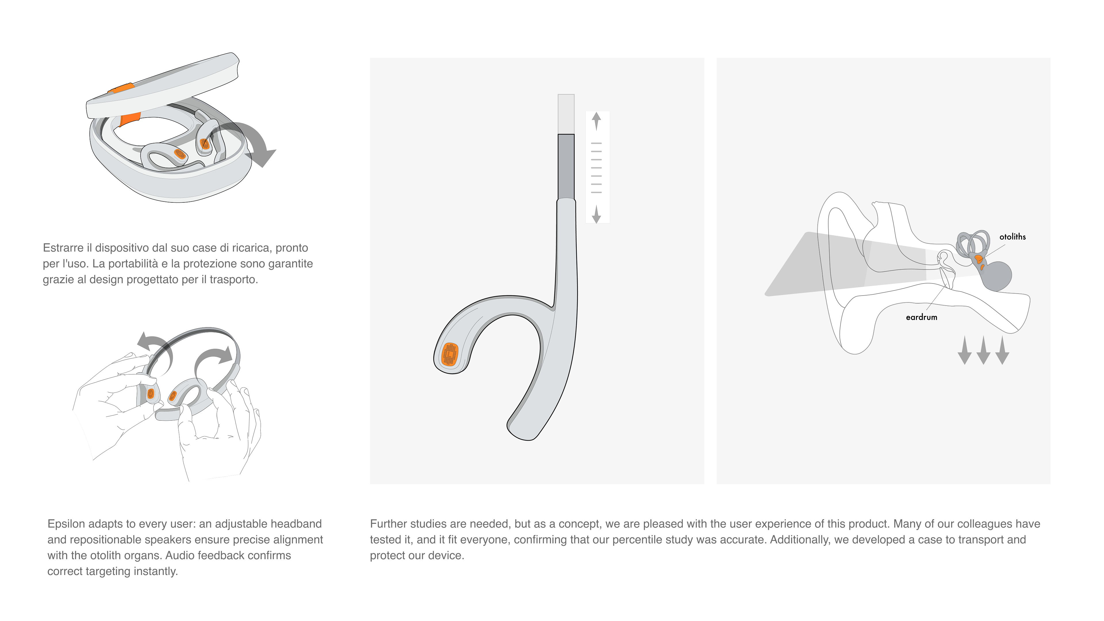 Epsilon is a wearable device designed to reduce Space Motion Sickness in astronauts during microgravity missions. It combines bone conduction and acoustic levitation to counteract nausea at its source, no drugs, no side effects, no distraction from the mission. An ergonomic headband allows precise speaker positioning and adjusts seamlessly to any morphology, maximizing comfort in zero-gravity conditions. Where the human body meets the limits of space, Epsilon restores balance. Invisible technology, mission-critical performance.