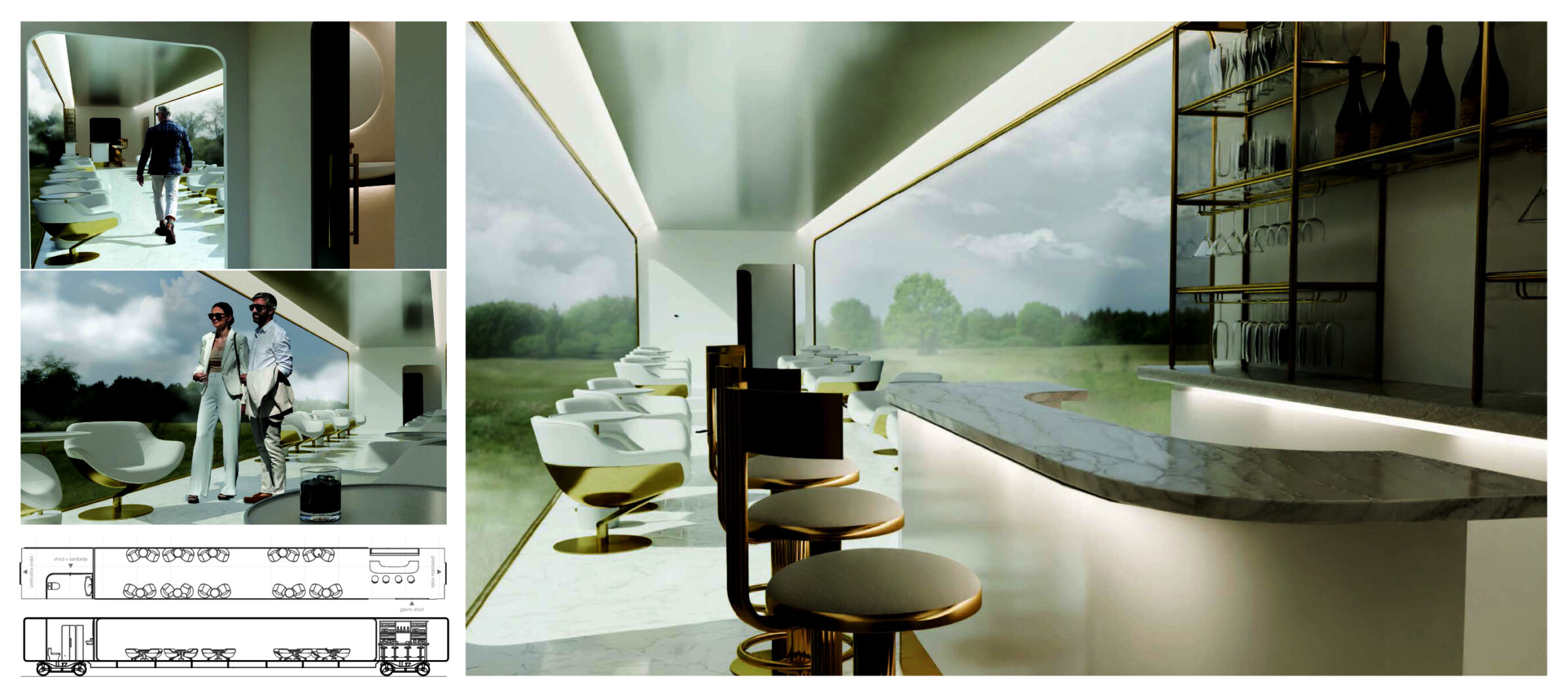The exterior concept is directly linked to the programme of the flexible train composition and the interior design of individual carriages, interpreted as different hotel spaces. Sleeping carriages function as hotel rooms, while programme-specific carriages serve as shared spaces for hospitality, wellness, recreational, and cultural activities. Interior design focuses on privacy, functional efficiency, and comfort within limited spatial conditions, using modular, sustainable, and carefully selected material solutions.
