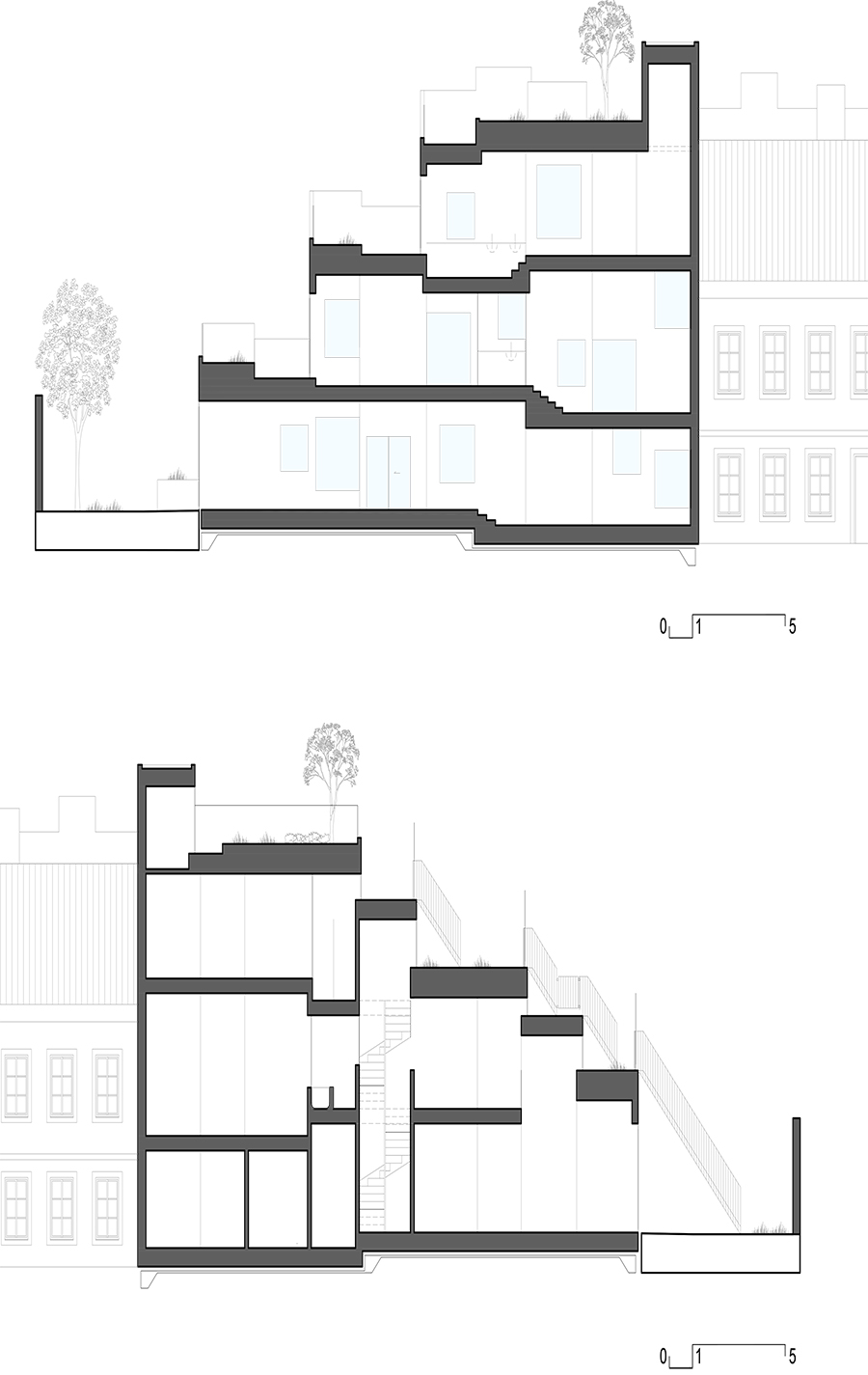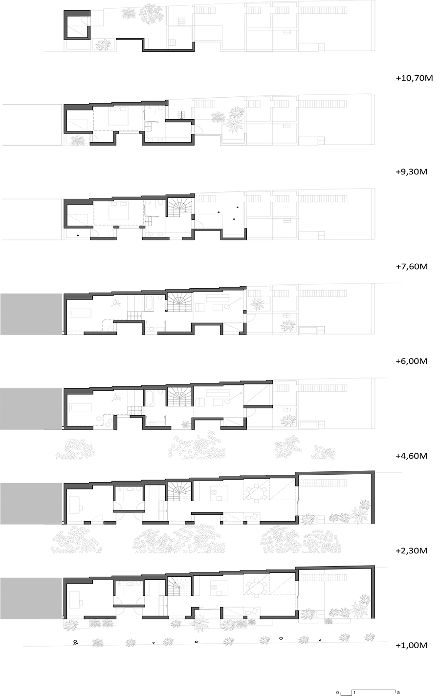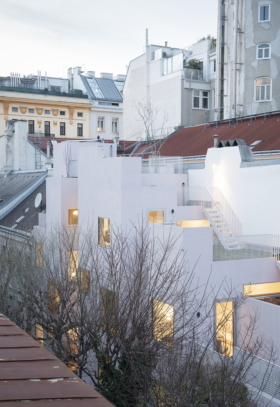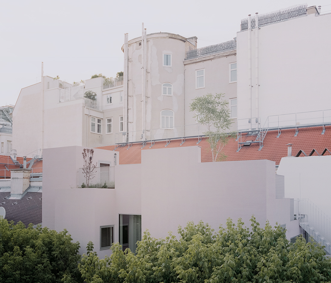 As a limited quantitative resource, urban land must be efficiently re-used through qualitative densification. The Townhouse Neubaugasse project suggests a fundamental reconfiguration of architectural typologies, incorporating the unbuilt as an integral part of the built structure which results in critical articulation of the entire arsenal of architectural elements. The project is conceived as a hybrid genesis on 12 levels and 16 varying room heights between house and garden.